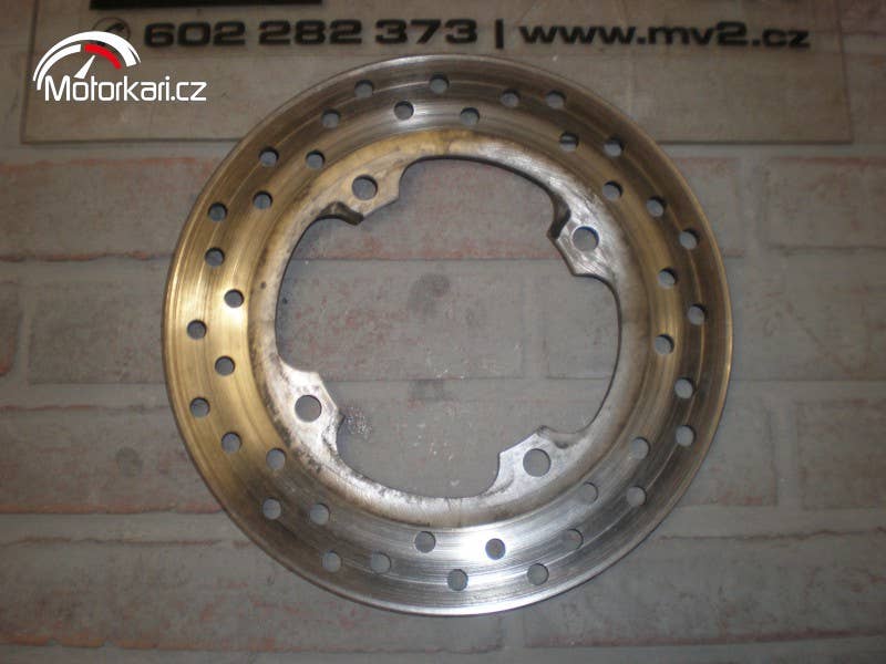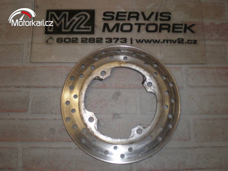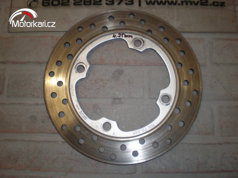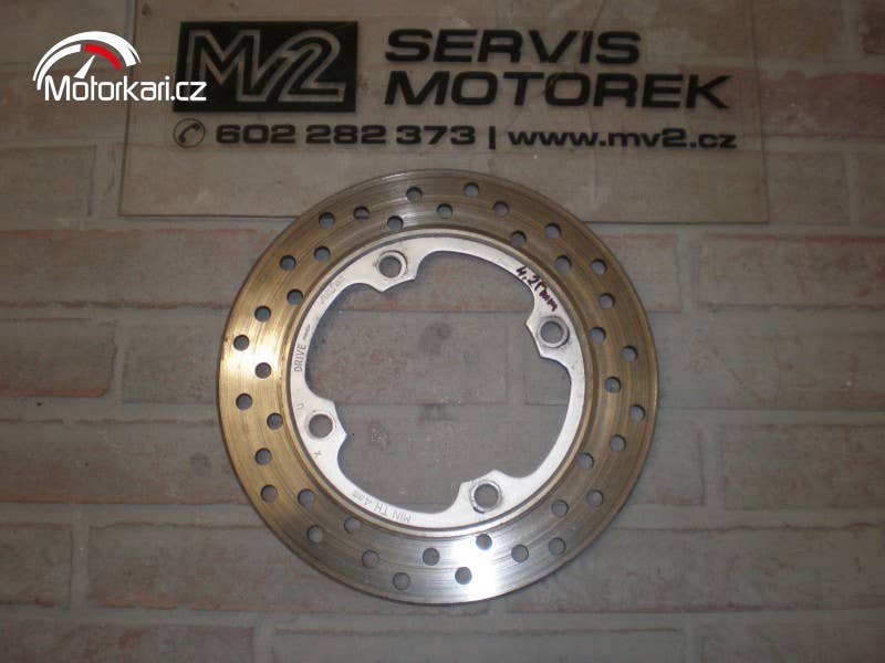 zadní brzdový kotouč, dost sjetý, nicméně ještě použitelný, 4,25mm.( inzerát je aktuální, prodané díly ihned mažeme, pro bližší info používejte pokud možno e-mail, děkujeme za pochopení! MV2 moto)