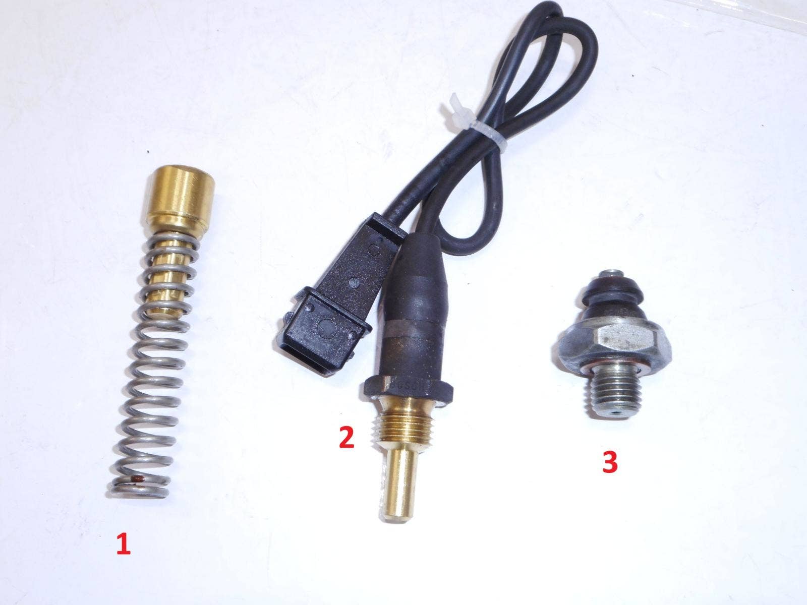 Cena je za olejový termostat č. 1. Čidlo teploty č. 2 je za 250, Kč. Čidlo tlakové olejové č. 3 stojí 290, Kč. Díl pochází z motocyklu BMW R 1100 RT. r. 1998, typ motoru 112 EA. Při použití na jíný model ověřte před objednáním kompatibilitu. Ilustrační foto v popisku.