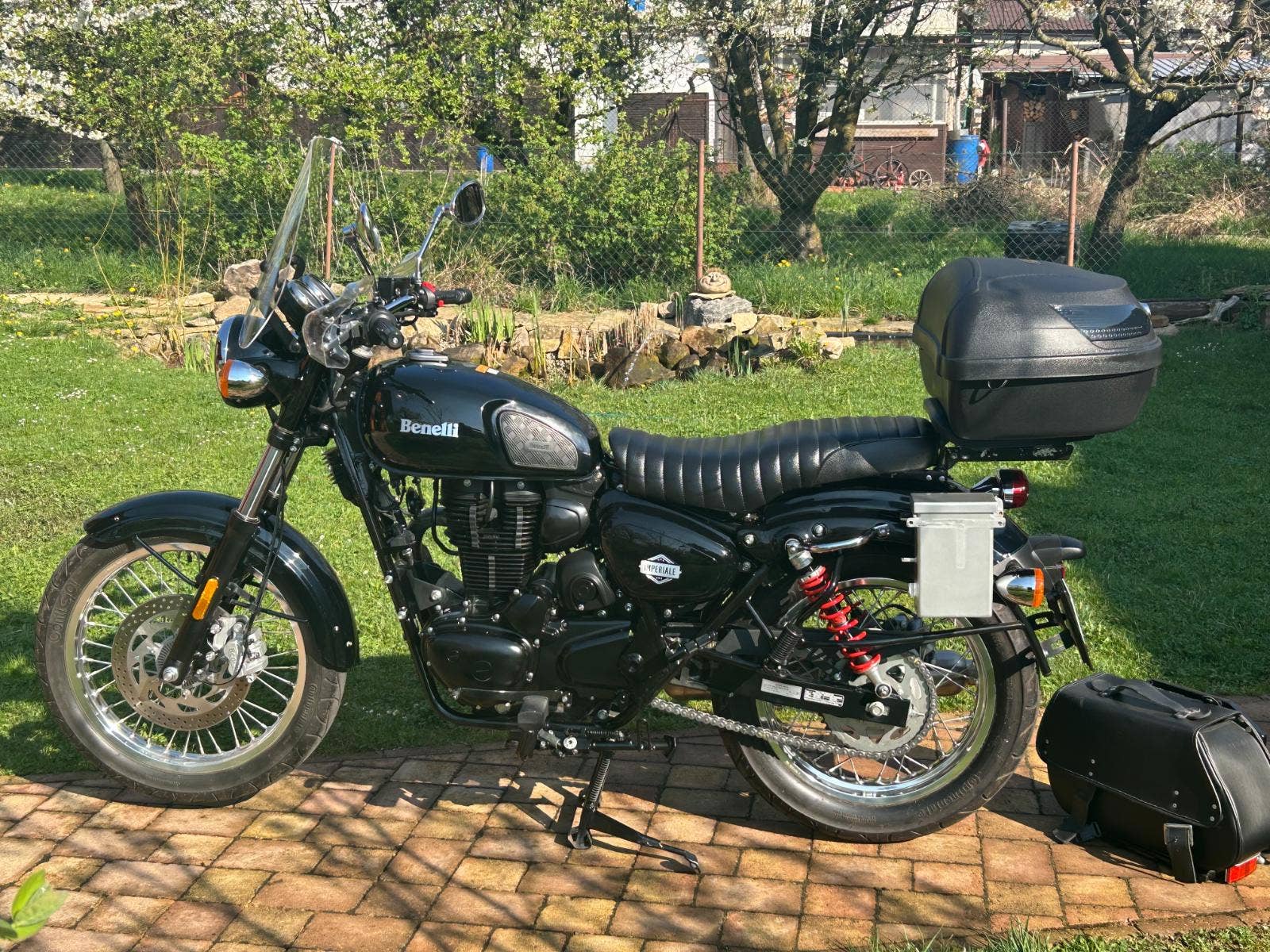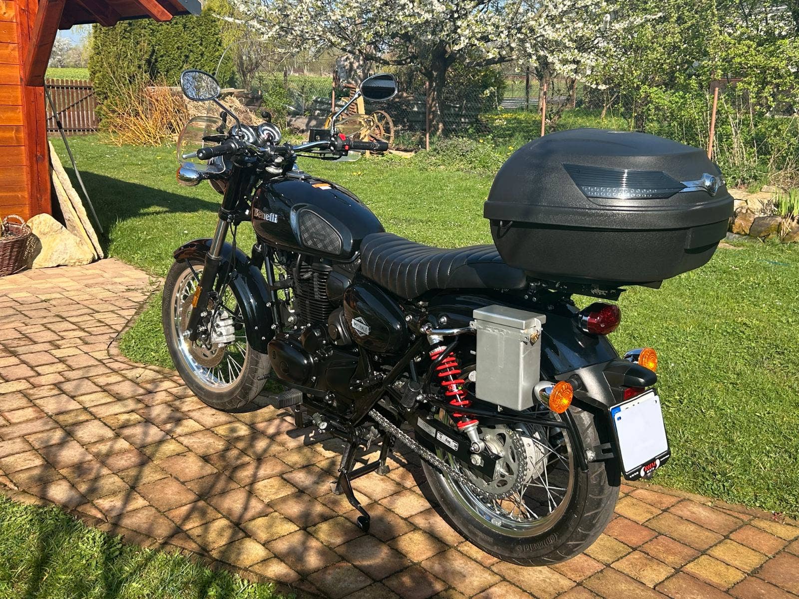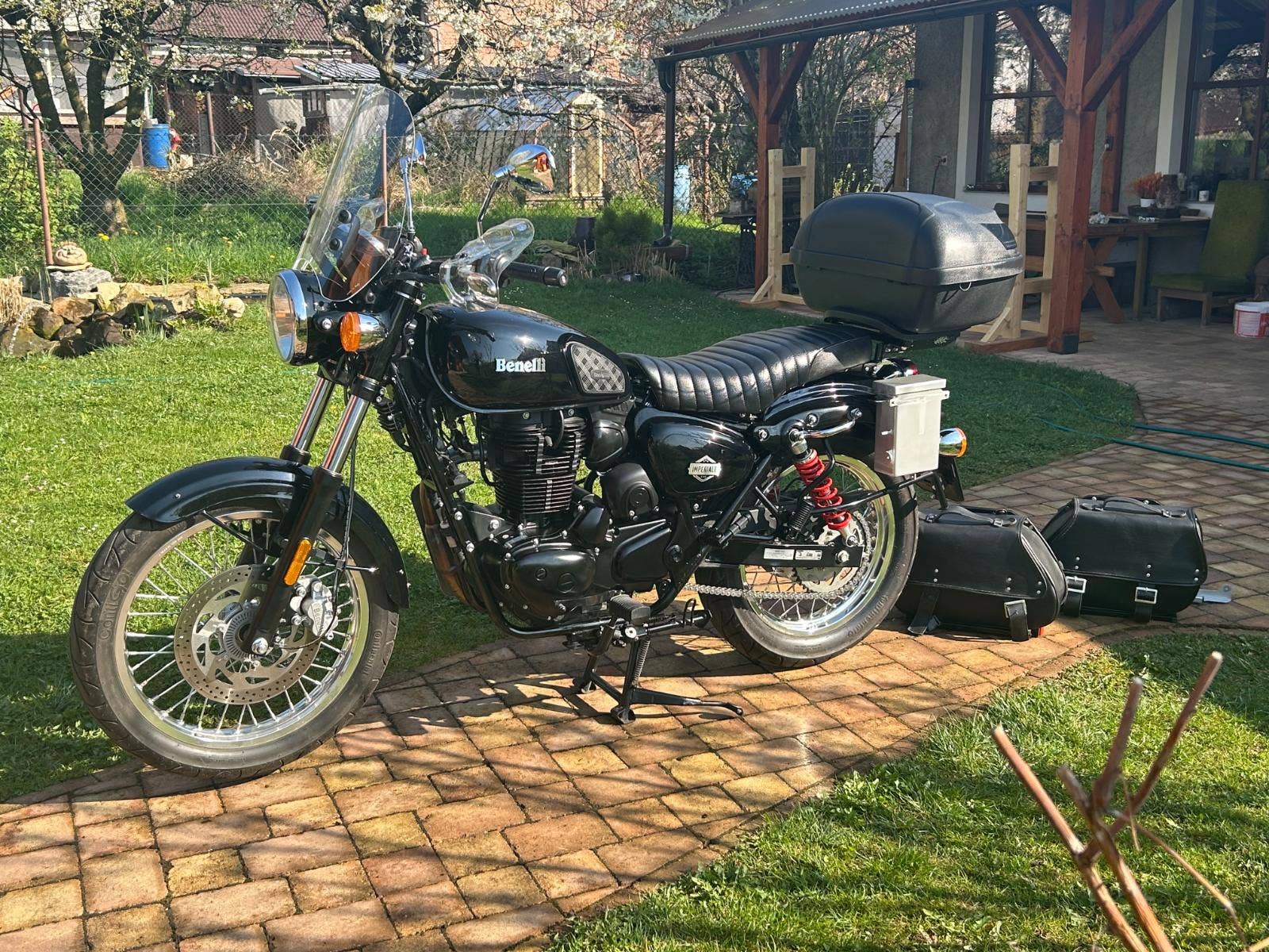 Nabízíme Benelli Imperiale v pěkném stavu, po servisu u nás. Malý nájezd km, původ ČR, s velkým množstvím doplňků: vyšší plexi, blastry, nosič a kufr, boční brašny, nastavitelné zadní tlumiče YSS, přídavné stupačky.