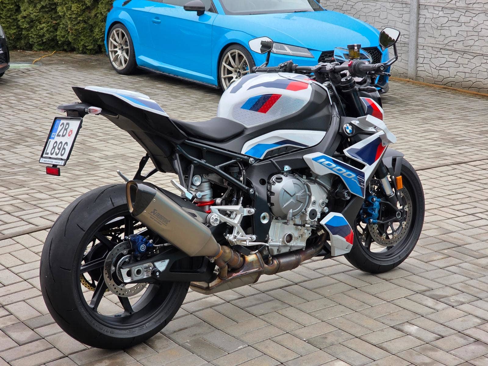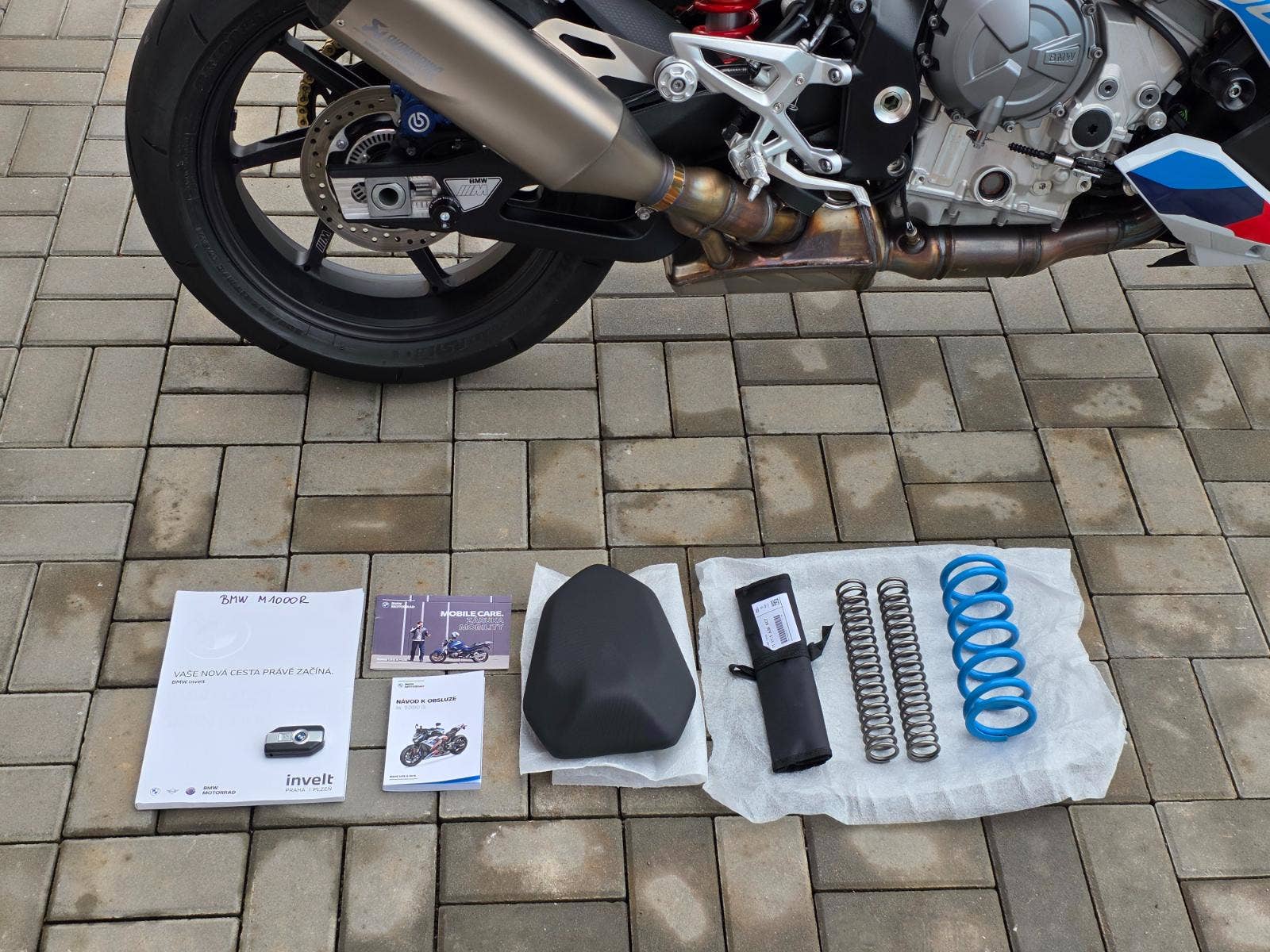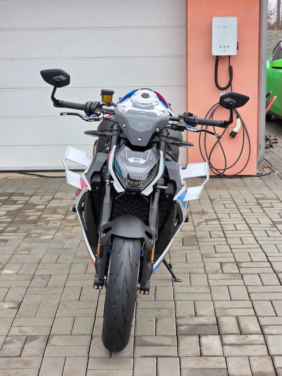 Prodám BMW M1000R, rok výroby 2024, najeto pouze 1.425 km, výkon 154 kW (210 koní), objem motoru 999cm3, STK platná do 8/2030. Motorka zakoupena u autorizovaného prodejce BMW Invelt Praha, pravidelný servis v BMW Renocar Brno. Jeden majitel. První servis po zajetí a druhý servis 9/2026 v 1.424 km takže připraveno na sezónu. V plné tovární záruce do 8/2029. Celkově motorka ve stavu nové, nehavarovaná, nelakovaná, neodřená, ještě originál fólie na displeji. Ve výbavě titanový výfuk Akrapovič, quickshifter, el. tlumiče Marzocchi, M brzdiče Nissin, nastavitelný tlumič řízení, nastavitelné jízdní režimy, nastavitelná trakce i ABS, tempomat, vyhřívané rukojeti, nastavitelné lámací M páčky, LED světla i blinkry. Navíc oproti základní výbavě paket sedačky spolujezdce, sportovní štítek, kryt sedačky spolujezdce, prodloužená záruka na 5let, taška na nádrž s podkovou SW Motech (4.000Kč), padací protektory Rizoma (5.000Kč), boční polep nádrže protiskluzový (1.500Kč), kryty chladičů BMW (1.500Kč), pružiny přední a zadní pro 110Kg jezdce, originální pružiny na cca 80Kg k motorce (19.000Kč). Celková původní cena motorky včetně doplňků 625.000Kč.