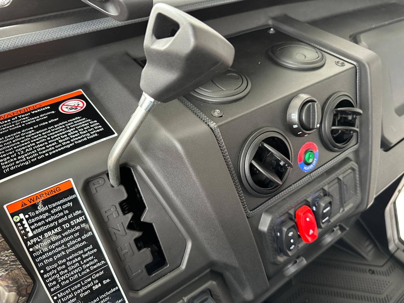 Převodovka: Automatická CVT – variátor / uzamykatelný přední diferenciál / automatický zadní samosvorný diferenciál Eaton (100% svornost) / převody P/R/N/H/L (parkovací/zpětný chod/neutrál/rychle vpřed/terénní redukce)