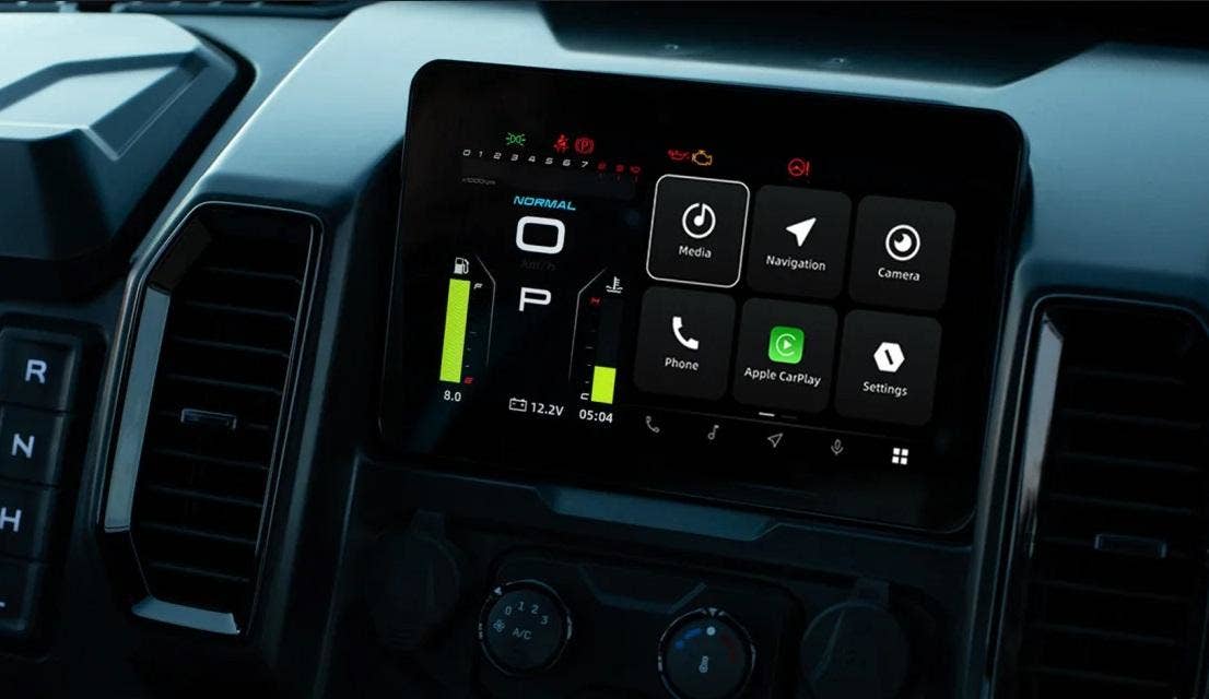 Dominantou palubní desky je 8“ MMI dotykový displej s bohatou nabídkou funkcí, audiosystémem a možností OTA aktualizací softwaru přes aplikaci CFMOTO RIDE (volitelné). CFMOTO KONEKTIVITA (T-Box) poskytuje data o vozidle v reálném čase a navigaci MotoPlay.