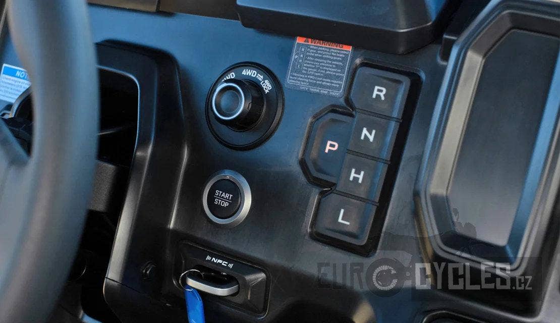 Převody: P/R/N/H/L (parkovací/zpětný chod/neutrál/rychle vpřed/terénní redukce)