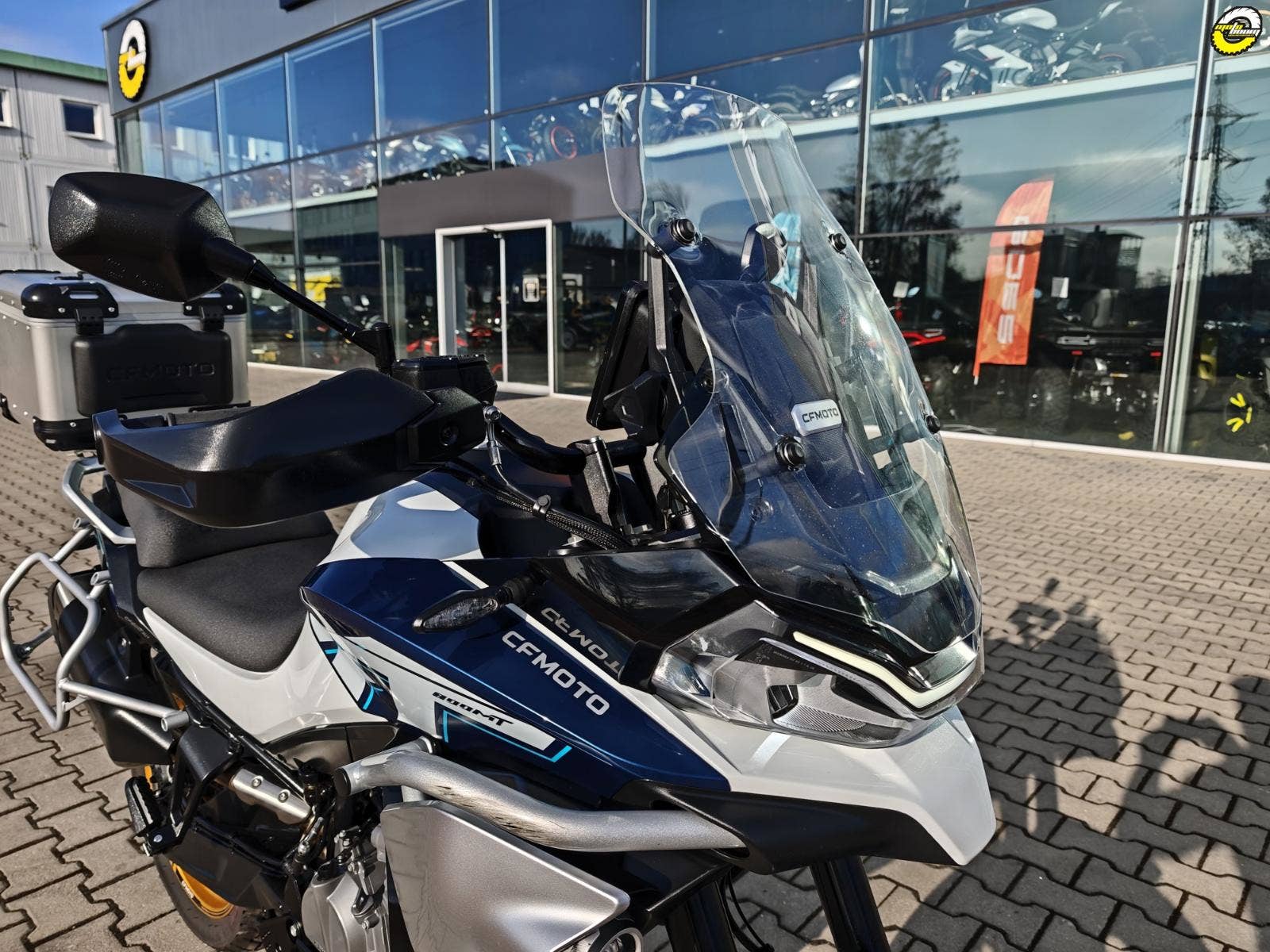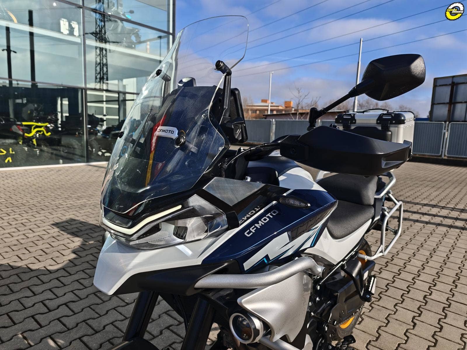 Zavazadla: Namontován originální zadní BOX CFMOTO + nosiče bočních kufrů (připraveno na expedici).