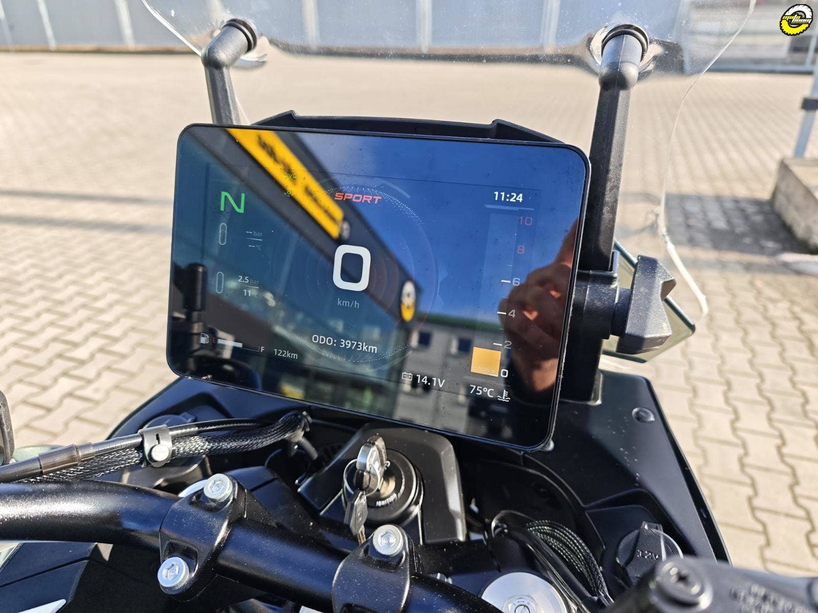 Barevný TFT displej s úhlopříčkou 7″ pro zobrazení všech jízdních údajů. Při párování mobilního telefonu umožňuje správu hudebního přehrávače a telefonního seznamu. Zobrazuje navigační pokyny z aplikace CFMOTO Ride a jízdní režim.