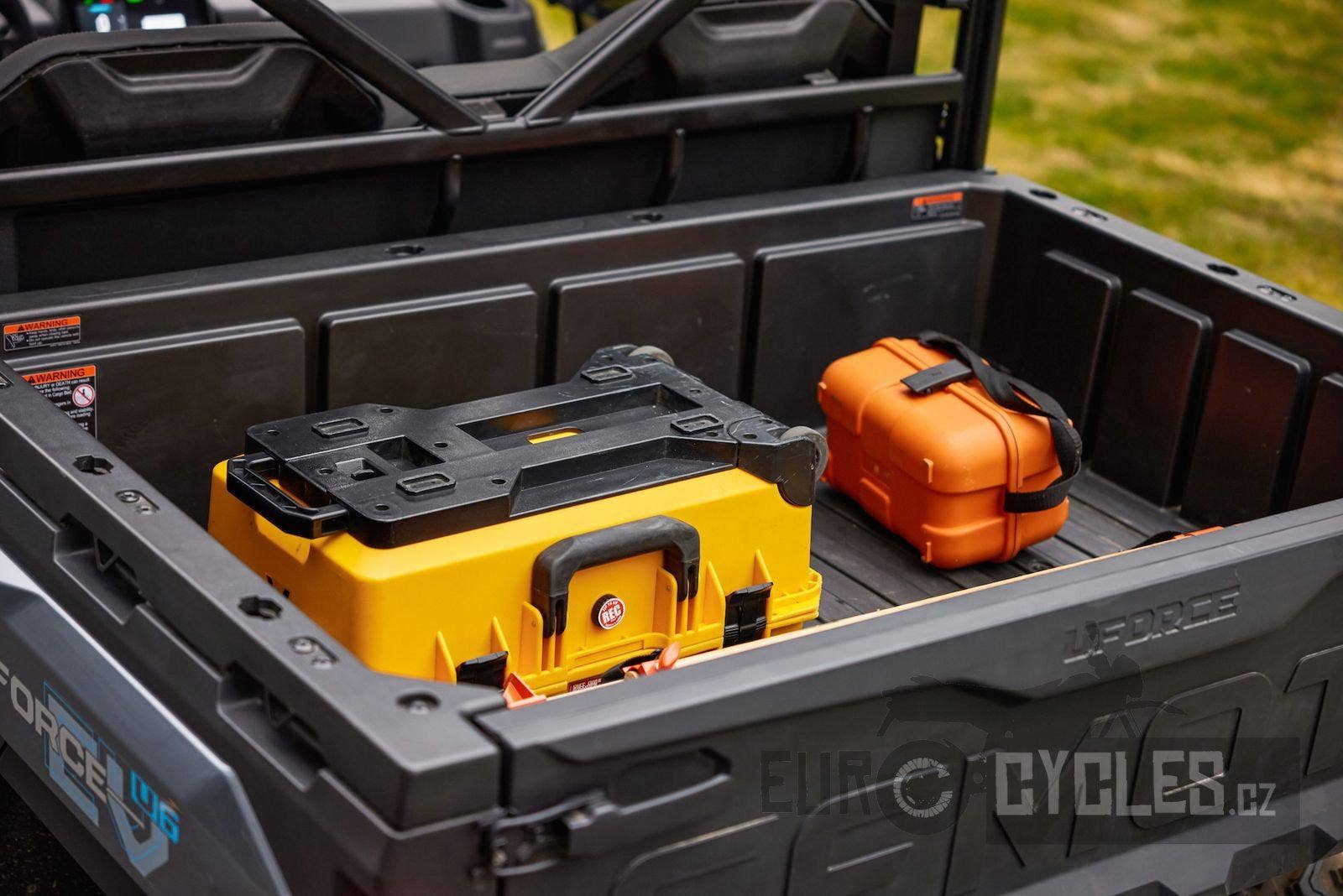 Korba je výklopná, umožňuje nástavbu bočnic nebo jiného příslušenství rychlosystémem CF-Connect