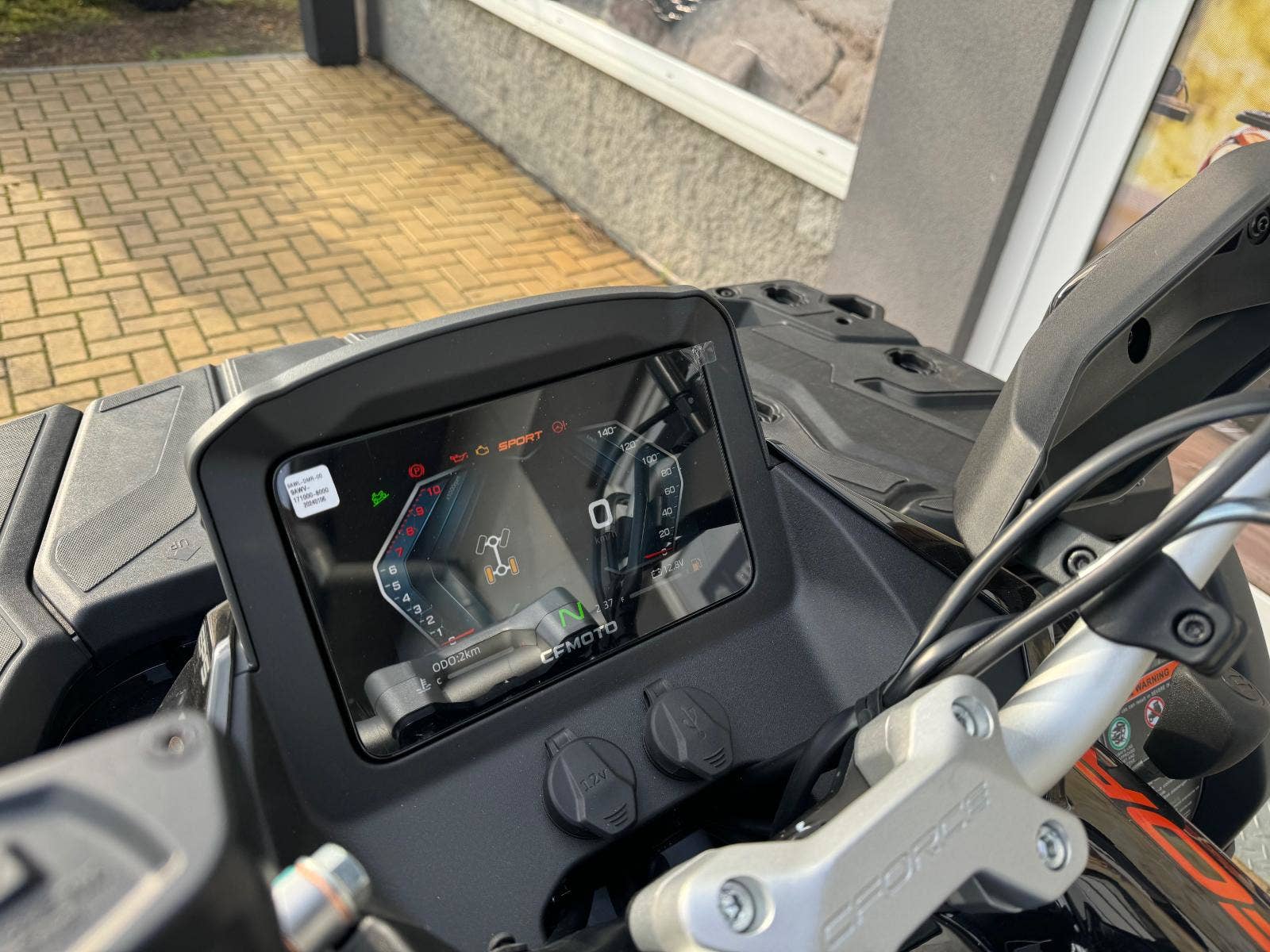 T-Box (volitelné) umožňuje propojení s chytrým telefonem přes aplikaci CFMOTO RIDE, což znamená okamžitý přístup k palubním údajům v reálném čase např.: množství paliva, stav baterie, záznam o jízdě, samodiagnostika vybraných základních funkcí před jízdou.