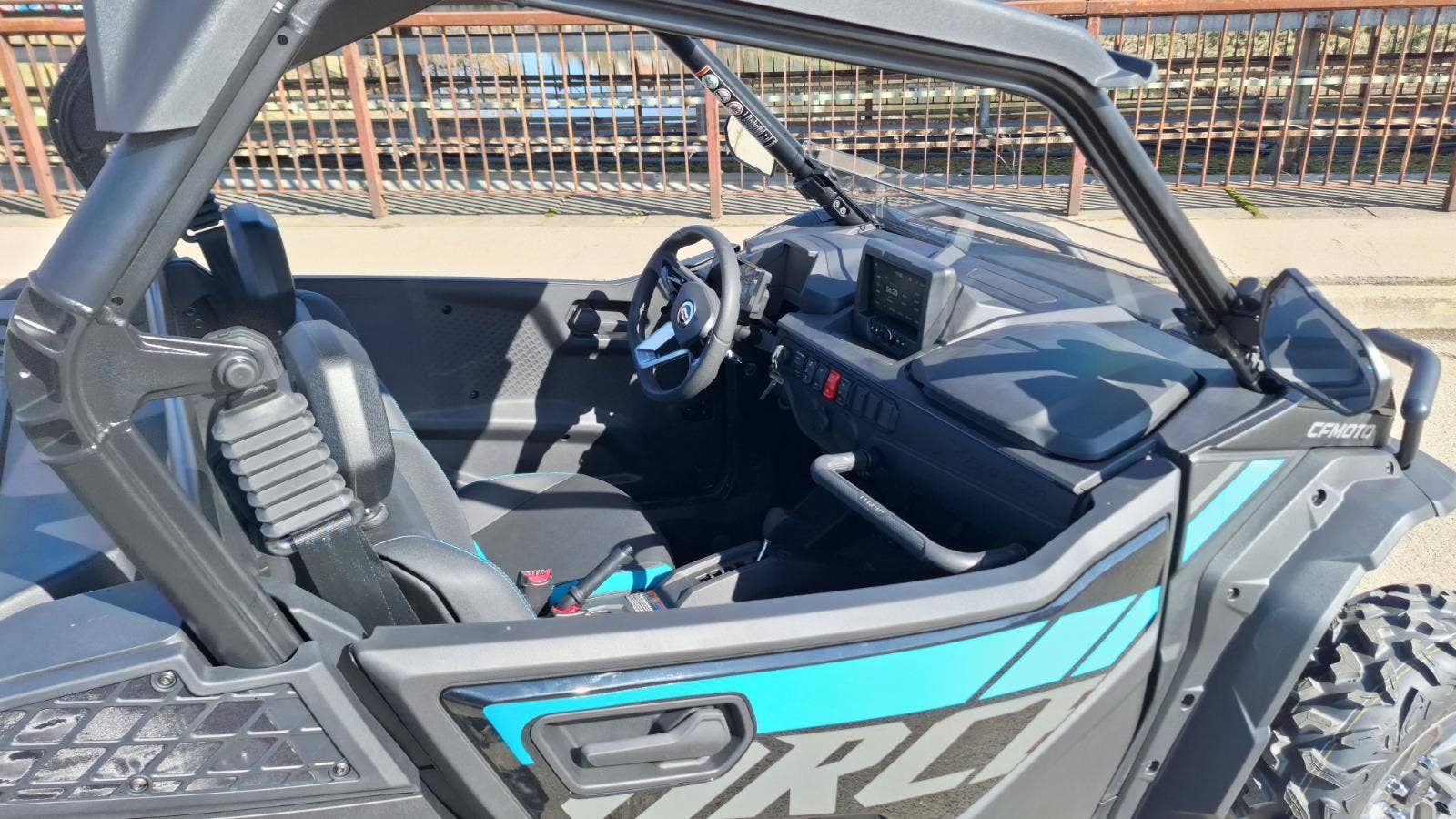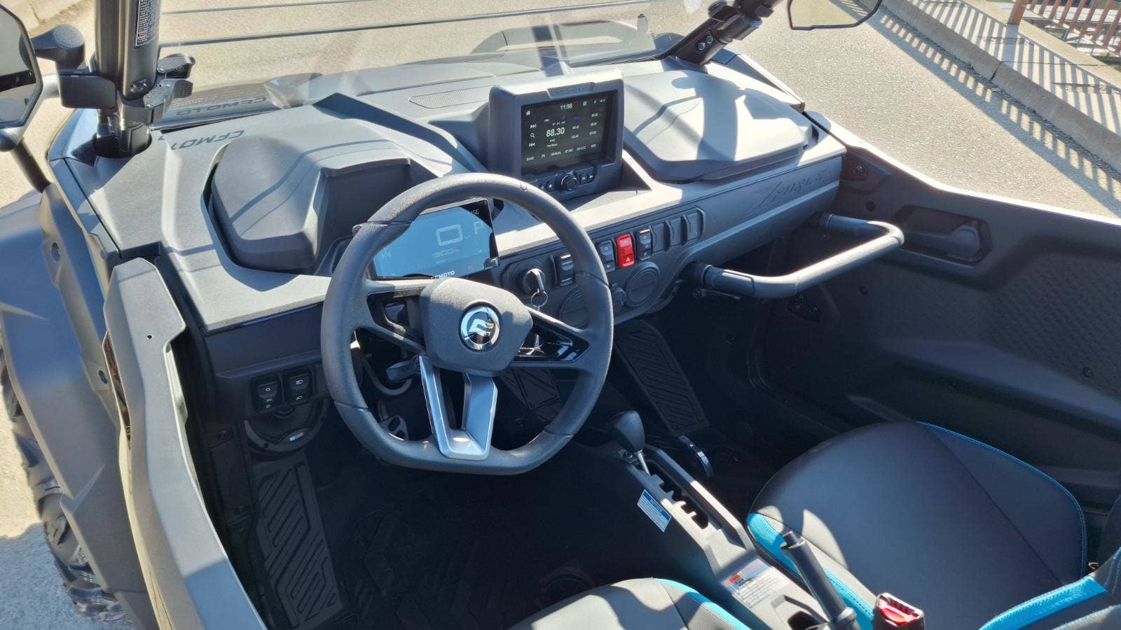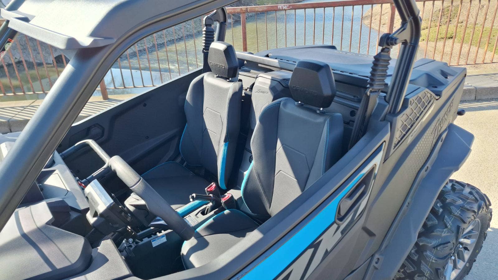 Nastavitelný sportovní volant (35°), posuvné sedadlo řidiče (±95 mm), přehledný 5" LCD displej a dvě voděodolné schránky (15 + 3 l). Madlo spolujezdce vysouvatelné s rychloupínacími sponami.
