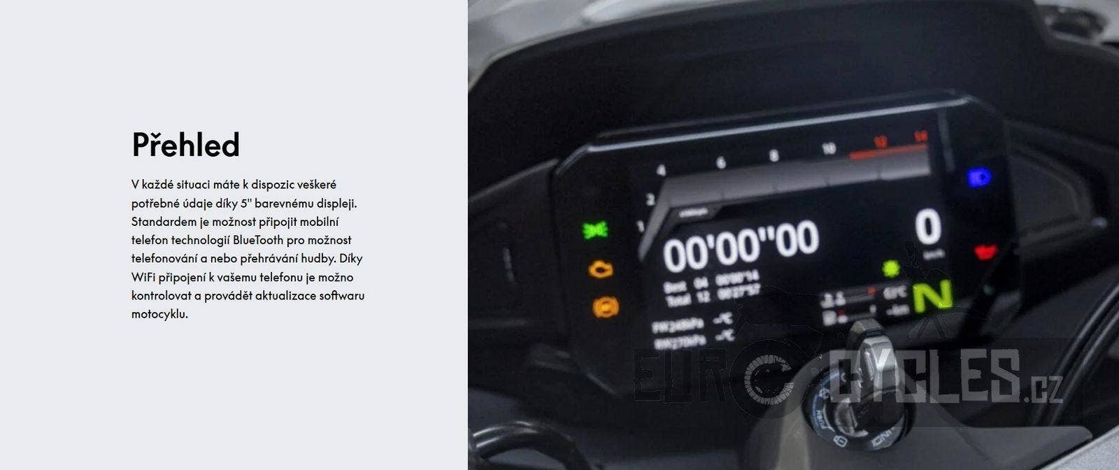 Standardem je možnost připojit mobilní telefon technologií BlueTooth pro možnost telefonování a nebo přehrávání hudby. Díky WiFi připojení k vašemu telefonu je možno kontrolovat a provádět aktualizace softwaru motocyklu.