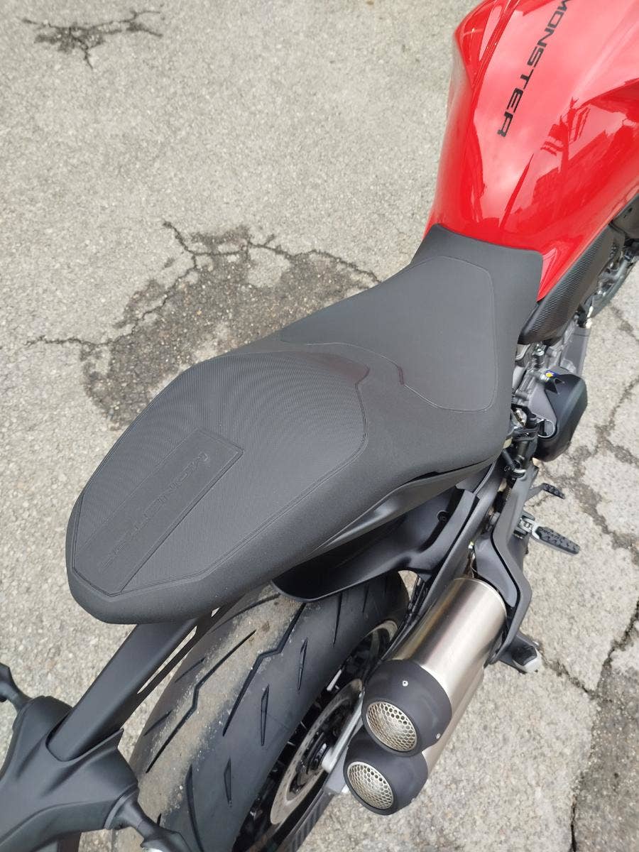 Monster + s lakovaným krytem sedla spolujezdce zdůrazňuje čisté linie a vytváří siluetu jednomístného stroje. Praktický štítek doplňuje výbavu této verze.