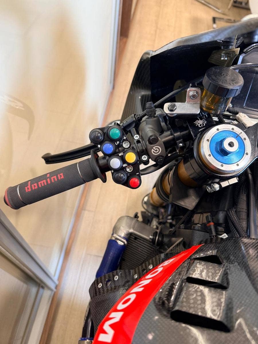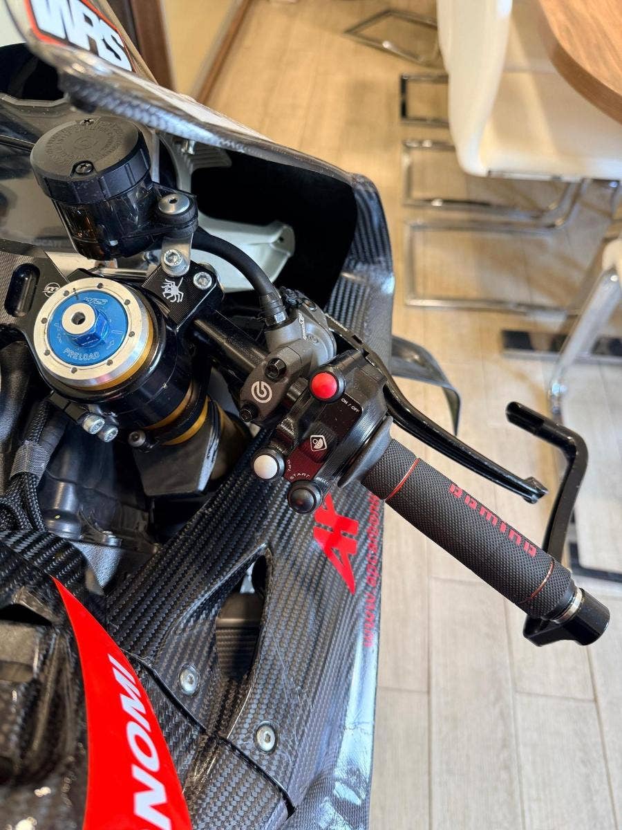 Výfuky Akrapovic downward exhaust OEM komplet titan DTC EVO 3 slick režim Kryty alternátoru + motoru, budíků, rámu, kyvné vidlice od Spider Racing resp karbon. Řídítka+ brýle, stupačky… Spider Racing Kovaná kola OZ Gass RS titanové barvy vč. Brembo T Drive kotoučů 330mm Podvozek předělaný z elektroniky na manuální Ohlins Závodní velký SBK chladič Febur komplet s hadicema Jetprime frézované ovladače, vlevo + vpravo + spínačka Zadní podsedlový rám Pierobon STK Karbonové kapoty AP carbonline.