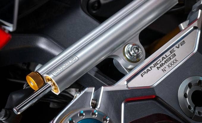 Podvozek Panigale V2 MM93 je racing ready - 43mm plně nastavitelná vidlice Öhlins NIX30 a tlumičem Öhlins doplňuje tlumič řízení stejné značky. Nízko umístěná řídítka zdůrazňují sportovní styl motocyklu. Motocykl je vybaven brzdovými třmeny Brembo M50 s kontrolovanou odezvou. Nová jsou kovaná kola, o 2 kg lehčí než litá. Pneumatiky Pirelli Diablo Rosso IV, 120/70 vpředu a 190/55 vzadu, na okruh může být vybaveno zadním slickem 190/60.