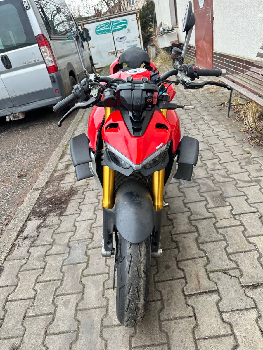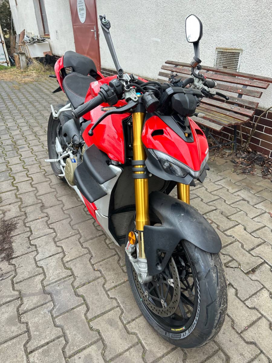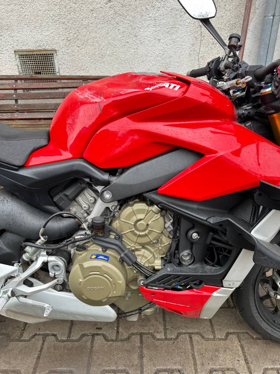 Ducati Streetfighter v4s, 2022, najeto 12tis km, havarovaný viz foto - nádrž, řidítko, zrcátko, uchycení podsedla, sedačka, motor běží, podvozek ok, nové pneumatiky, možnost úvěru od Essoxu nebo Cofidis
