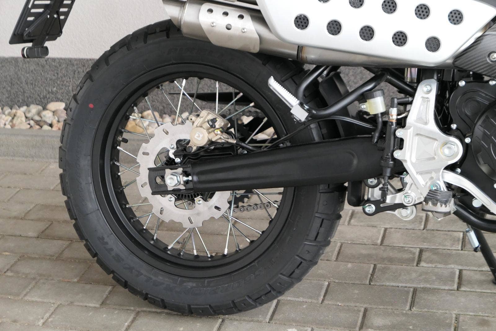 Drátová kola s pneumatikami Pirelli Scorpion Rally (110/80-19 vpředu a 140/80-17 vzadu) dodávají motocyklu autentický scrambler vzhled. 320 mm přední plovoucí a 230 mm zadní brzdový kotouč a nastavitelné náklonové ABS s kontrolou trakce zaručují skvělou bezpečnost v každé situaci.
