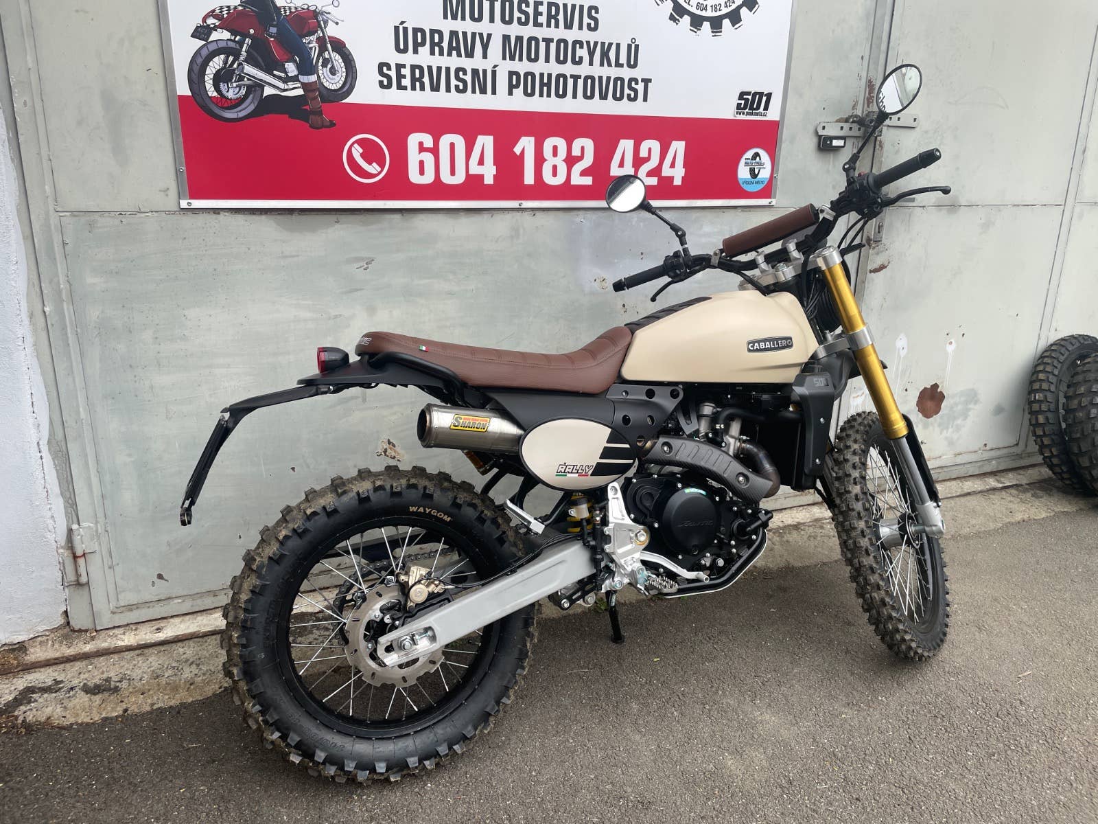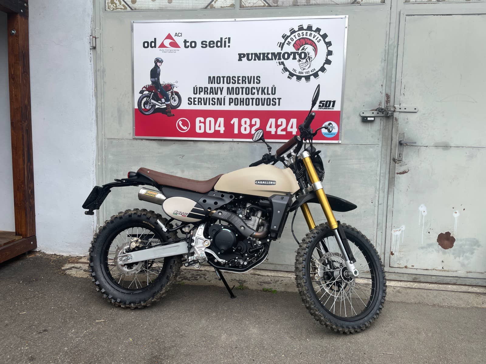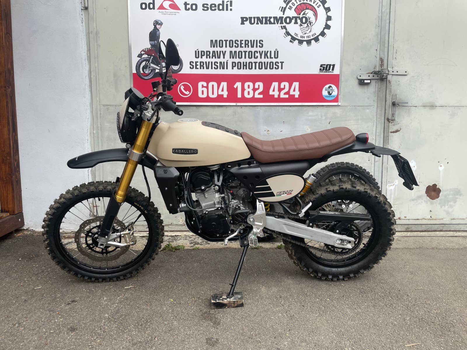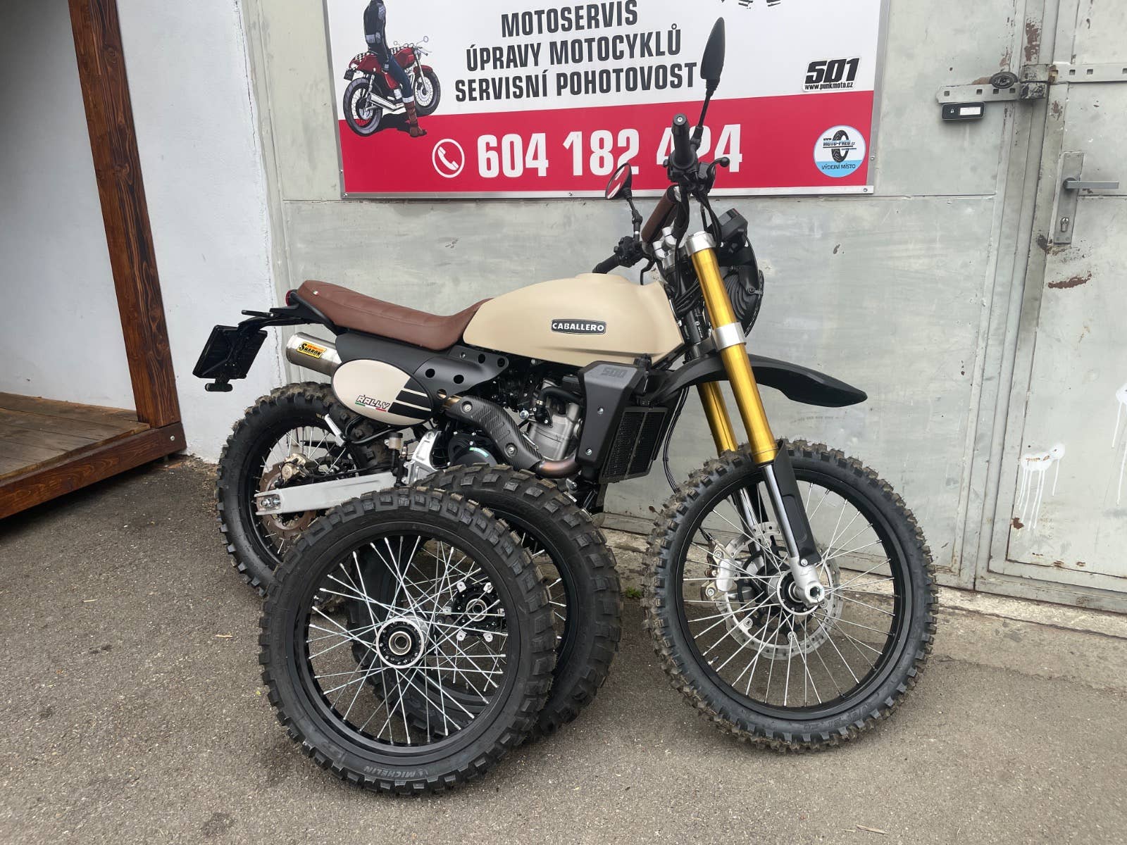 Fantic Caballero Rally 500 (zdvihy tlumičů 200mm), prakticky nejetá (na ODO je cca 20km) pouze testování uložení kol 21a18 palců.