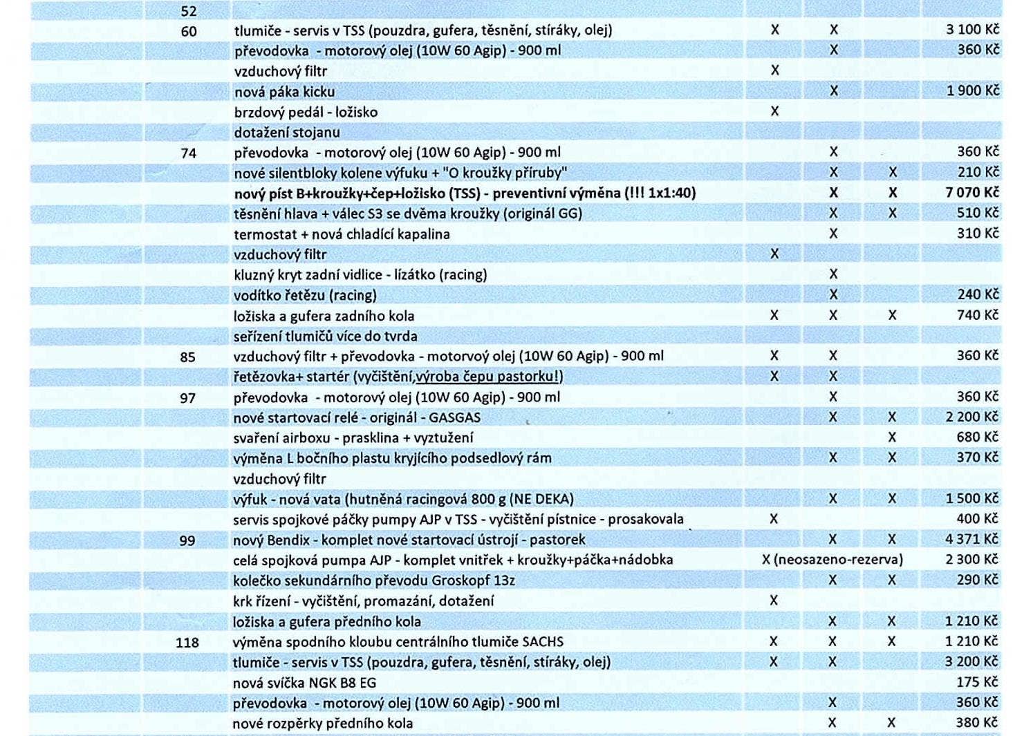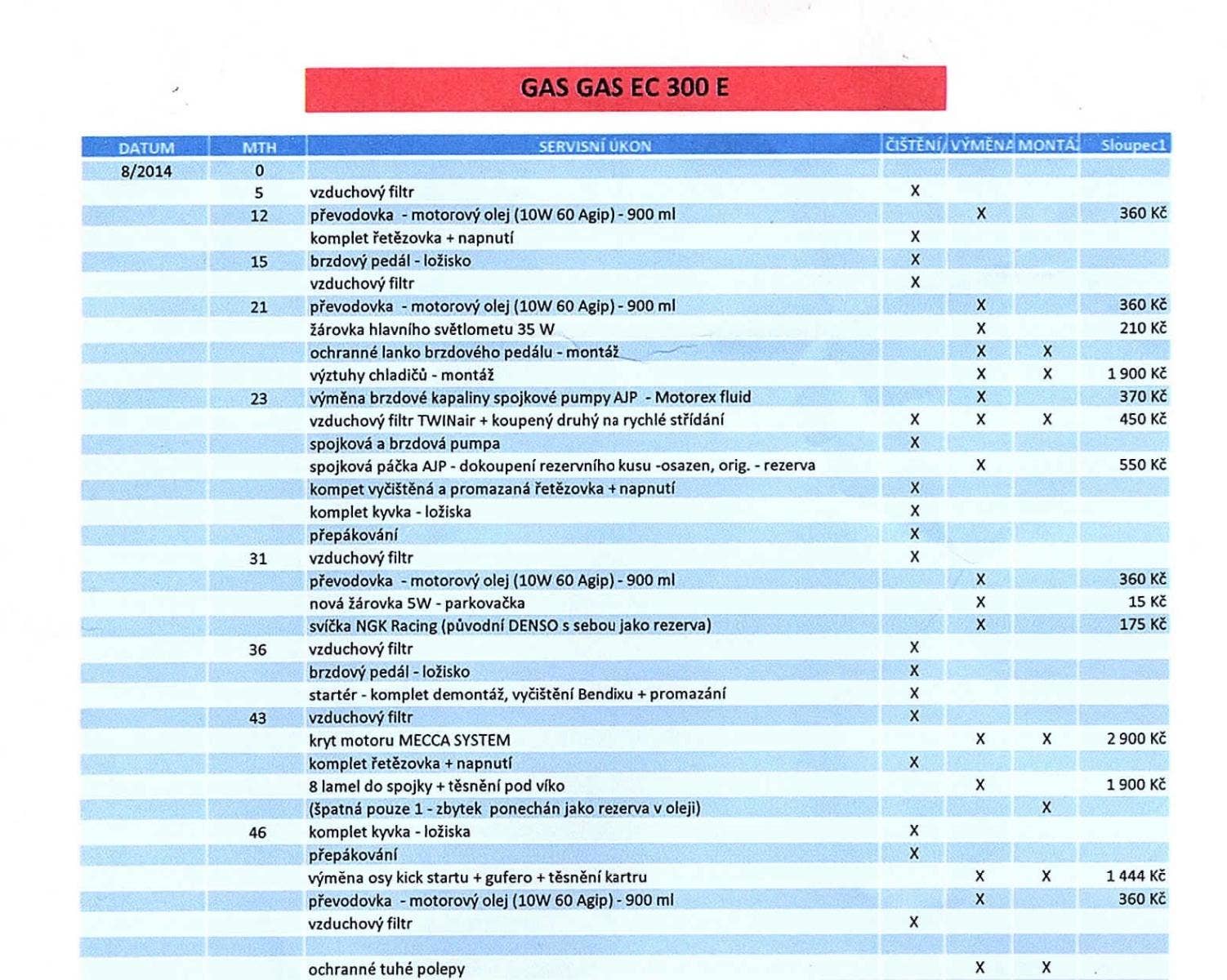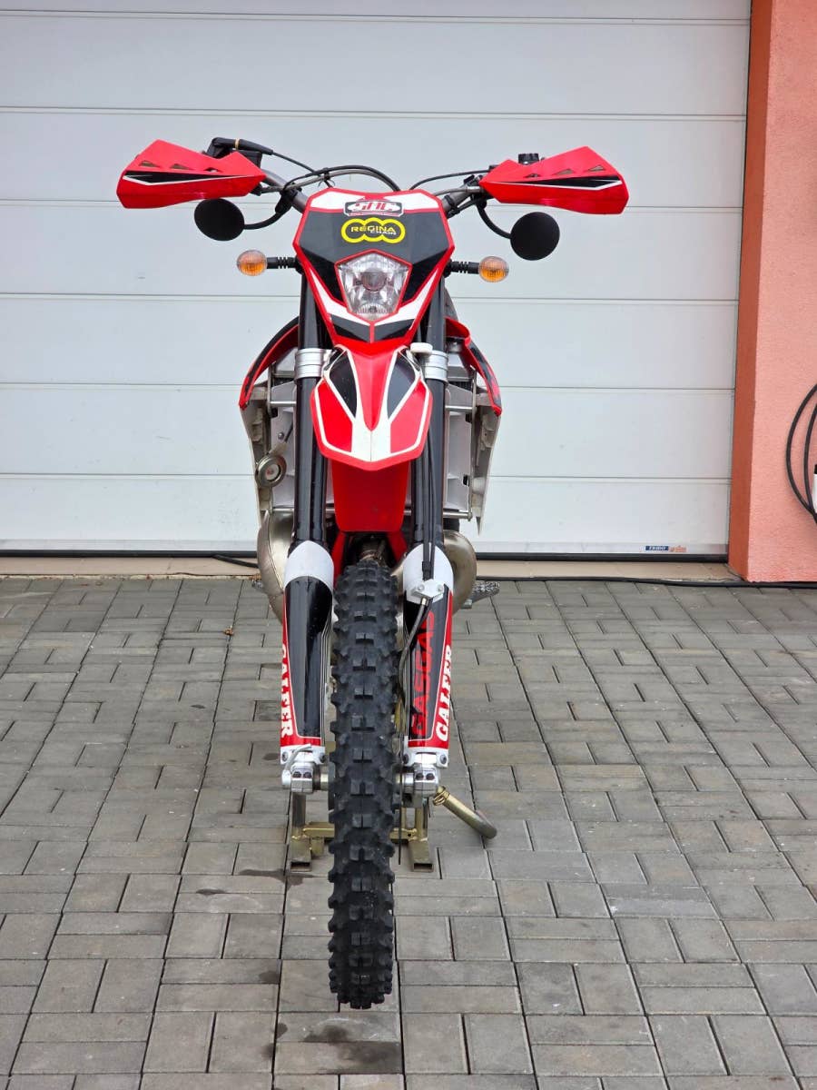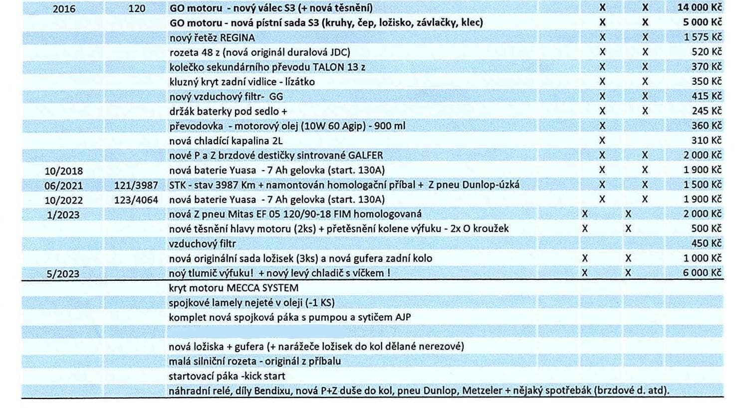 Prodám enduro Gas Gas EC300 E, rok výroby 2014, najeto 4415 km (131mth), výkon v TP 6,5 kW (reálně cca 38 kW, 52koní), objem motoru 299cm3, STK platná do 6/2029. Motorka zakoupena a servisovaná u TSS-Technical sports s. r.o., kompletní servisní historie včetně faktur. Celkově ve velice pěkném udržovaném stavu ježděno rekreačně, ale poslední 2 roky skoro vůbec, po celou dobu jeden majitel. Nyní na moto nově P + Z brzdové destičky Galfer, komplet řetězovka (primární převod, rozeta JDC, řetěz Regina), slider na kyvce, zánovní vodítko řetězu, kloubové ložisko uložení centrálního tlumiče Sachs, zadní pneu, komplet ložiska a gufera Z kola, P zánovní, brzdové destičky. Gelová baterie Yuasha, nový L chladič s víčkem, koncovka (tlumič) výfuku, nový olej v pumpě spojky i převodovce, nová chladící kapalina. K moto množství nových dílů - gufera, ložiska, rozpěrky do kol, rezervní relé pro startér, originální nejetá malá (silniční) rozeta, restrikce karburátoru, páka kick startu. Instalovány kvalitní chrániče chladičů s výztuhou, rezervní spojková páka (také nová), valitní ALU kryt motoru Mecca system. K motorce originální příbal, díly, chemie na filtr, olej, stojan.