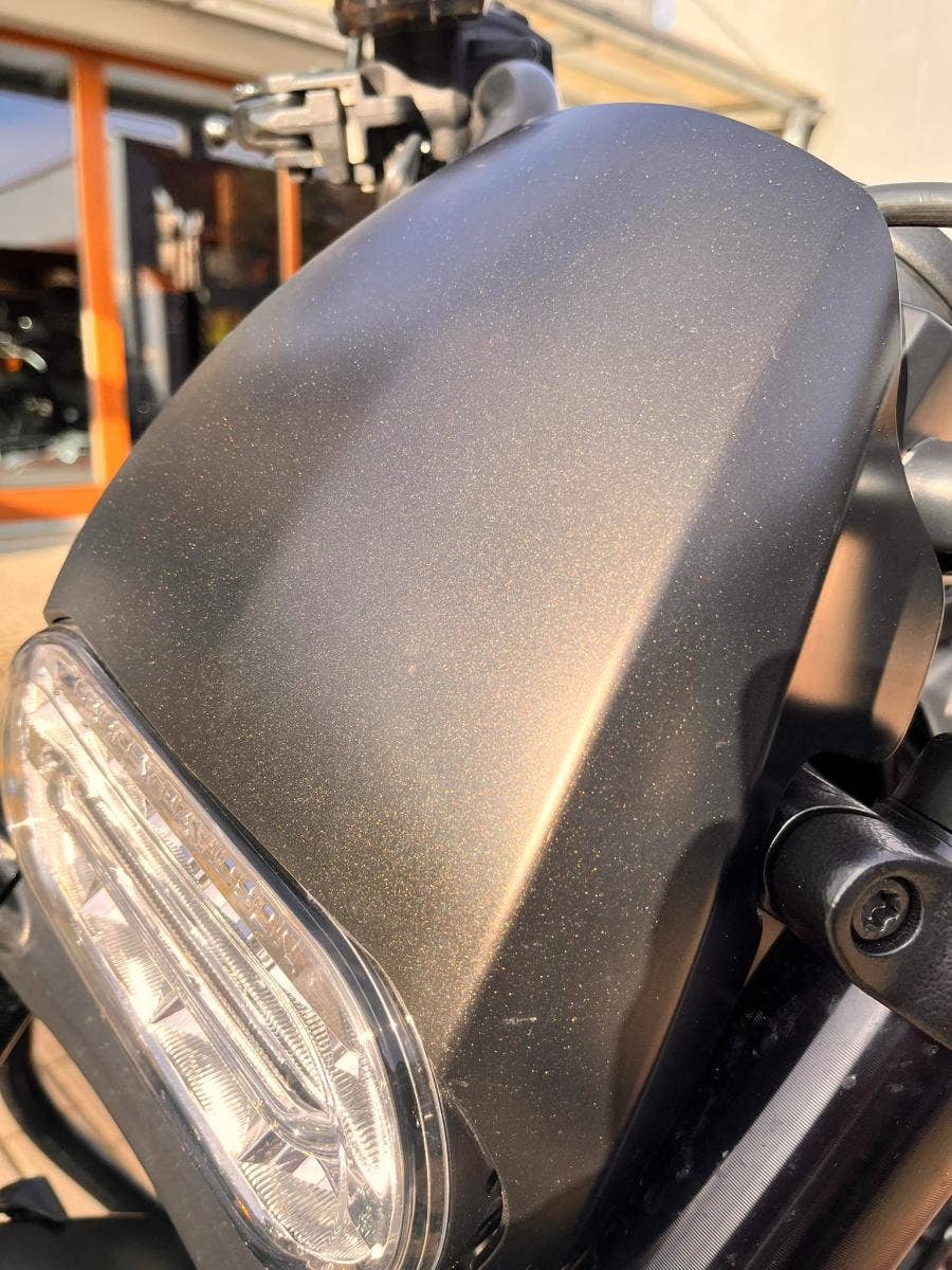 Motocykl má zakázkové lakování s perletí, lak je ochráněn transparentní fólií.
