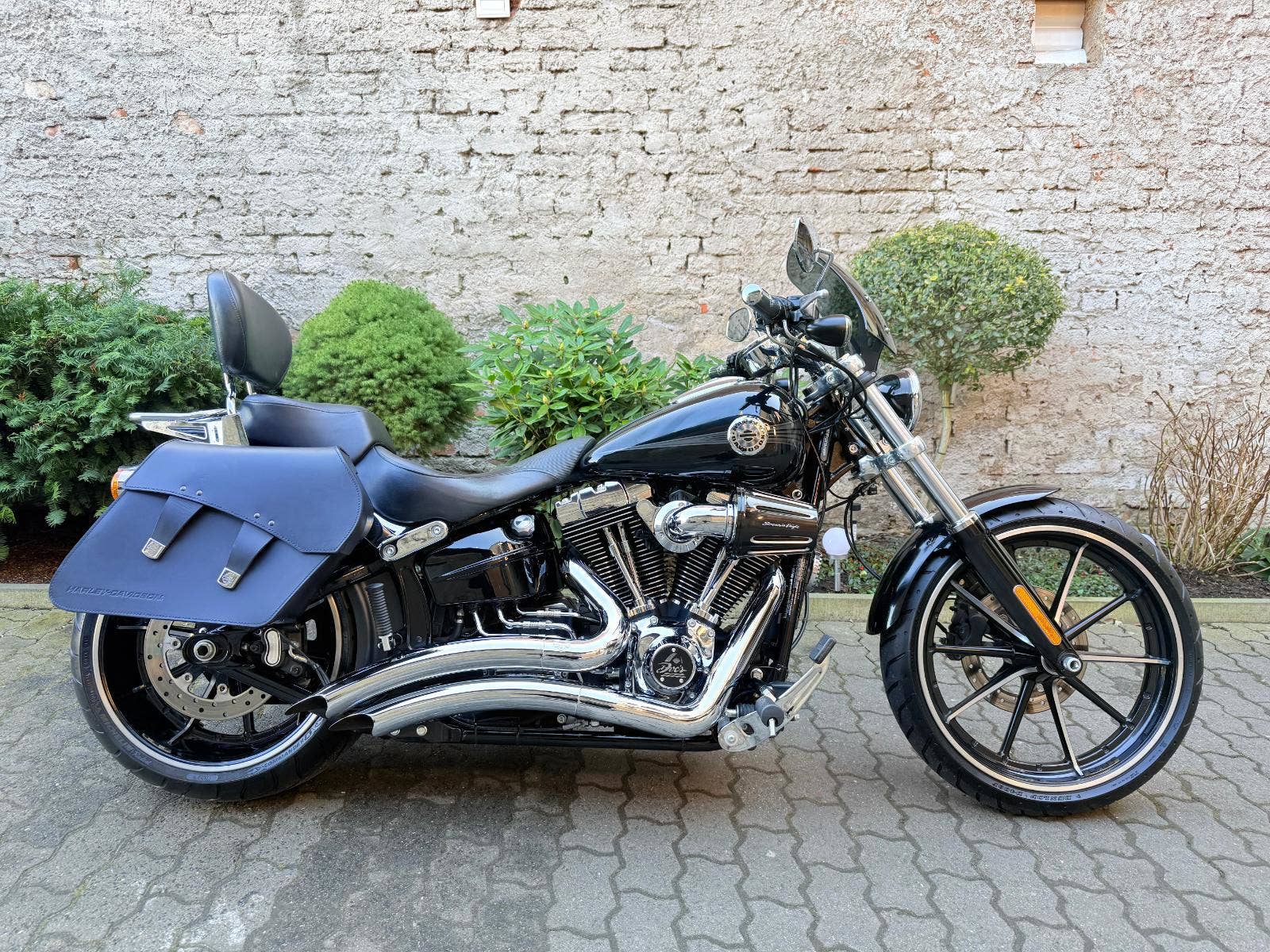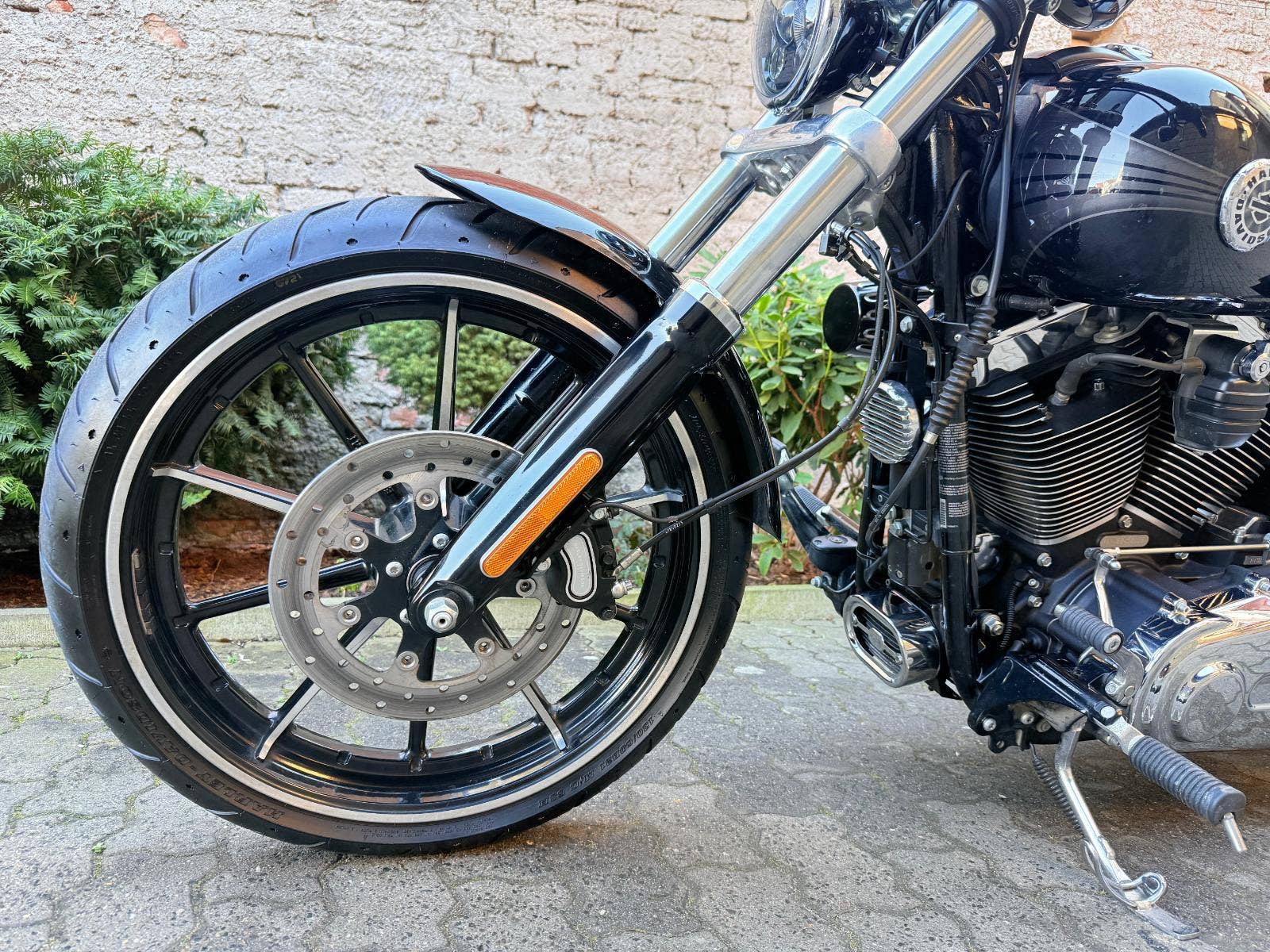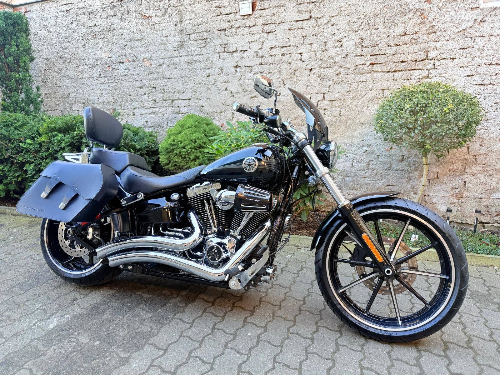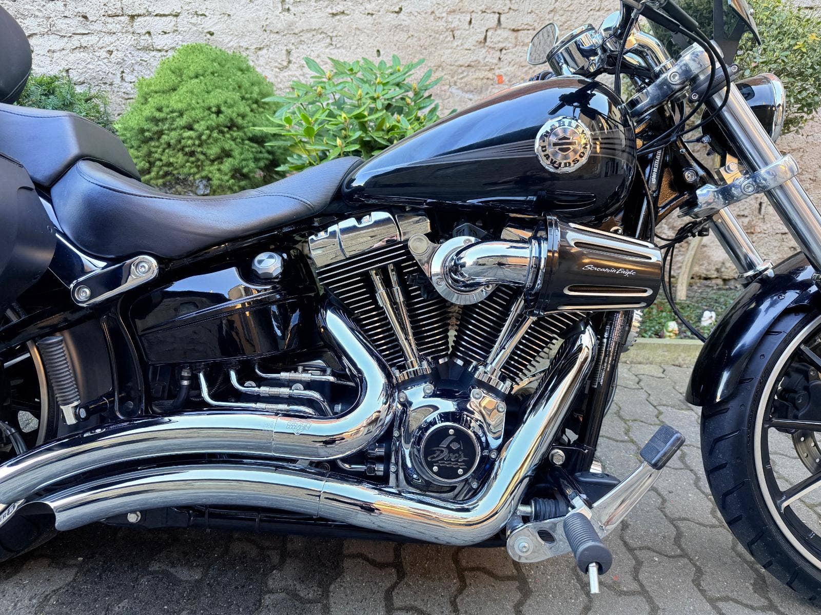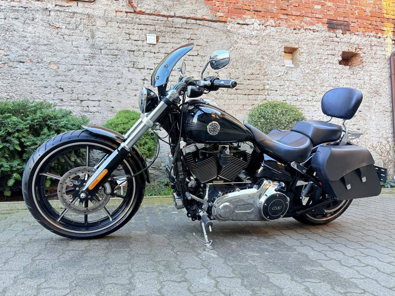 Harley-Davidson FXSB Sofatil Breakout s ABS. Motocykl je po základní servisu - nové náplně, olejový filtr, svíčky, přední a zadní brzdové destičky. Motockyl má velké množství doplňků : Originál rychloupínací brašny, rychloupínací opěrku s nosičem, doplňkové sedadlo spolujezdce, vyhřívané hefty Skull, LED parabola hlavního světla a LED vložky předních blinkrů Custom Dynamics, plexi Dart, laděné výfuky Vance and Hines, sání Screamin Eagle a boční držák SPZ, který bude zapsaný v TP. V ceně motockylu je přihlášení, roční záruka a nová gelová baterie,