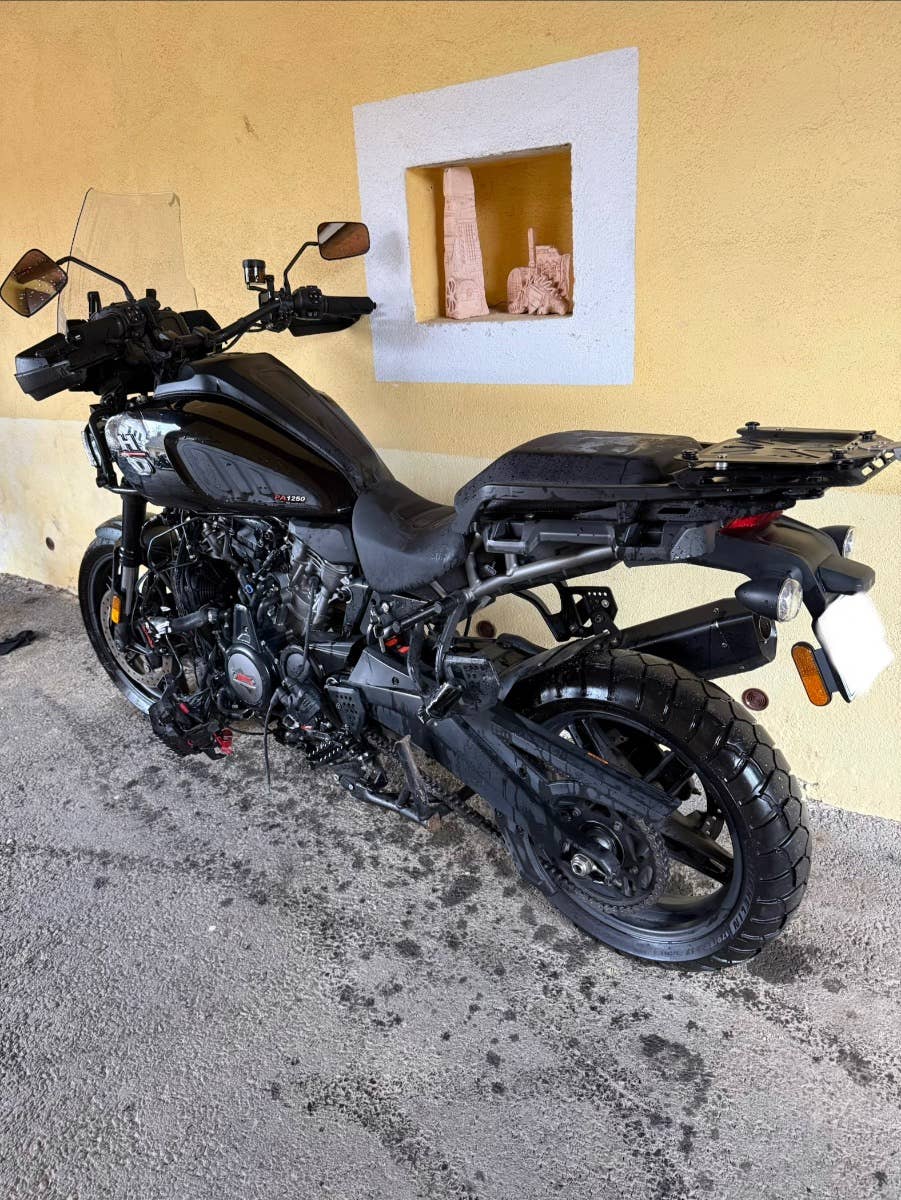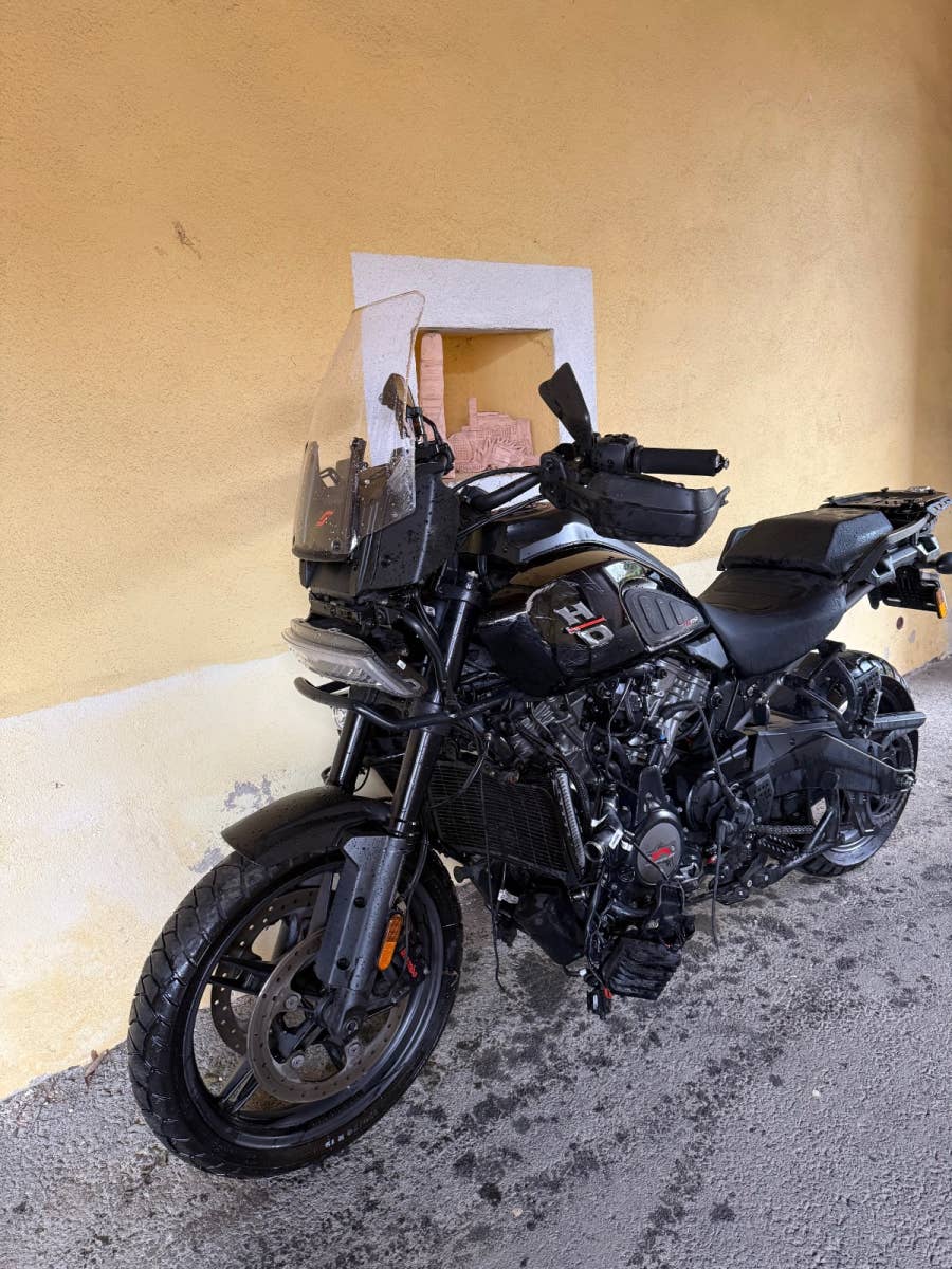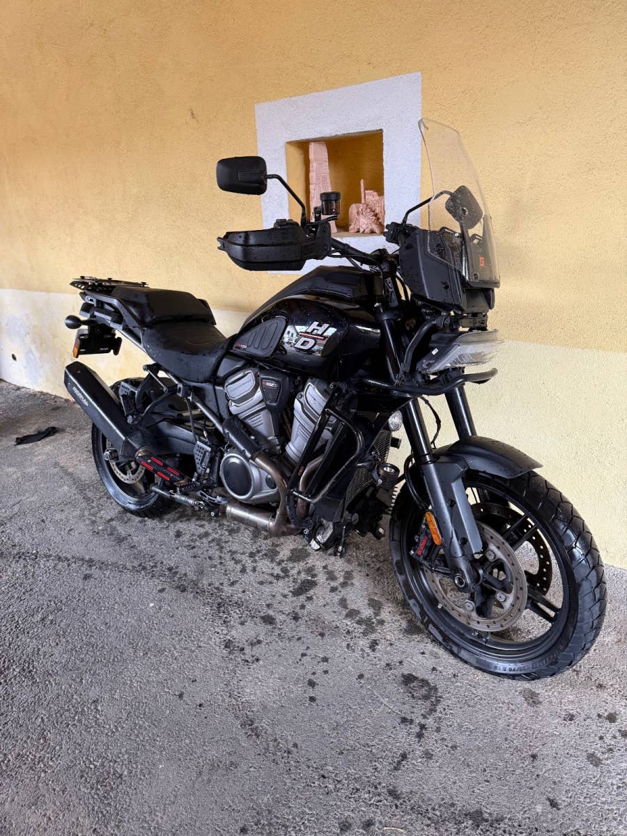 Havarovaná Harley Davidson Pan America 2022 5HD EU 24 880 km, podvozek vypadá v pořádku, rozbitá příruba na vodní pumpu (na dekliku motoru) motor o. k. Laděný homologovaný výfuk Mistral, motorka je zachovalá nejetá v terénu!