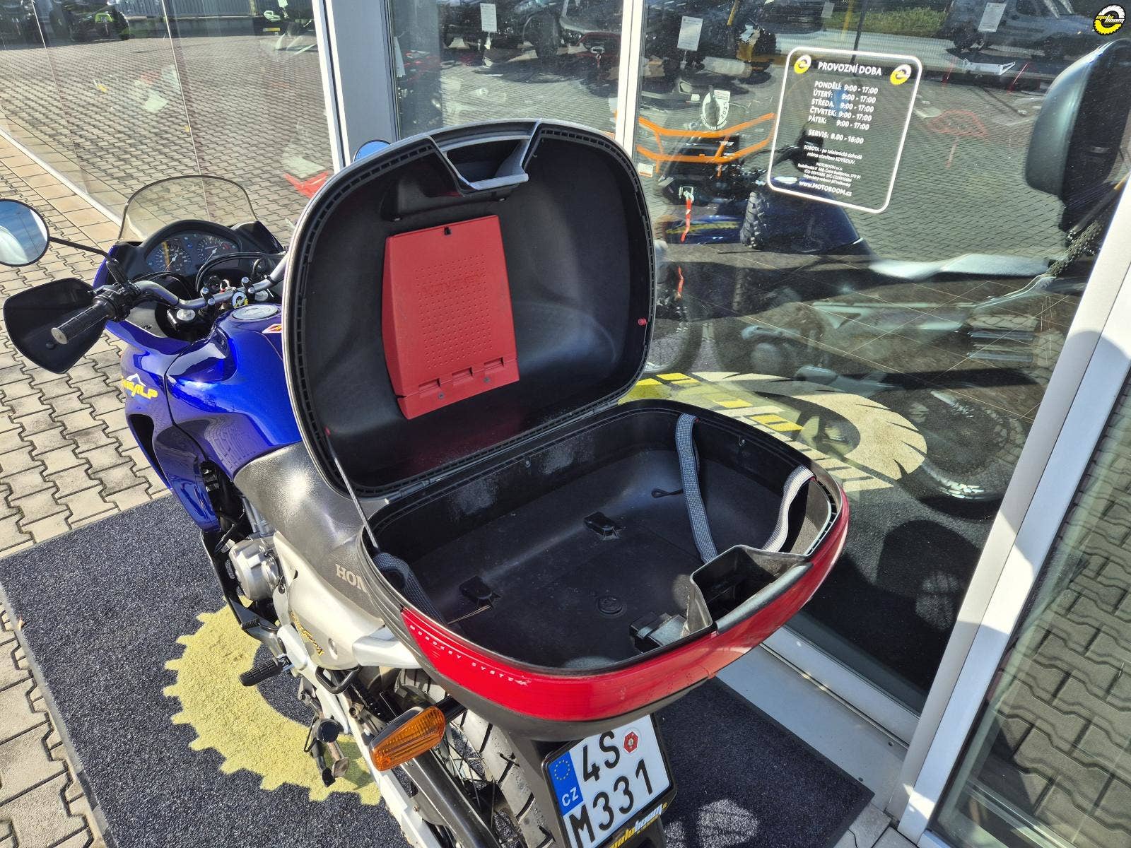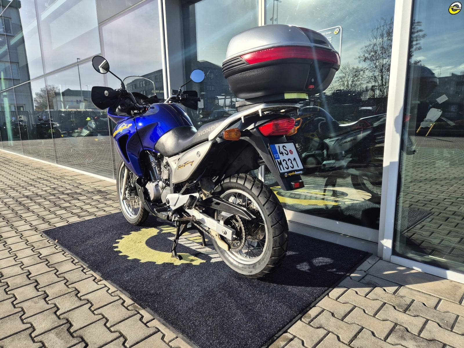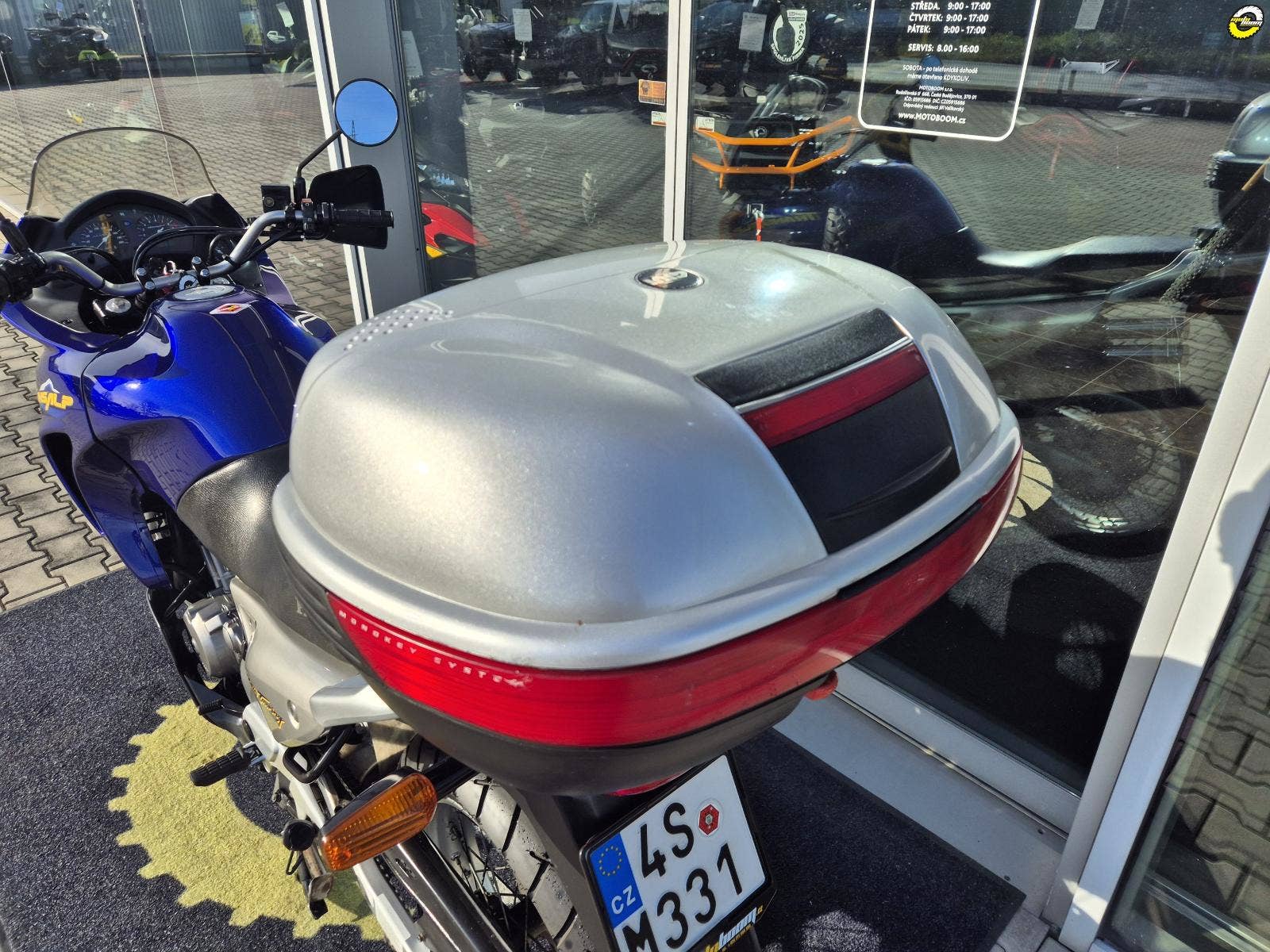 Na motocyklu namontované ochranné kryty rukojetí - blastery, velký zadní BOX GIVI, hlavní stojan