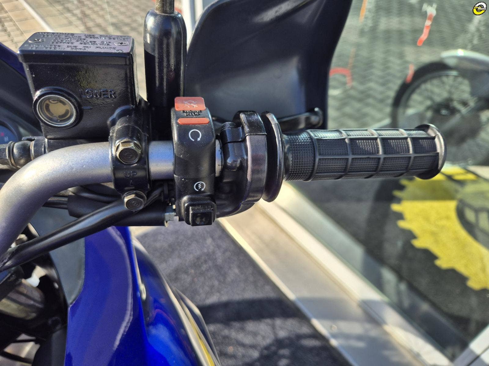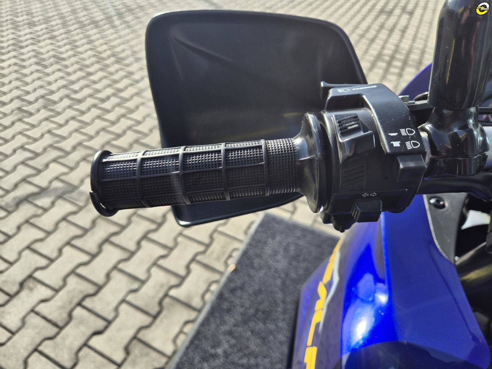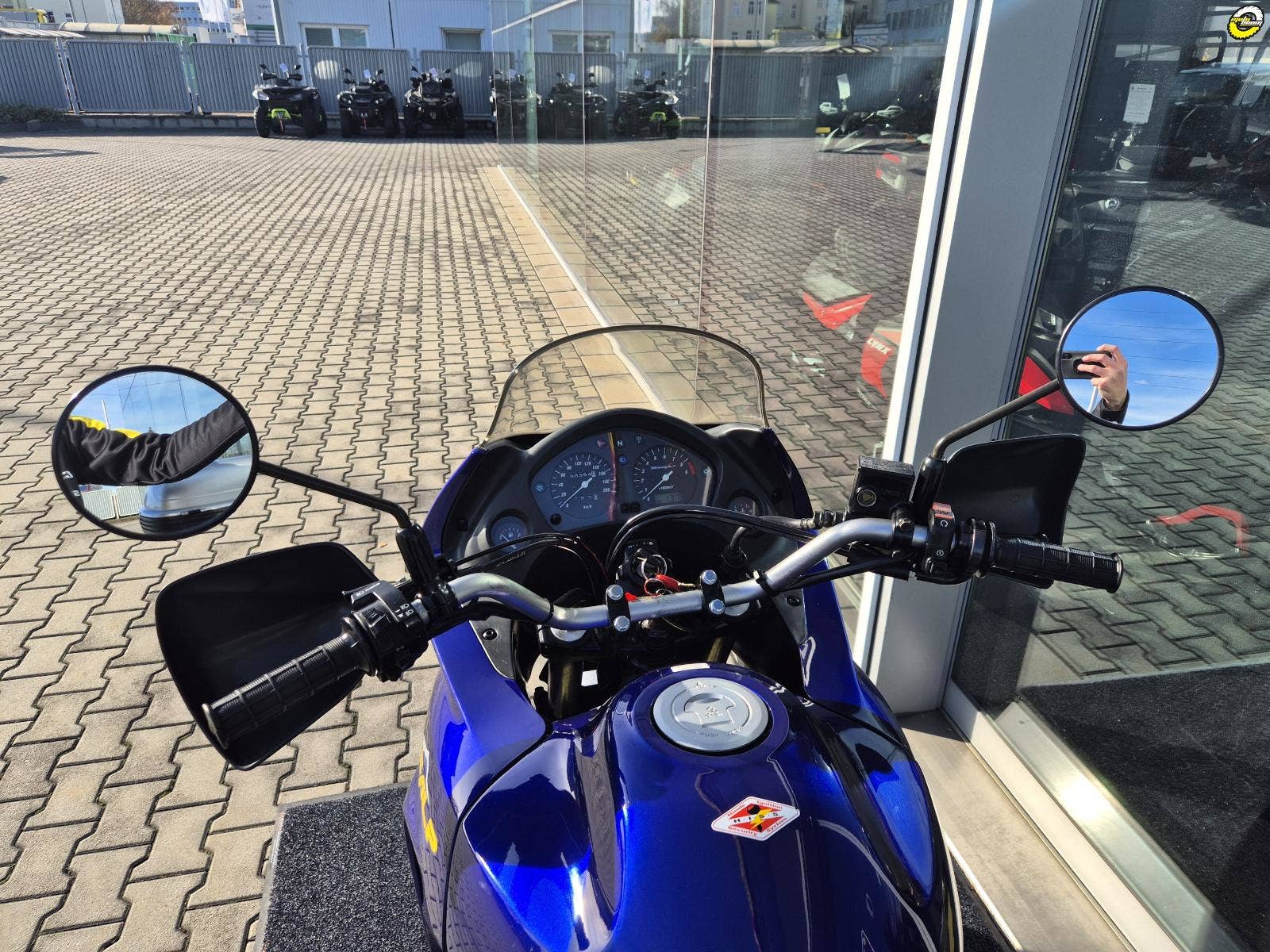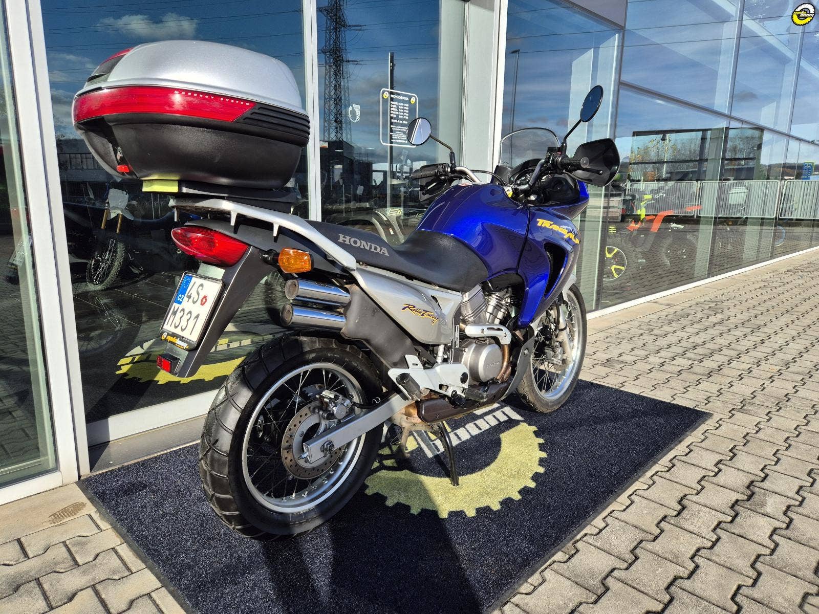 Na motocyklu namontované ochranné kryty rukojetí - blastery, velký zadní BOX GIVI, hlavní stojan
