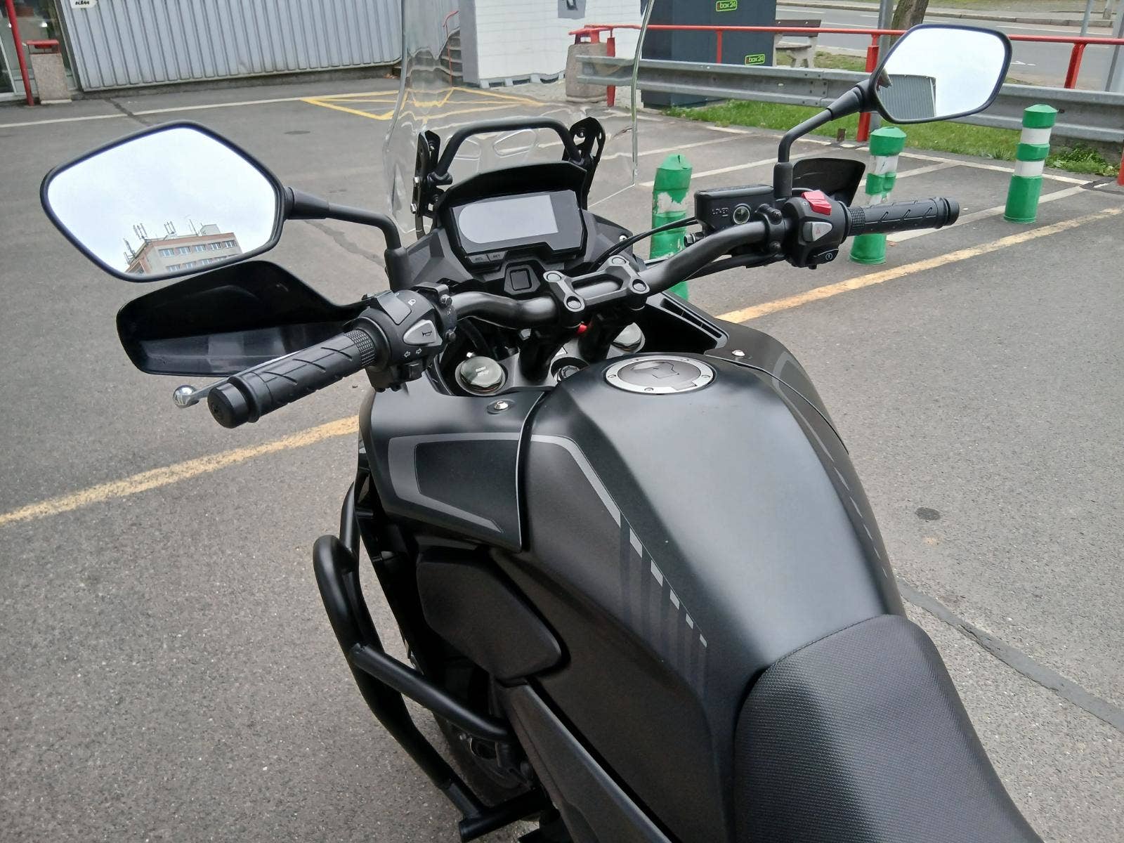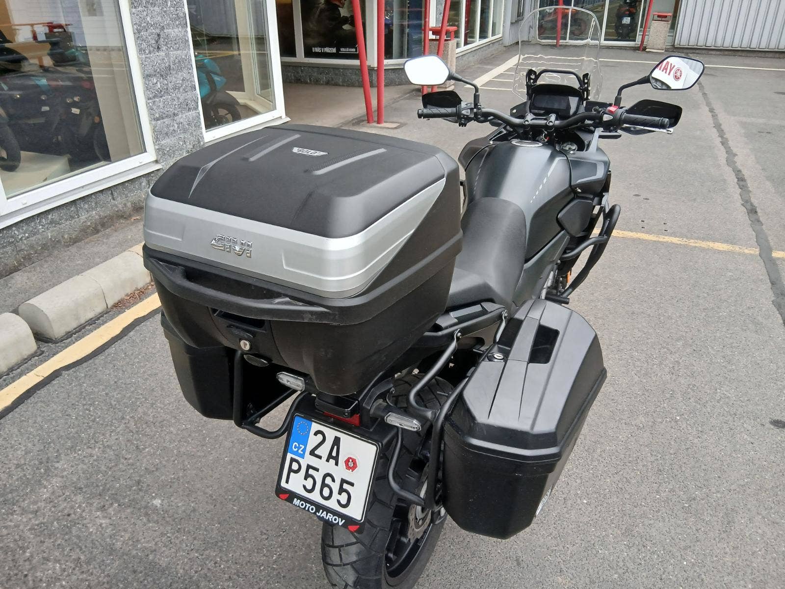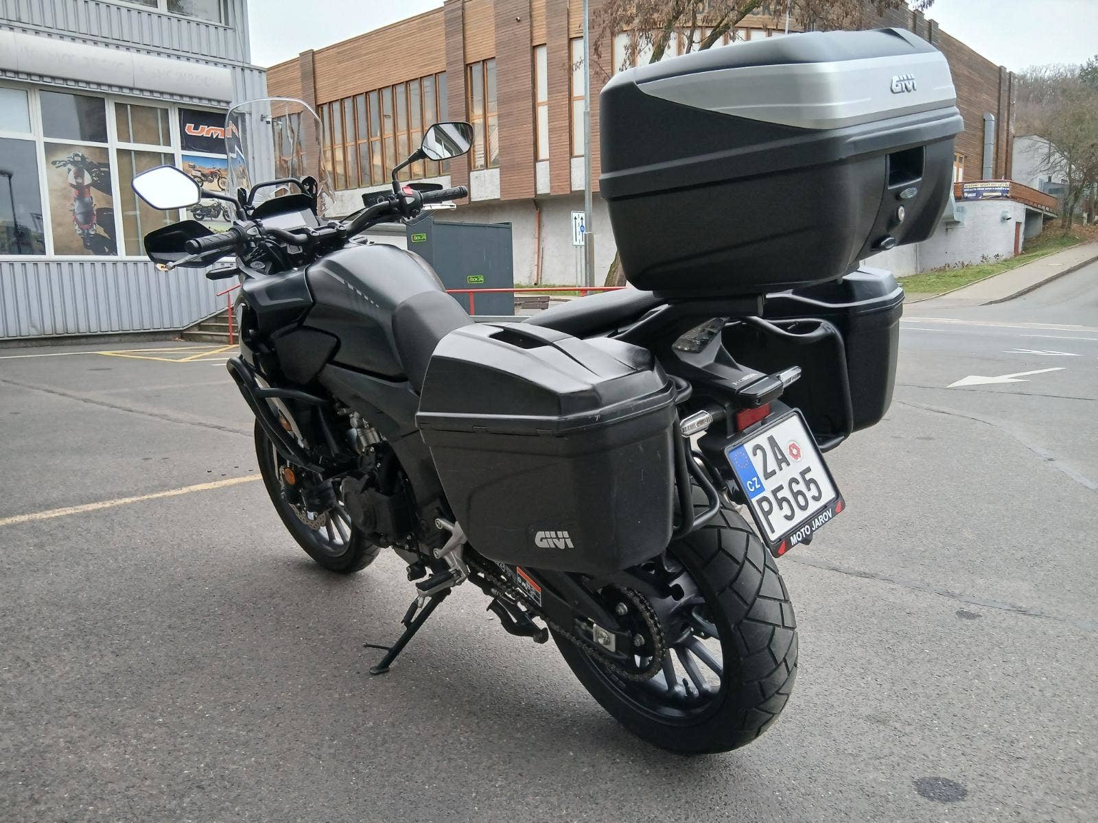 Má bohatou nadstandardní výbavu: sada tří kufrů GIVI, centrální stojan, padací ochranný rám, kryty rukojetí, USB zásuvka.