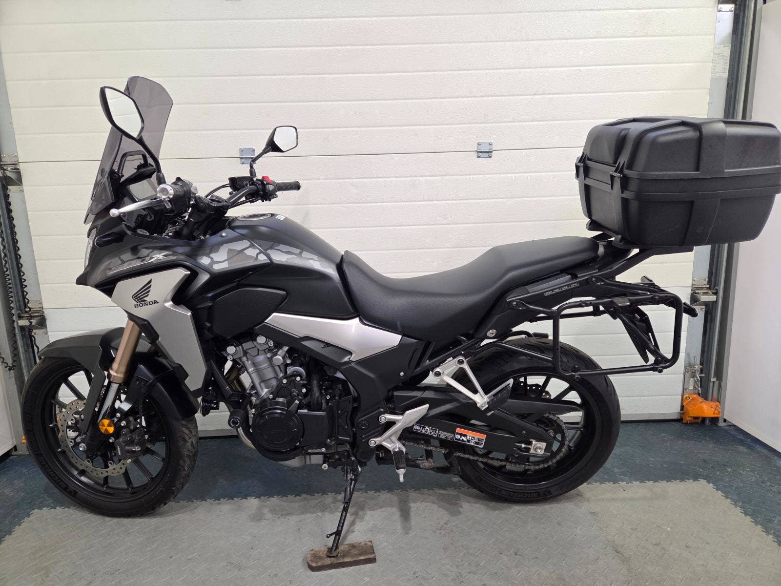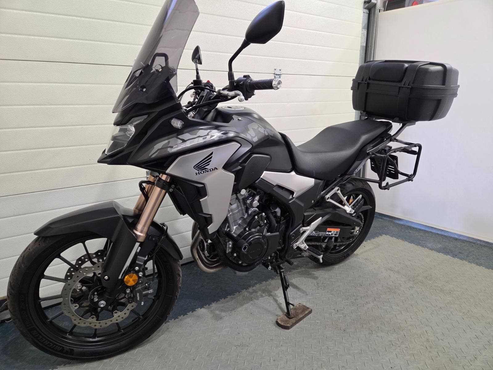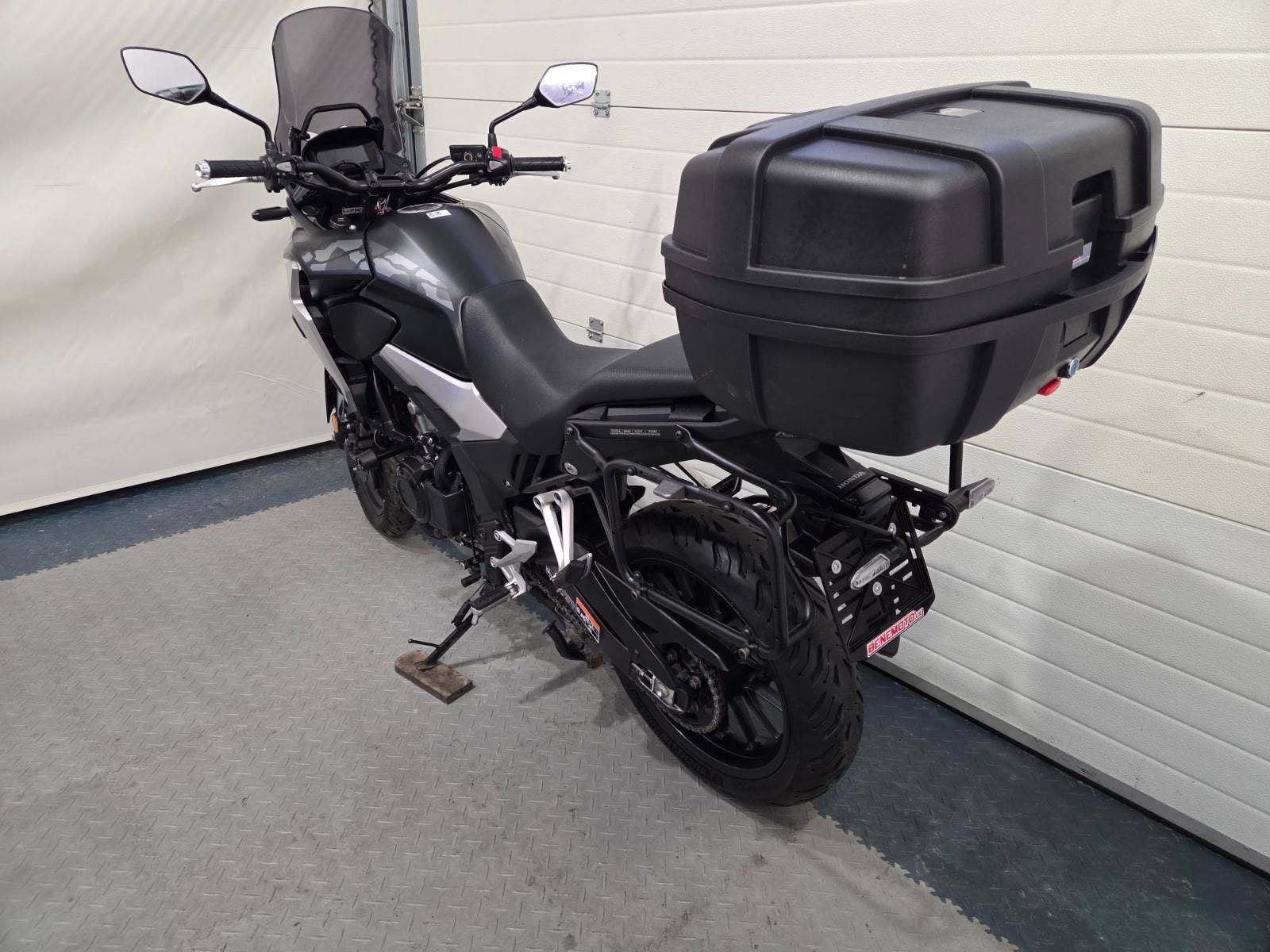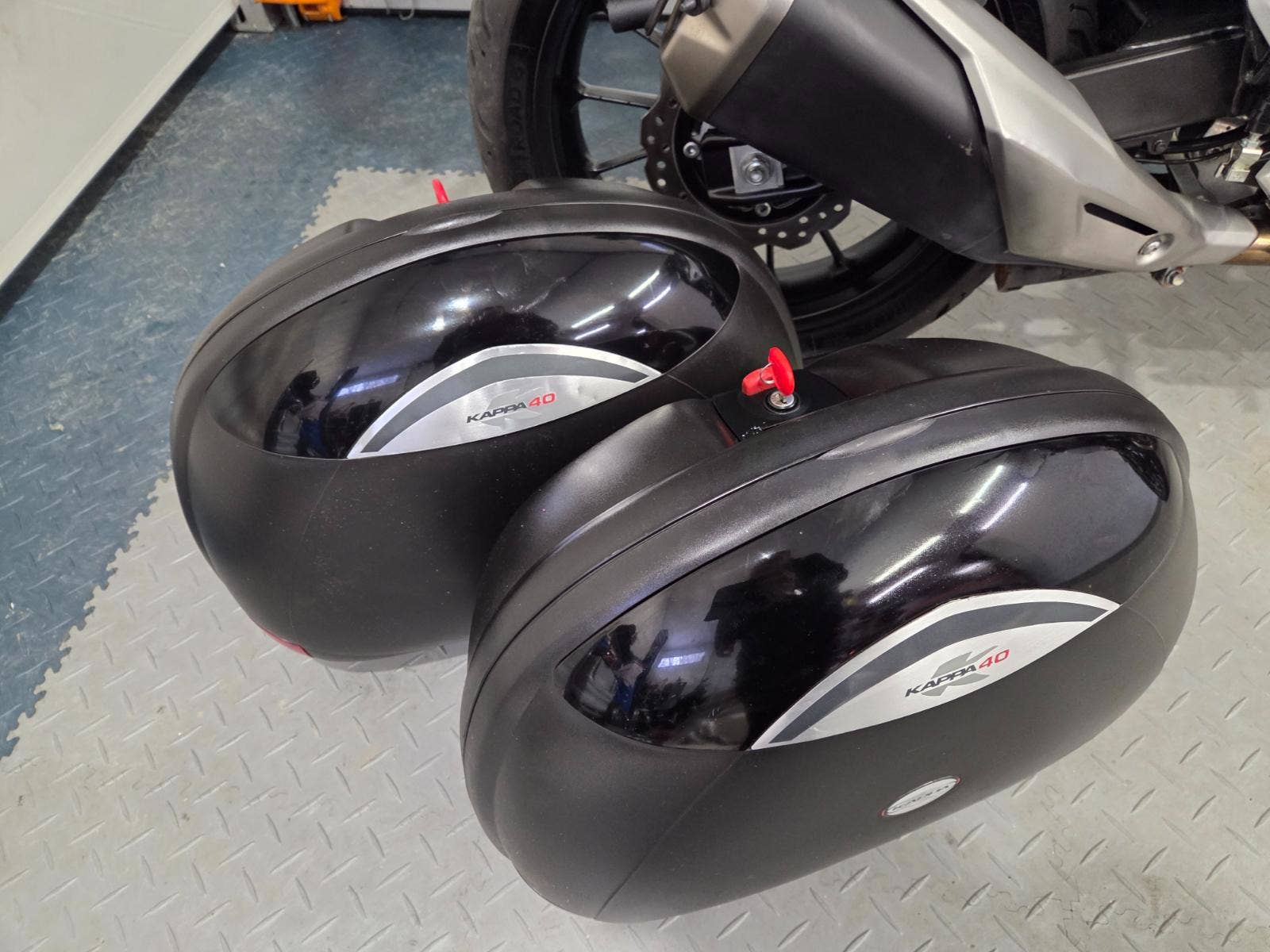 velká výbava: ABS, zásuvka, vysoké kouřové plexi, centrální stojan, 3x kufr s držáky, nástavec na výfuk aby se nepropálily kufry, pneu 80%, pádové protektory.