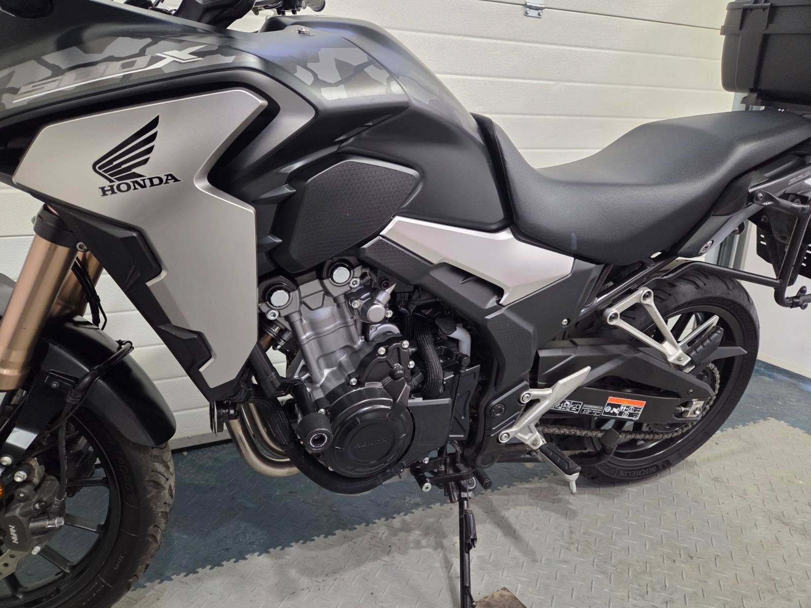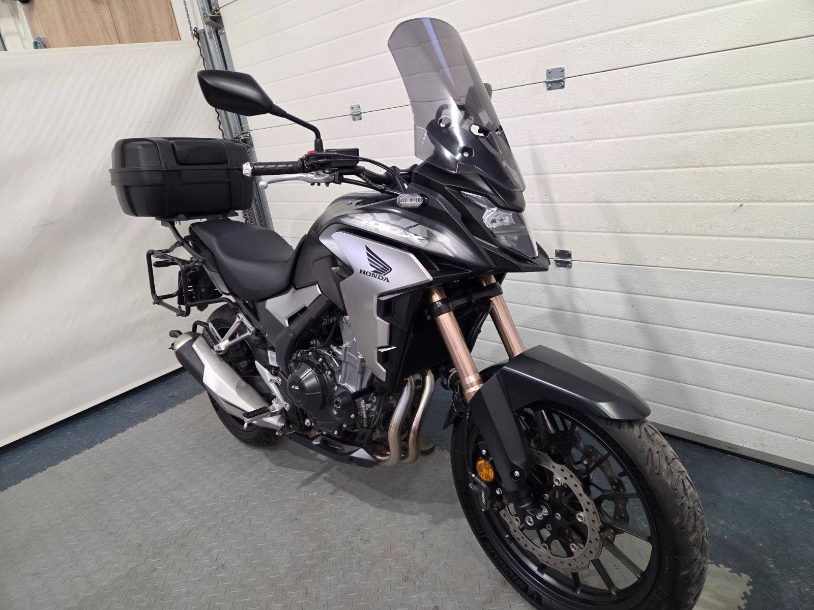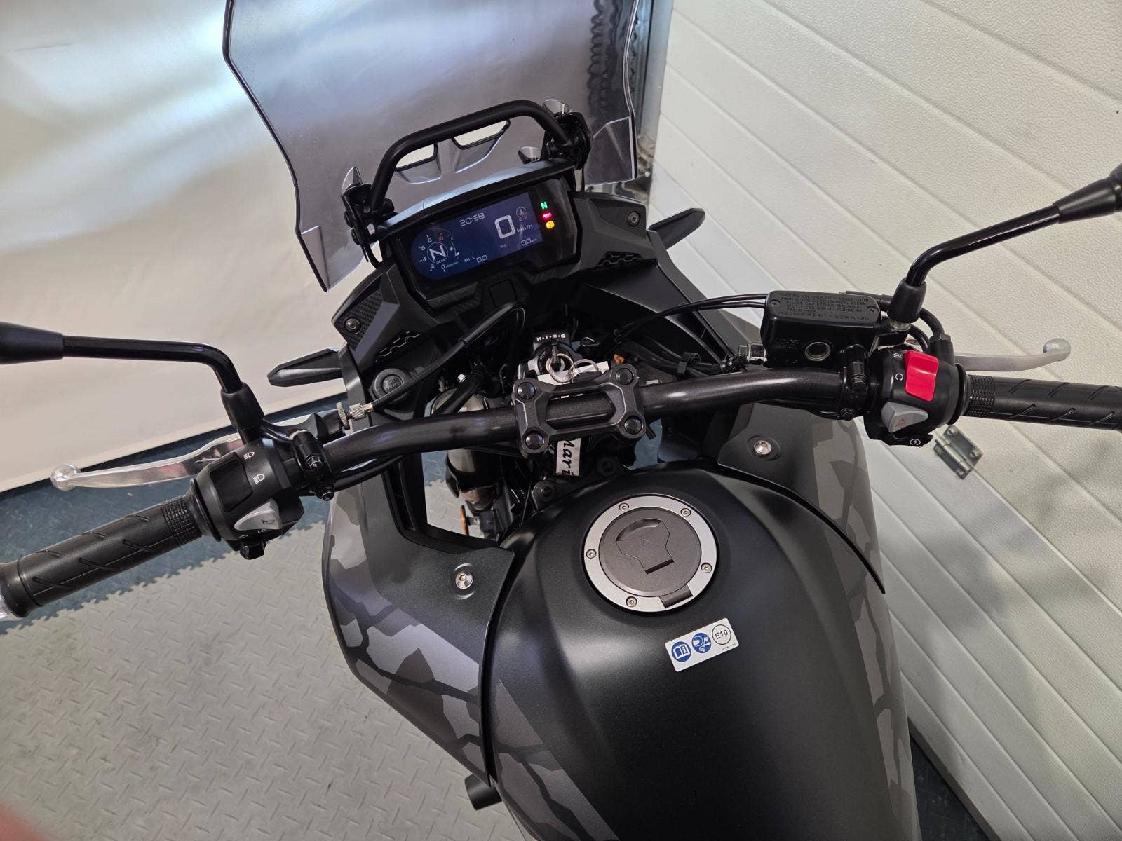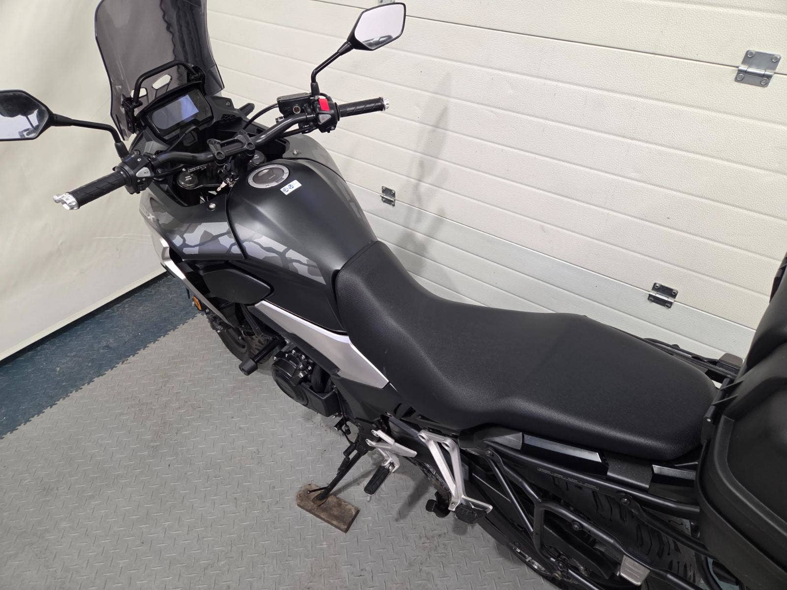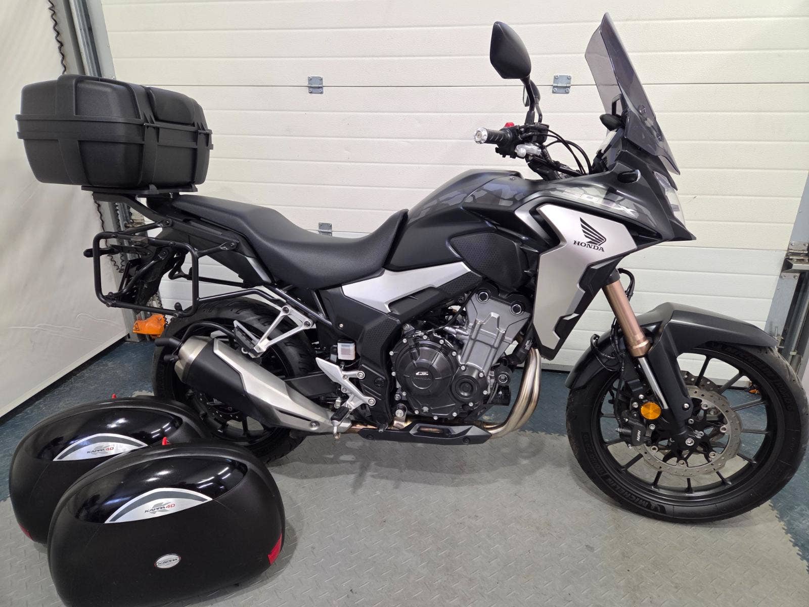 velká výbava: ABS, zásuvka, vysoké kouřové plexi, centrální stojan, 3x kufr s držáky, nástavec na výfuk aby se nepropálily kufry, pneu 80%, pádové protektory.