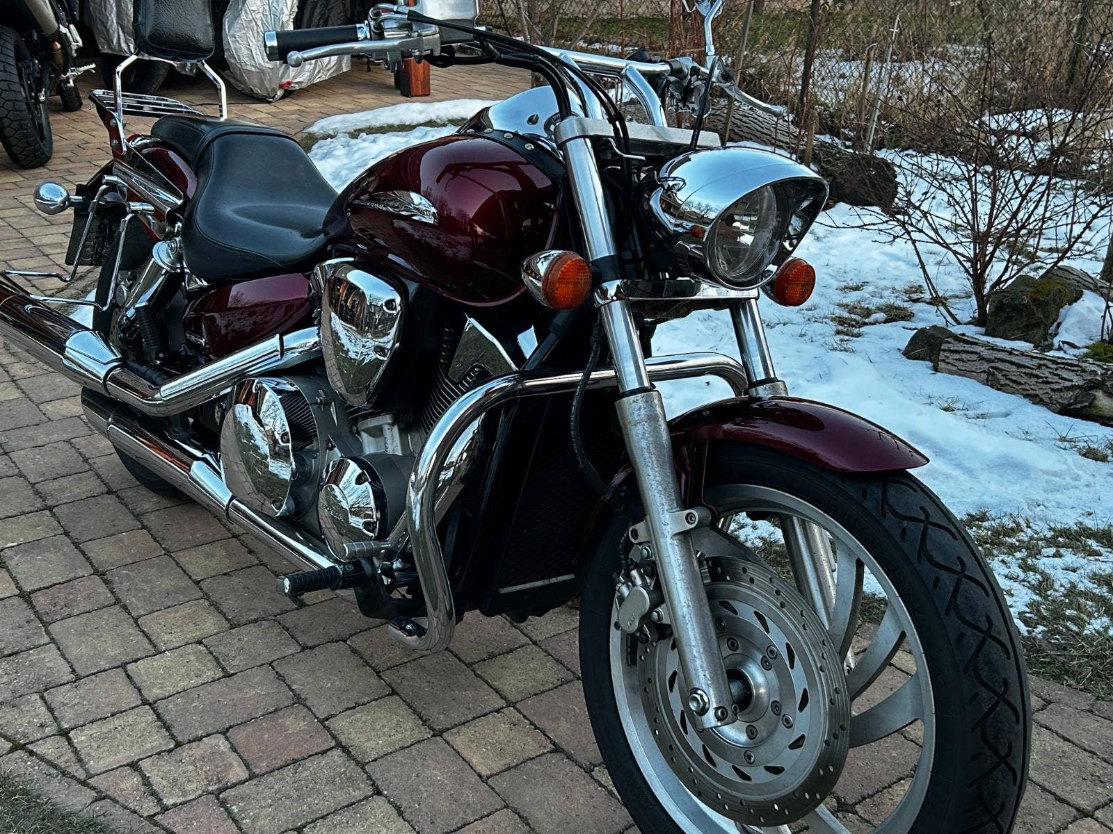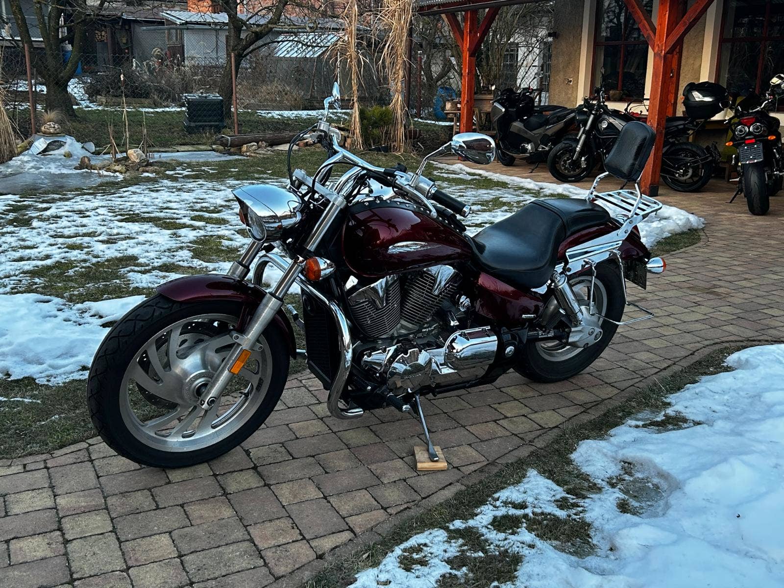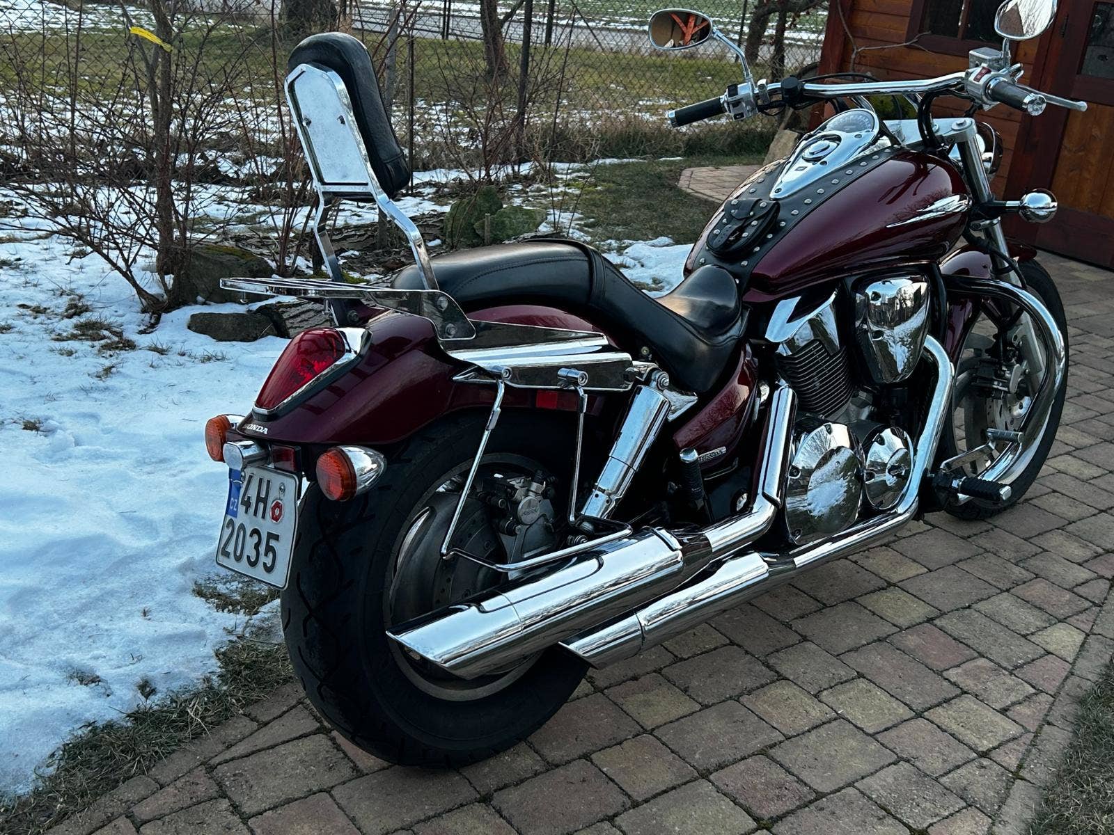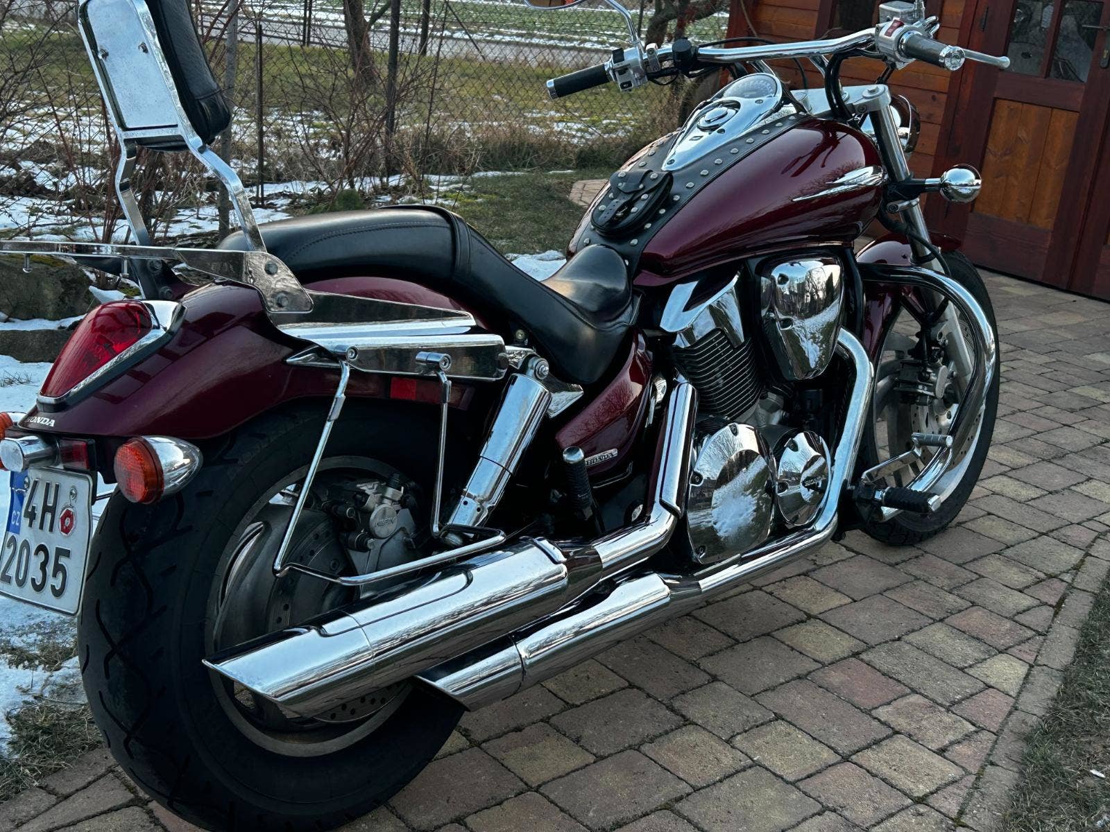 VTX 1300 v pěkném, originálním stavu, s doplňky – držáky + brašny, rolka, plexi, padací rám, pás na nádrž, nosič, opěrka, zásuvka.
