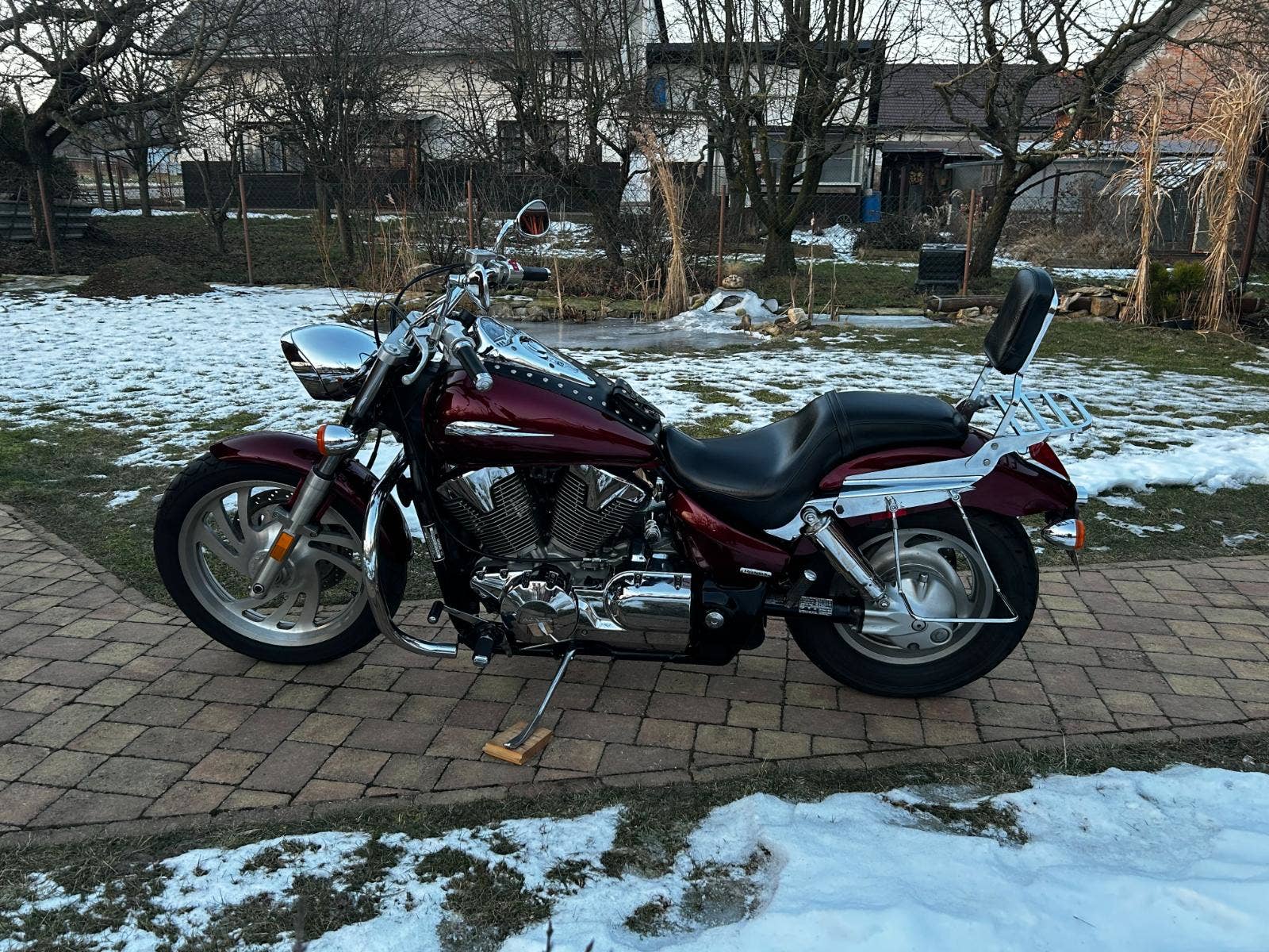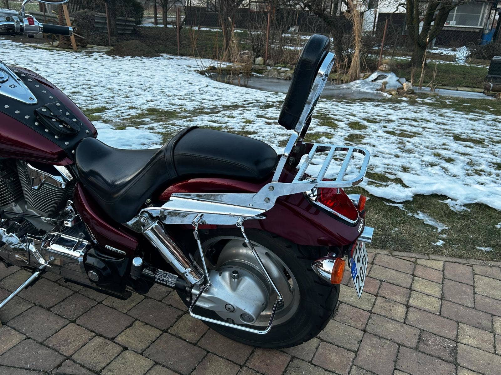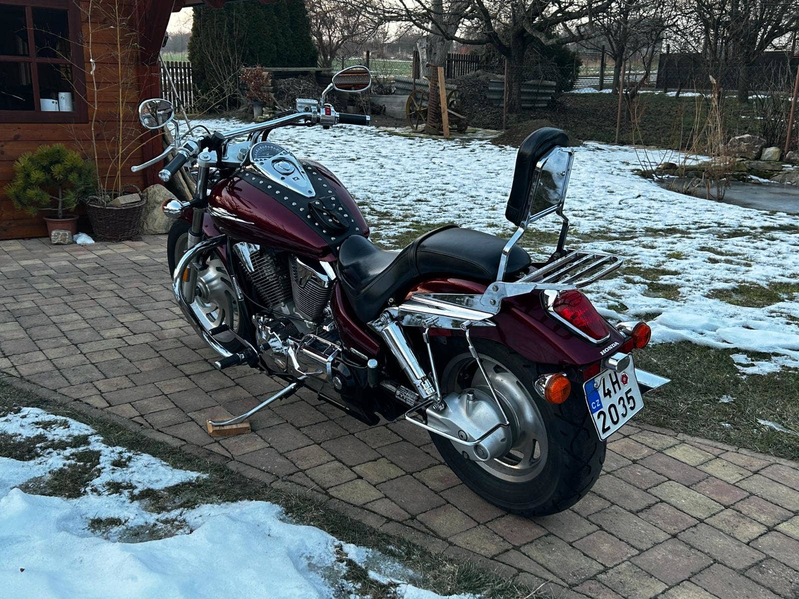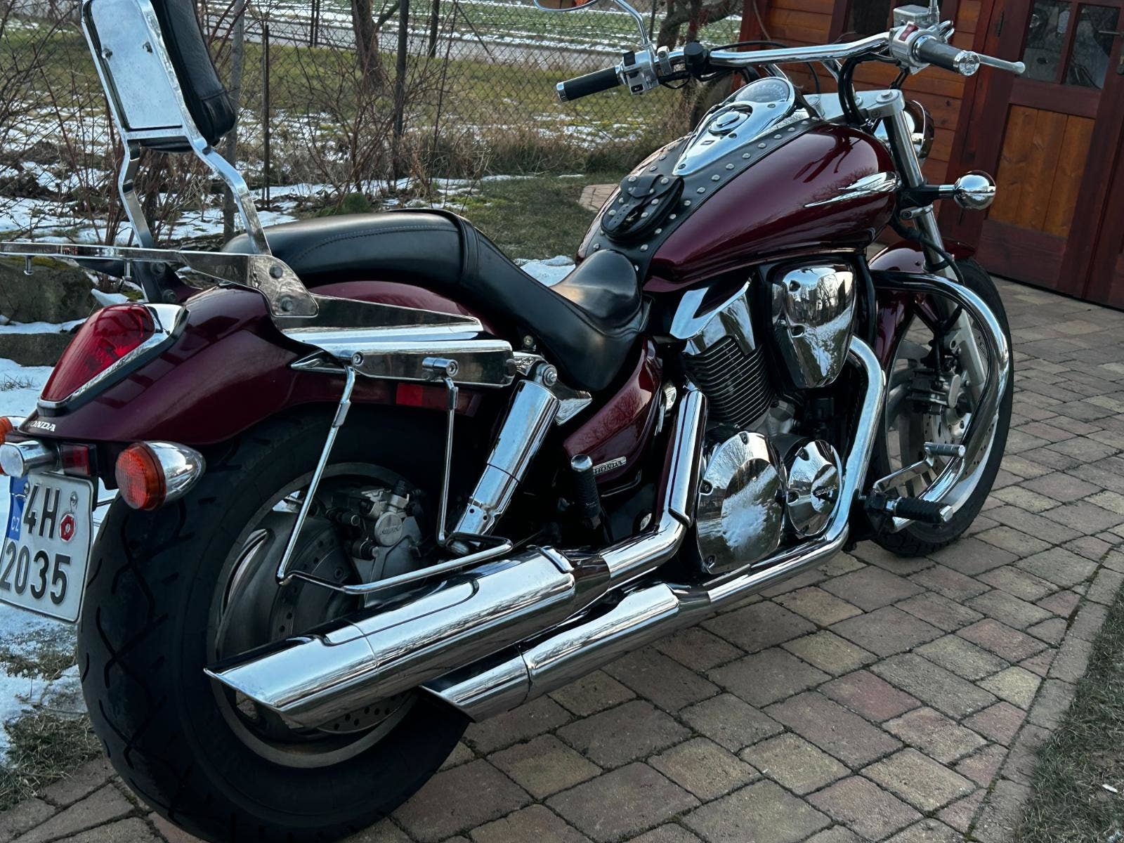VTX 1300 v pěkném, originálním stavu, s doplňky – držáky + brašny, rolka, plexi, padací rám, pás na nádrž, nosič, opěrka, zásuvka.
