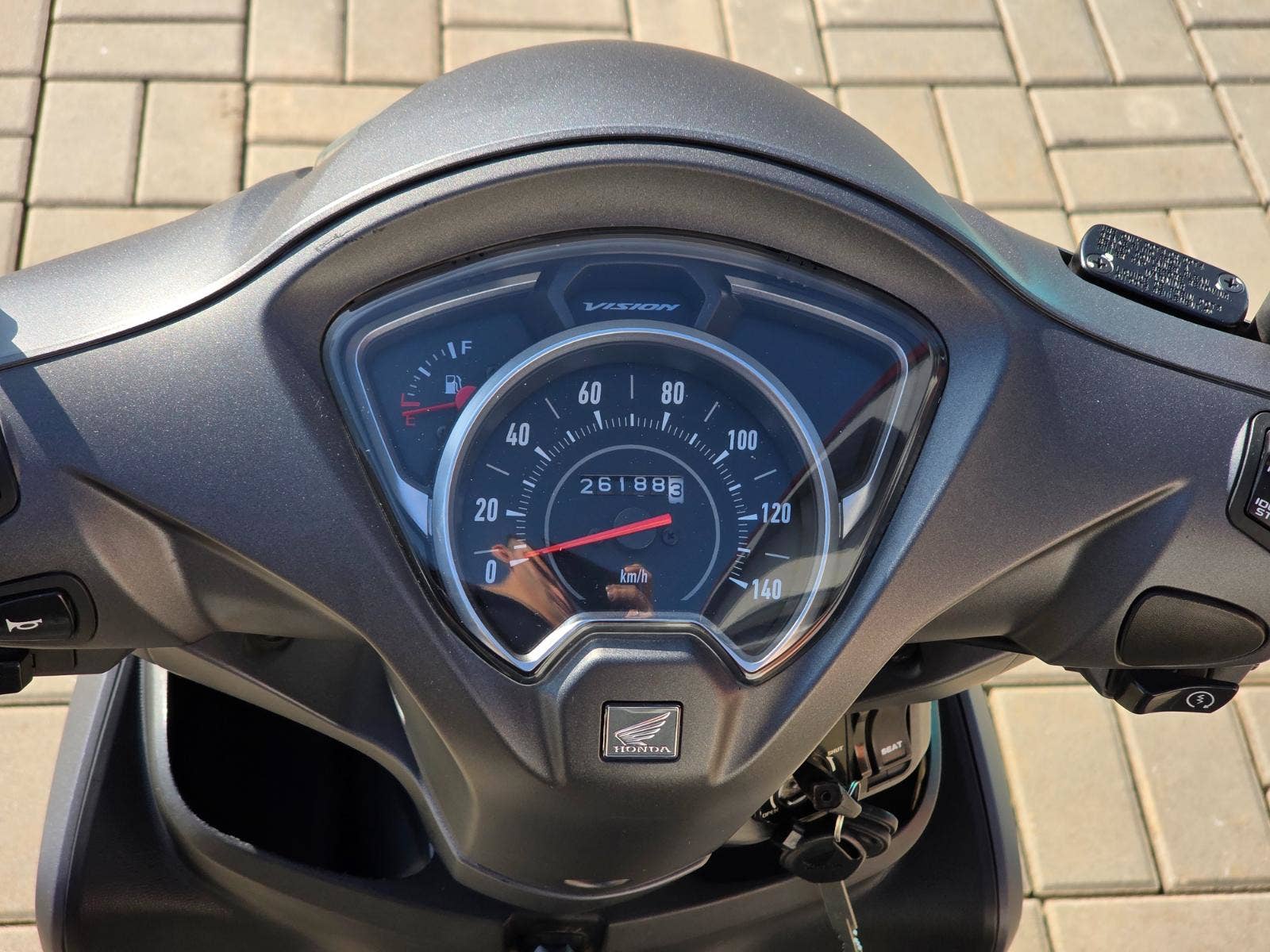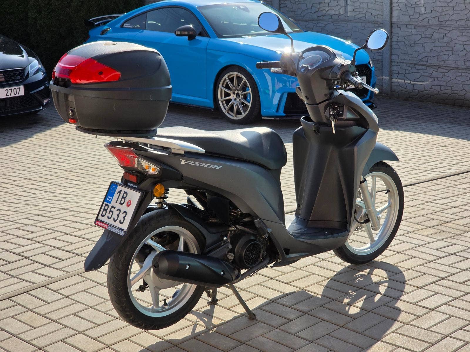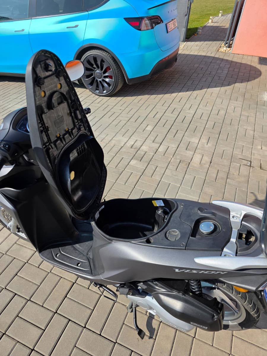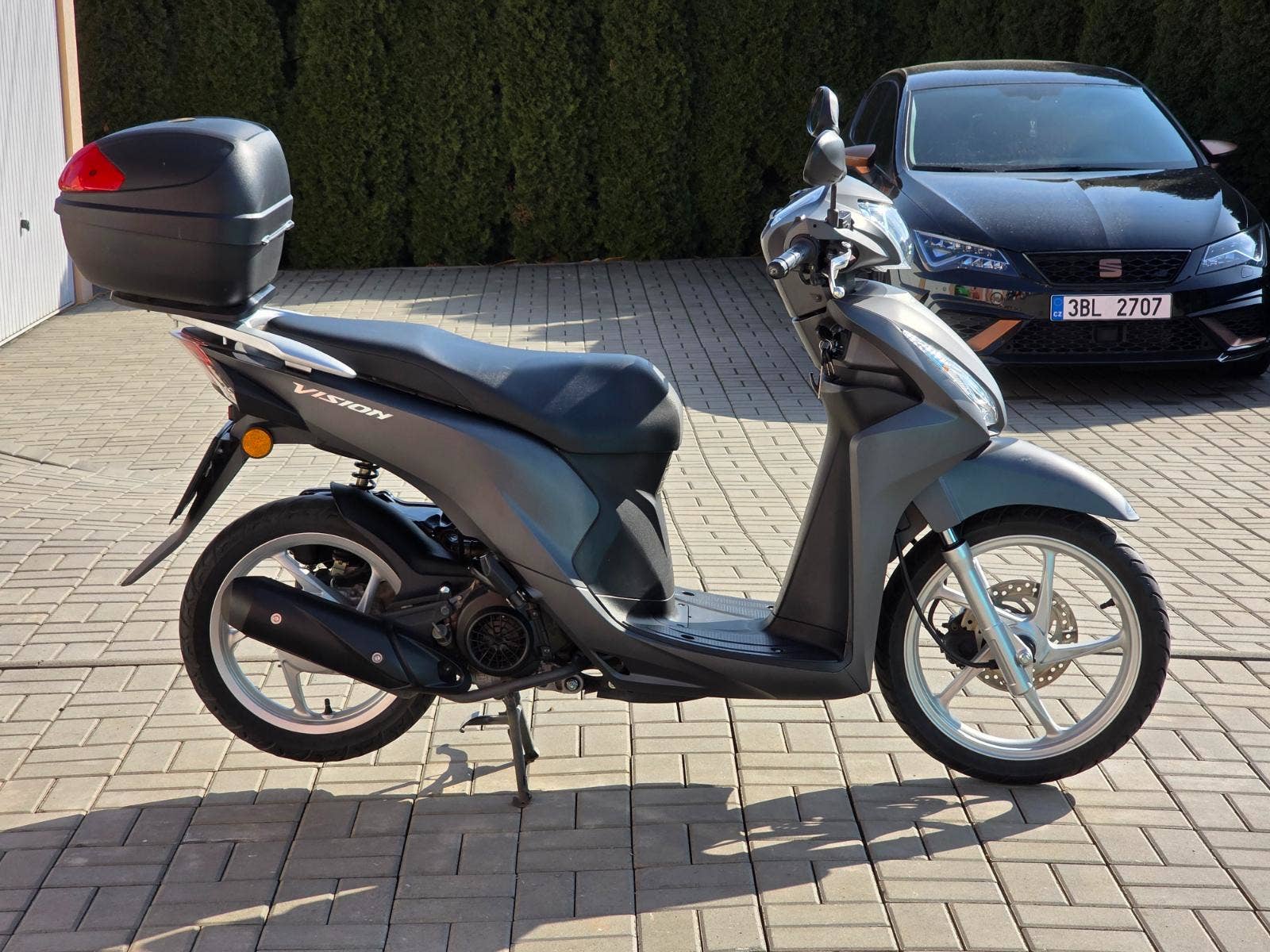 Prodám Honda Vision 110 v šedé matné barvě, rok výroby 2019, najeto 26.200 km, výkon motoru 6,5 kW, objem motoru 108cm3, STK platná do 3/2029. Skútr byl zakoupen nový v Honda Autoelegance Brno, po celou dobu jeden majitel. Pravidelný servis, zapsáno v servisní knížce. Spotřeba 2L na 100 km. Na skútru je navíc zadní kufr. Celkově v hezkém originálním stavu. Původní cena i s příslušenstvím byla 58.000,