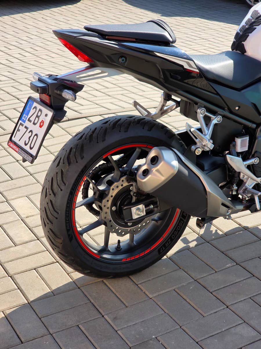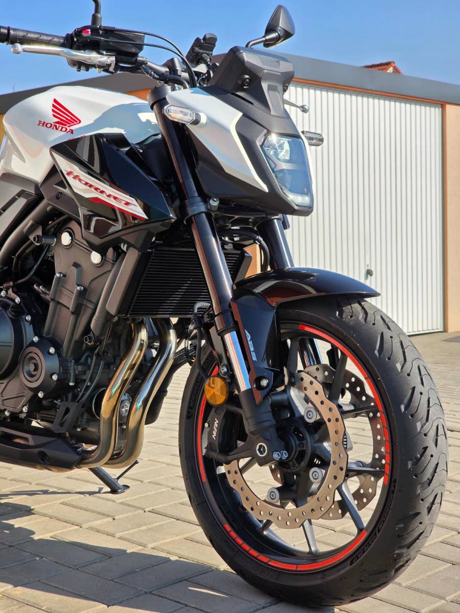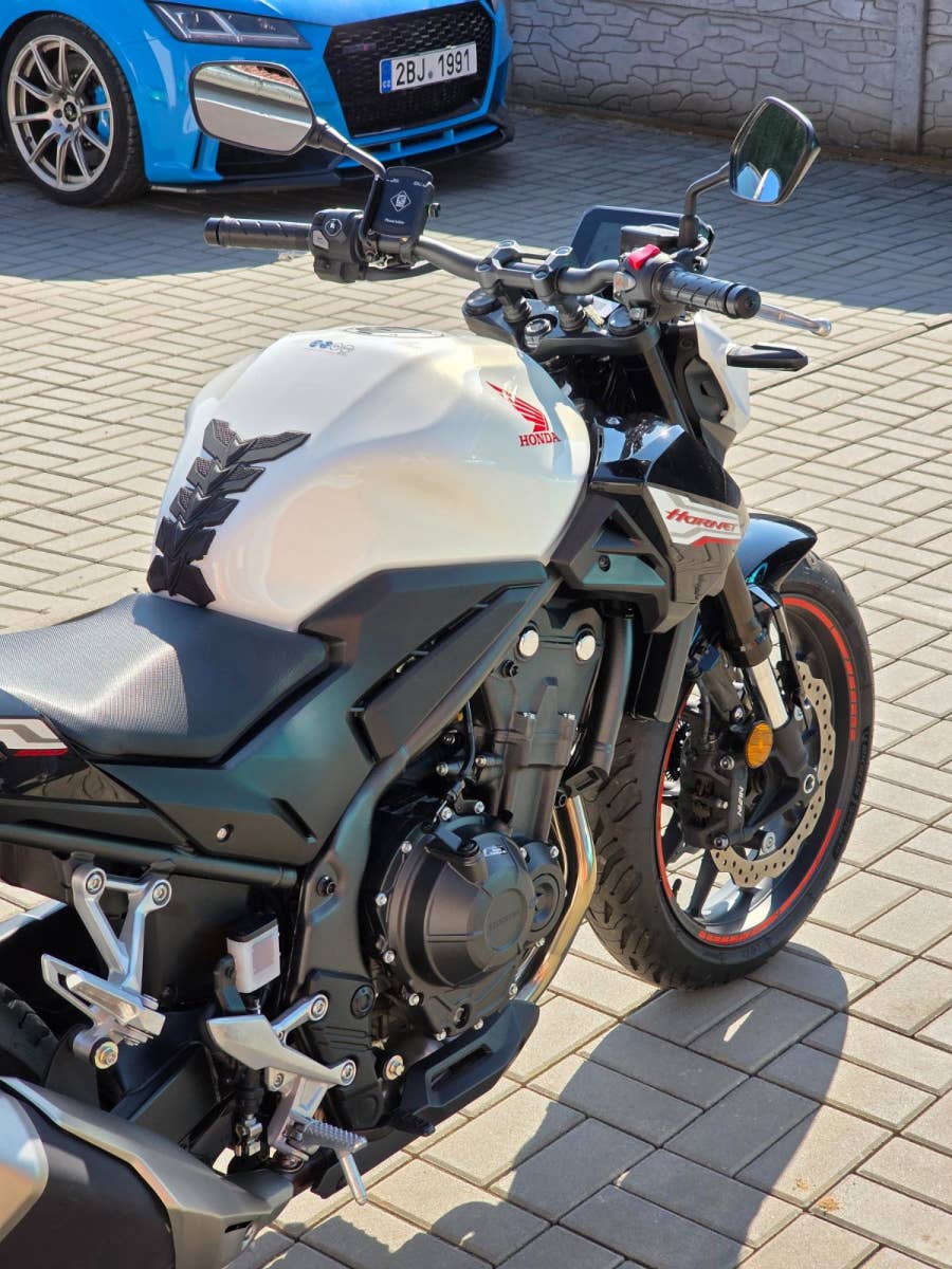 Prodám Honda CB 500 F Hornet, rok výroby 2025, najeto pouze 4.300 km, výkon 35 kW, objem motoru 471cm3, STK platná do 5/2031. Ještě v tovární záruce Honda. Motorka byla zakoupena jako nová u autorizovaného prodejce Honda Autoelegance Brno. Motorka po prvním garančním servisu v 1000 km a pak po roce v 5/2025 při 2.622 km. Motorka celkově v perfektním stavu, nebyla nikdy havarovaná ani lakovaná po celou dobu garážovaná. Poctivě zajeto a celkově ježděno v klidu čemuž odpovídá i průměrná spotřeba 3,8L za celých 4.300 km. Navíc dokoupen originální Honda centrální stojan a držák na telefon. Tento model má již dvě kotoučové brzdy vpředu, TFT barevný displej, kontrolu trakce apod.