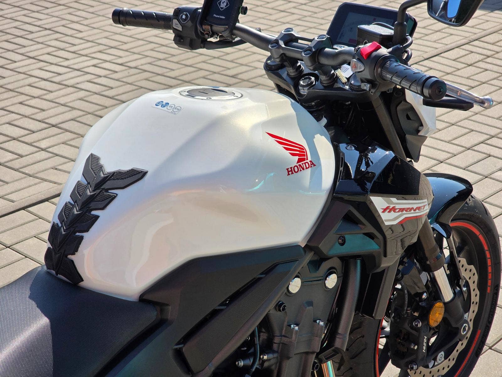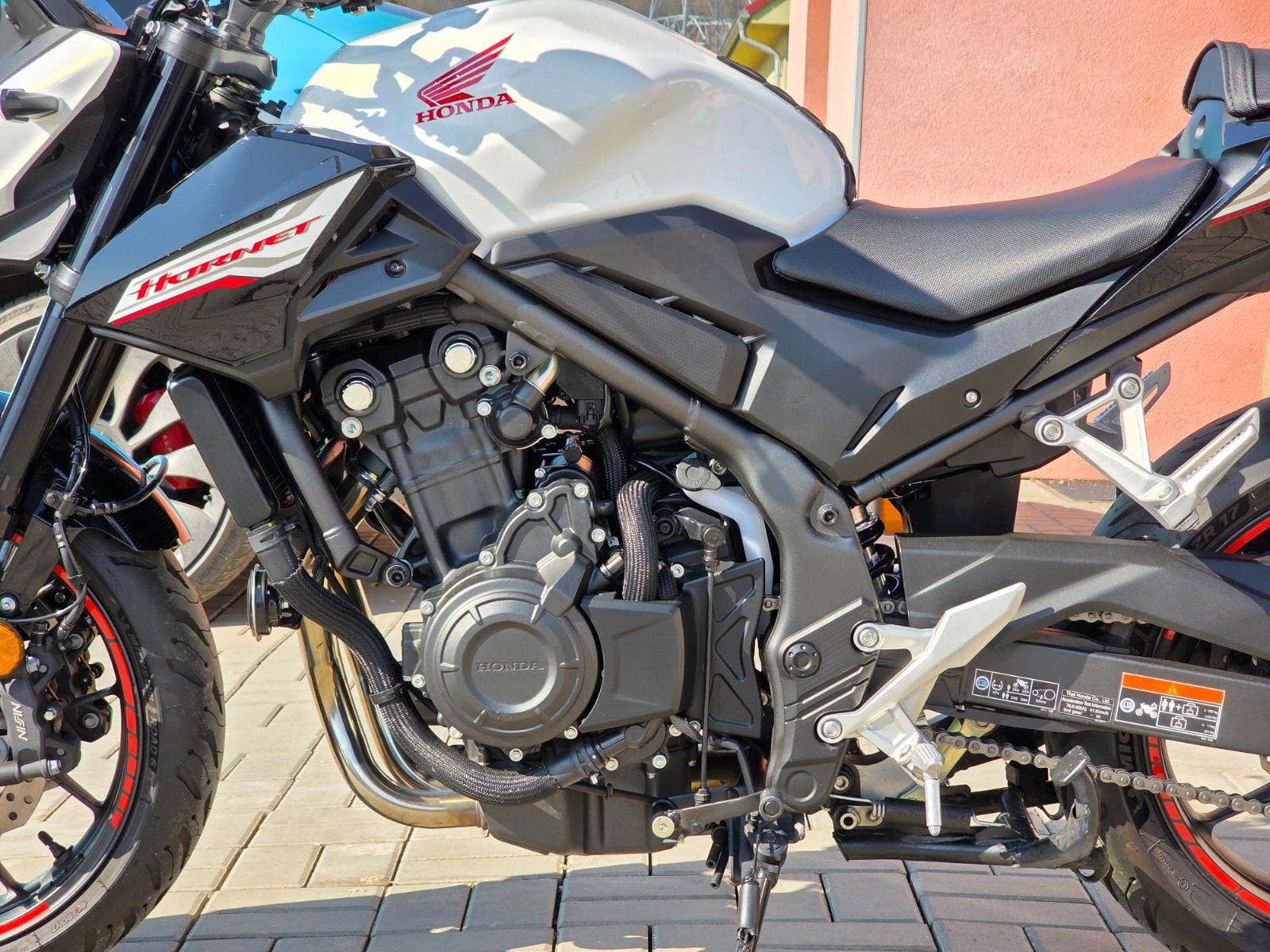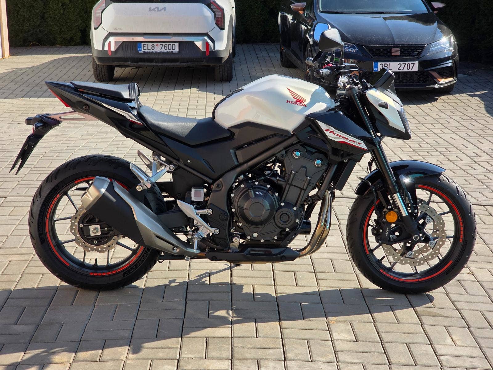 Prodám Honda CB 500 F Hornet, rok výroby 2025, najeto pouze 4.300 km, výkon 35 kW, objem motoru 471cm3, STK platná do 5/2031. Ještě v tovární záruce Honda. Motorka byla zakoupena jako nová u autorizovaného prodejce Honda Autoelegance Brno. Motorka po prvním garančním servisu v 1000 km a pak po roce v 5/2025 při 2.622 km. Motorka celkově v perfektním stavu, nebyla nikdy havarovaná ani lakovaná po celou dobu garážovaná. Poctivě zajeto a celkově ježděno v klidu čemuž odpovídá i průměrná spotřeba 3,8L za celých 4.300 km. Navíc dokoupen originální Honda centrální stojan a držák na telefon. Tento model má již dvě kotoučové brzdy vpředu, TFT barevný displej, kontrolu trakce apod.