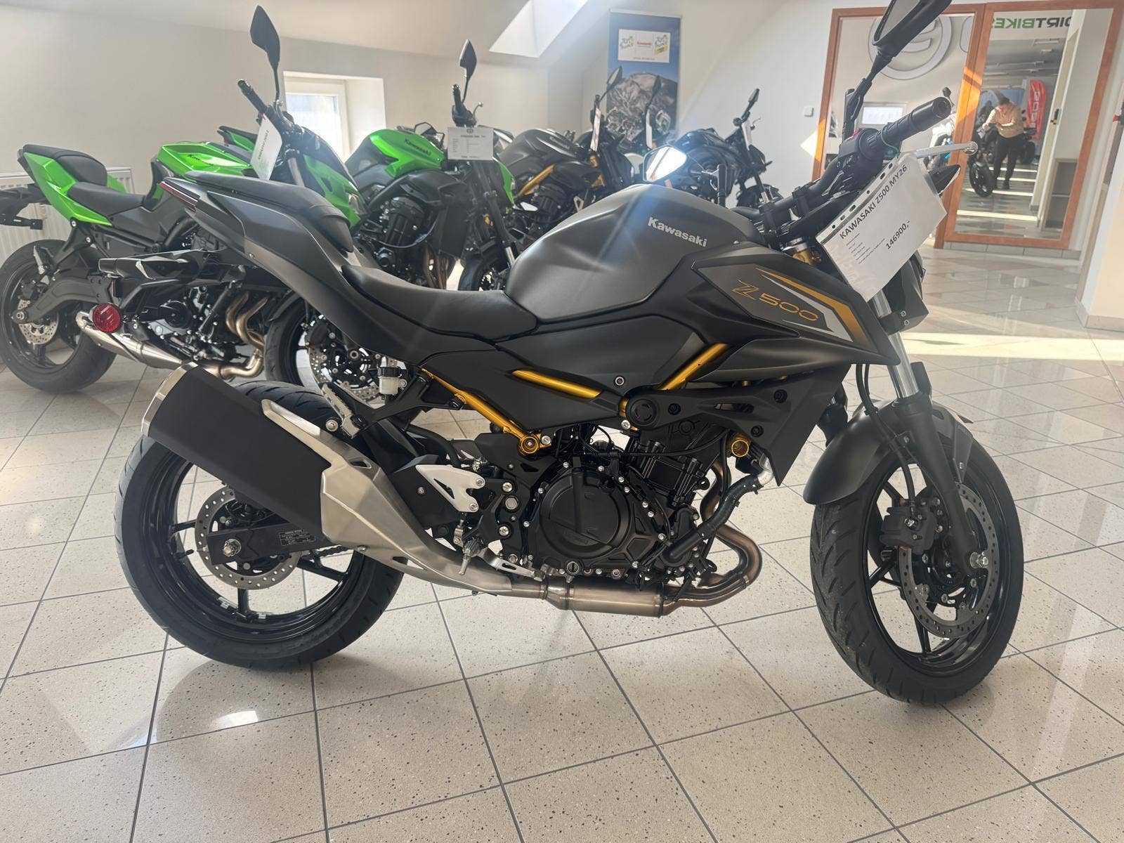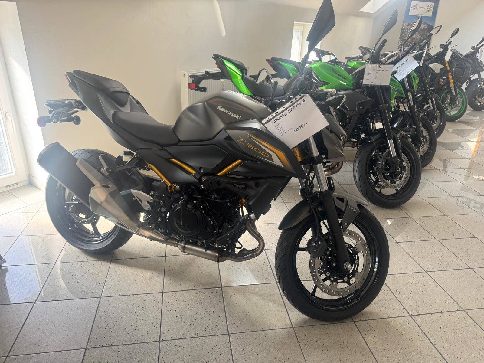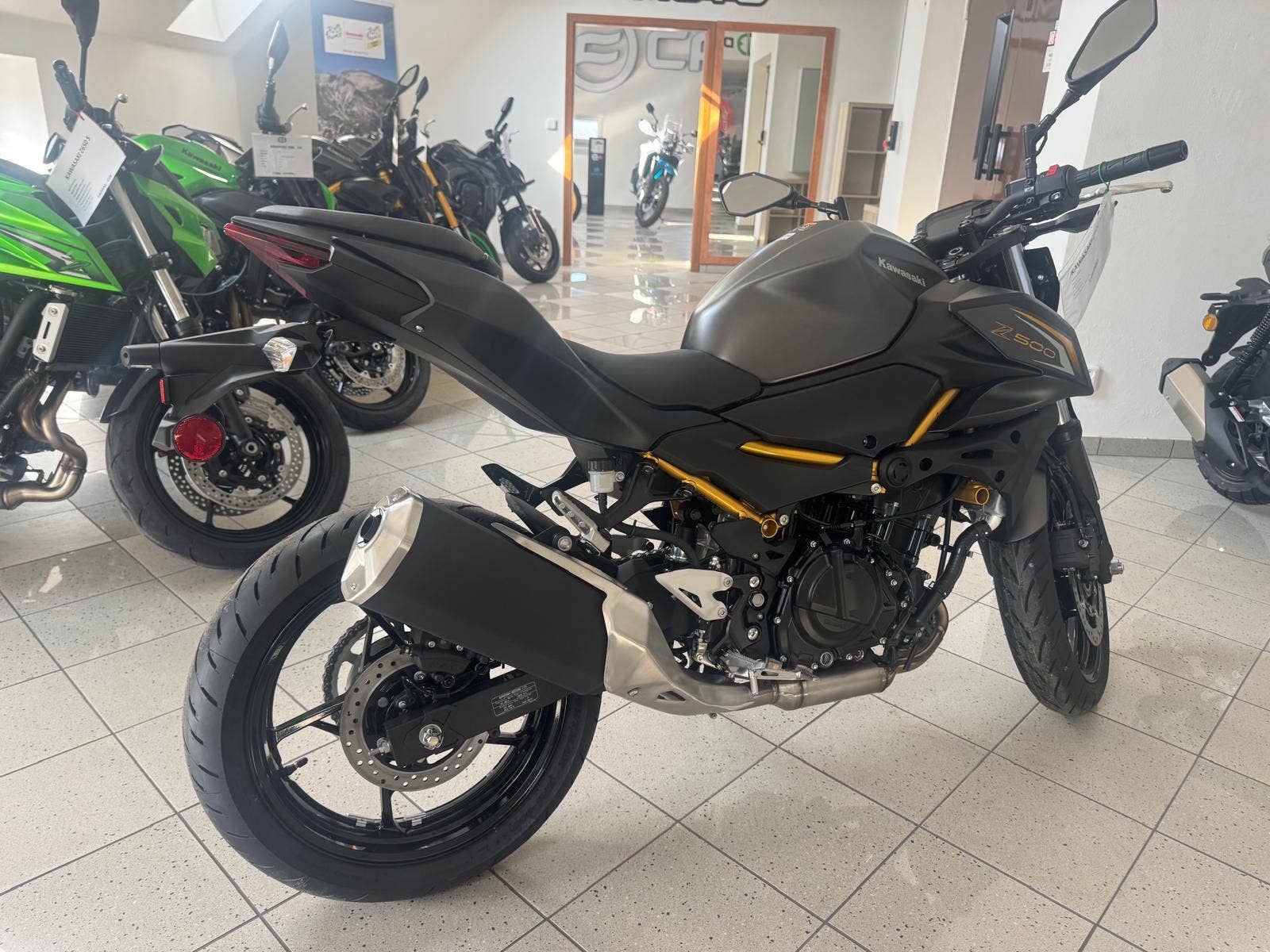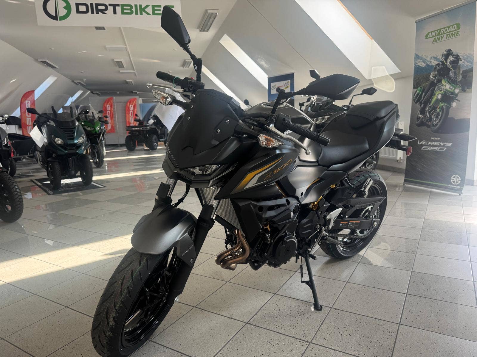 Přivítejte žhavou novinku od Kawasaki - zcela nový Z500! Agresivně stylizovaný Z500 je vyveden v temné šedo černé metalíze a je poháněn zcela novým řadovým dvouválcovým vodou chlazeným motorem vybaveným asistovanou antihopingovou spojkou. Tato nová pohonná jednotka je umístěna v lehkém příhradovém trubkovém rámu Trellis. Mladí, ale i zkušení jezdci využijí mrštnost a výhody hbitého zatáčení a změn směru a též okamžitou odezvu na plyn u nové agilní pohonné jednotky. O bezpečné zastavení se starají výkonné brzdy o velkém průměru. Nově je Z500 vybavena, barevným LCD přístrojovým panelem a Full LED osvětlením. Z500 samozřejmě splňuje všechny požadavky pro řízení s řidičským oprávněním skupiny A2