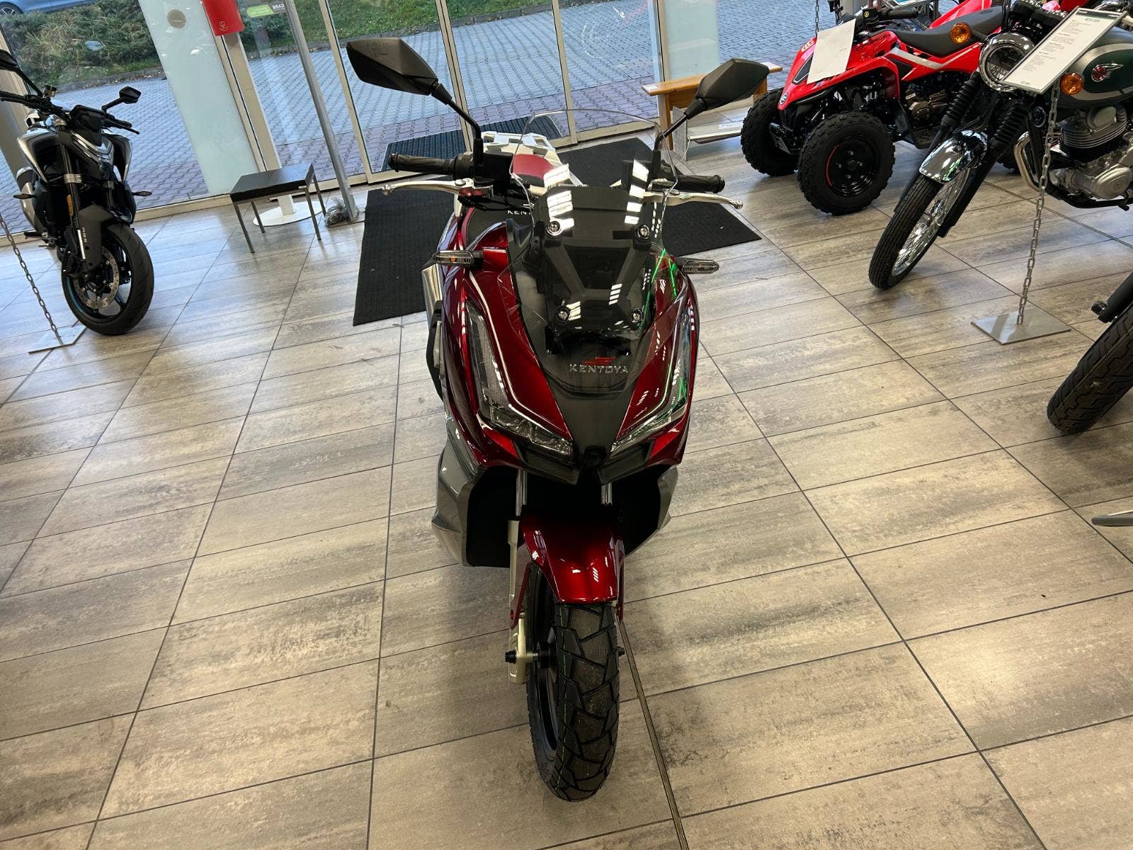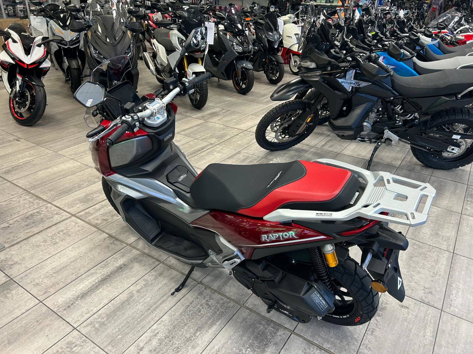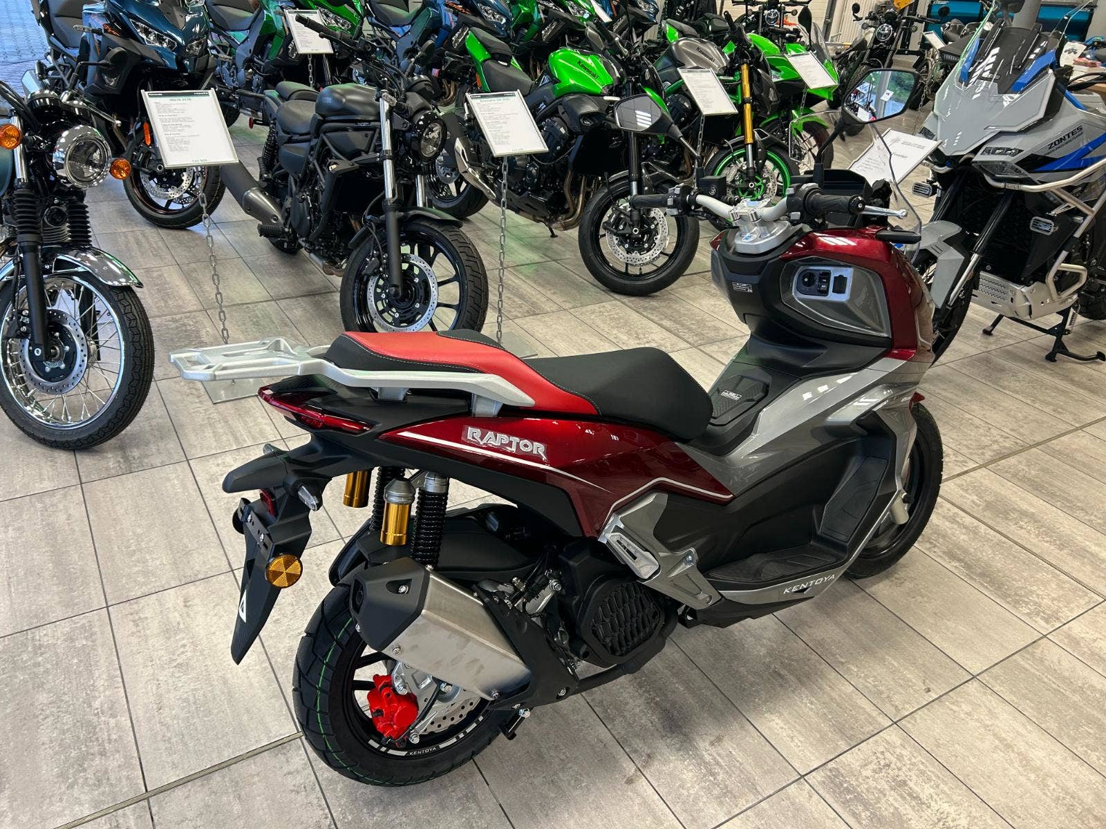 Raptor - novinka, která konkurenci nedá spát. Kvalita a zpracování prémiových značek, design podle posledních trendů, vynikající ergonomie a stabilita v zatáčkách. Novinka se zcela novým, kapalinou chlazeným motorem, disponuje nejvyšším výkonem, jaký kdy Kentoya v této třídě nabídla. Poprvé s ABS systémem pro bezpečnost jezdců, navíc LED světlomety, přehledný, barevný, 8 palcový display s možností sdílené navigace, podsvícená tlačítka, start stop systém plus další technické novinky. Výkonný motor přináší nepoznanou akceleraci ve všech otáčkách a jízdní pozice je pro ostatní konkurenci měřítkem komfortu. Full led světlomety, tichý chod motoru, nízká spotřeba, silné kotoučové brzdy s ABS systémem a stavitelný ochranný štít definují budoucnost, kudy se skútry Kentoya budou ubírat.