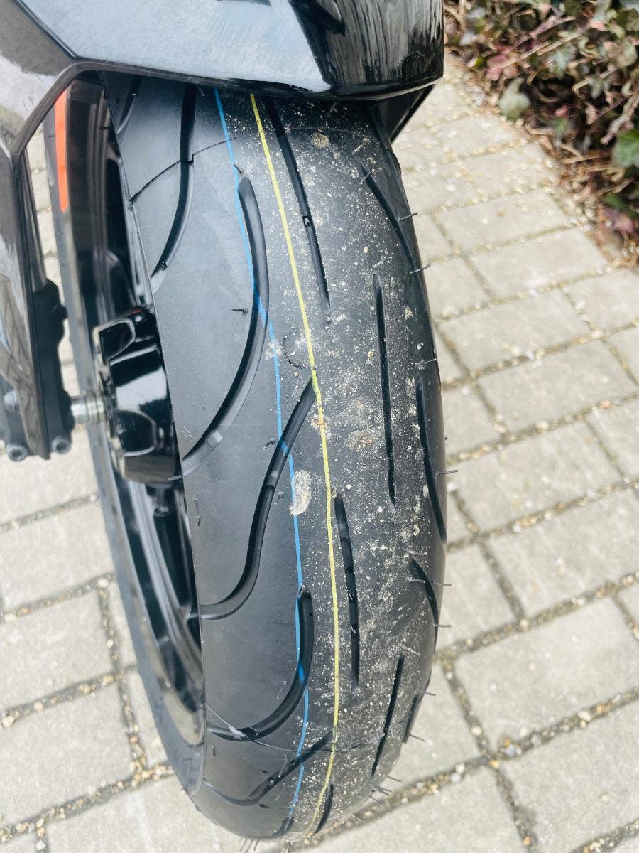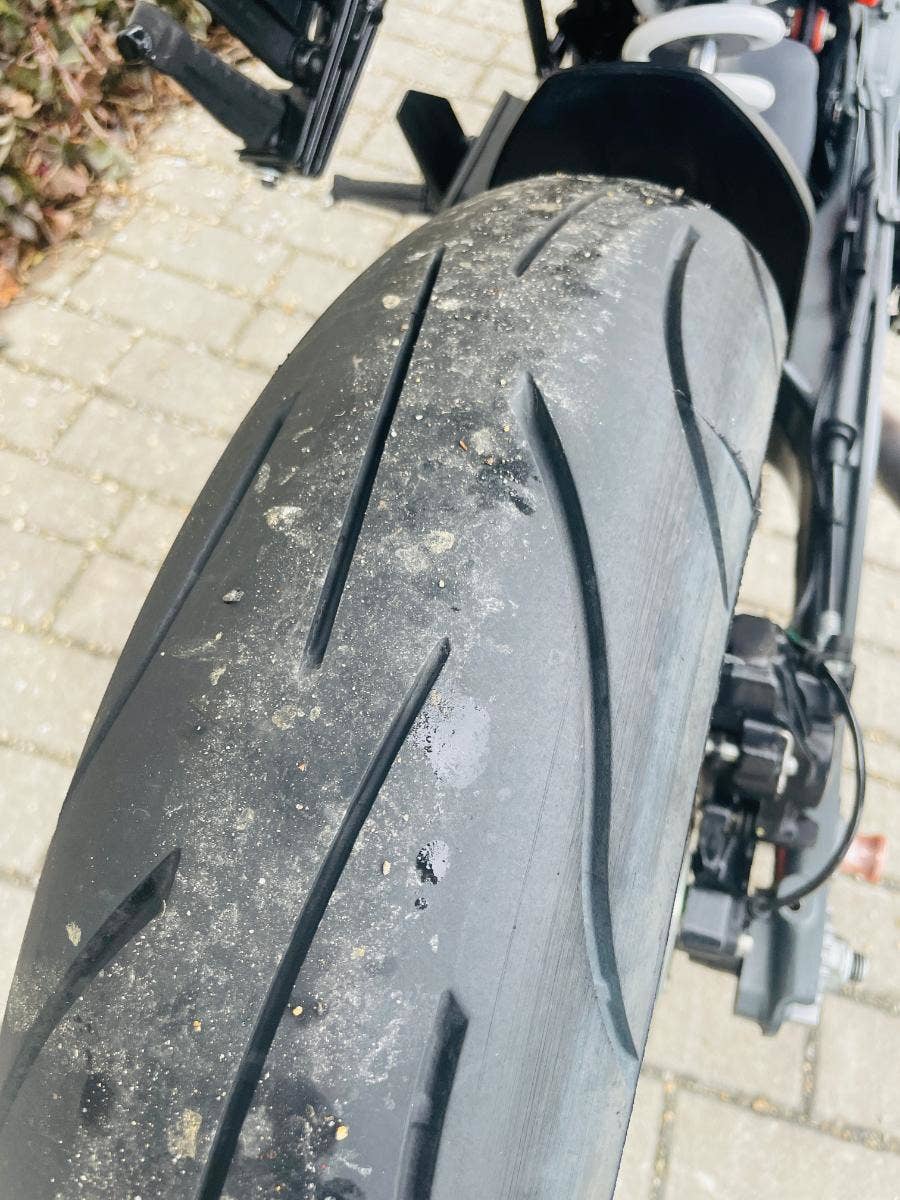 uplně nová přední pneu, zadní 90%, brzdy a řetězová sada OK, na olej najeto od poslední výměny cca 1000 Km