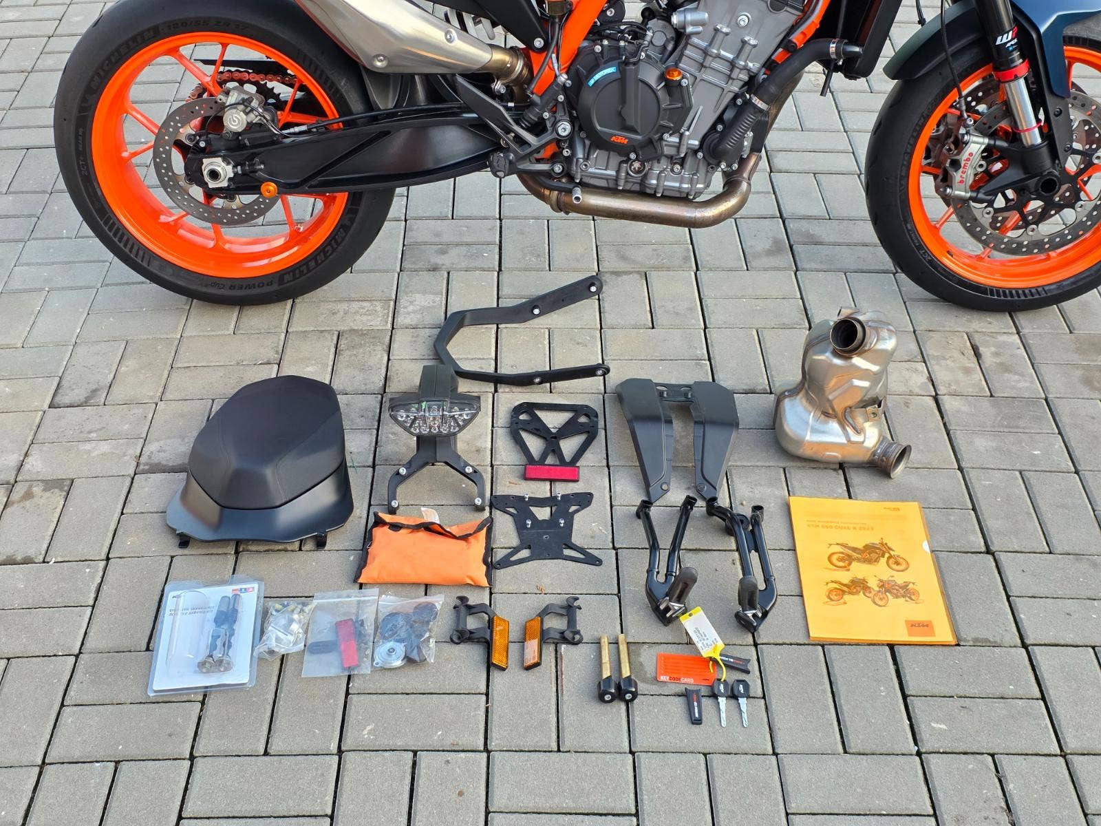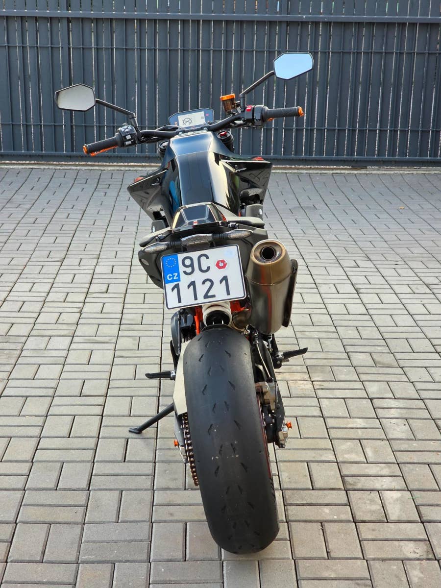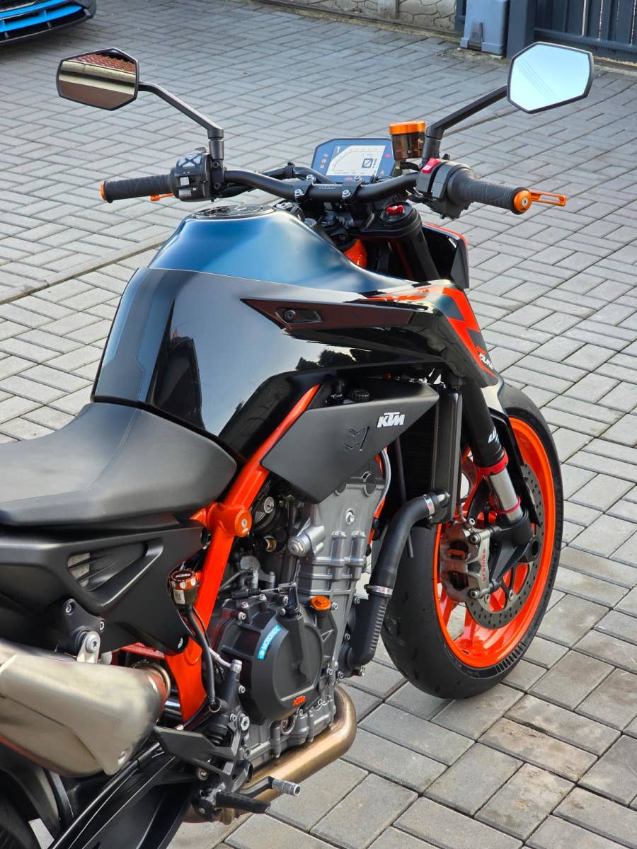 Prodám KTM Duke 890R, rok výroby 2023, najeto 9.500 km, výkon 89 kW, objem motoru 889cm3, STK platná do 7/2029. Motorka zakoupena jako nová u autorizovaného prodejce KTM KAUDELA Motorsport. Jedná se o verzi R, která má oproti obyčejnému Dukovi 890 lepší tlumiče plně nastavitelné WP Apex, brzdy Brembo Stylema a 320mm kotouče, radiální brzdová pumpa Brembo, vylepšené nastavení kontroly trakce, 6D snímač úhlu náklonu, sportovnější ergonomie, lehká kola v oranžové barvě, pneumatiky Michelin Powercup II, vyšší výkon a nižší váhu. Nakoupené origiální doplňky a výbava za více jak 40.000Kč Power Parts a to Track Pack (Track jízdní režim, Launch Control, vypnutí Anti-Wheelie, devítistupňové nastavení kontroly trakce a úprava odezvy plynu), tempomat, rychlořazení Quickshifter+, nastavitelné zalamovací páčky, držák RZ, víčka nádobek na brzdovou kapalinu, závažíčka řídítek, zátka na olej a olejový filtr, zátky na rámu, rolny. Navíc je dokoupený mezisvod pro odstranění katalyzátoru a nahraná palivová mapa přímo v KTM pro výfuk bez katalyzátoru cca 125koní. (lze vrátit zpět a přehrát mapu kdekoli v KTM). Všechny originální díly k motorce. První servis po zajetí v KTM (další servis dle manuálu je až v 15.000km), ale dělala se výměna oleje (Motorex 10W50) a filtru každých 2.000 km takže poslední výměna oleje v 9.000 km. Původní cena takto vybavené motorky byla 375.000Kč.
