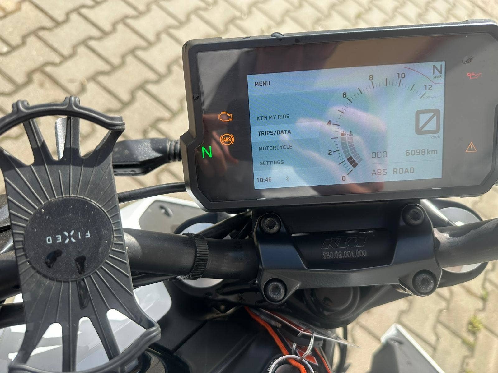 Na motocyklu doplňkově padací protektory na rámu, držák telefonu FIXED.