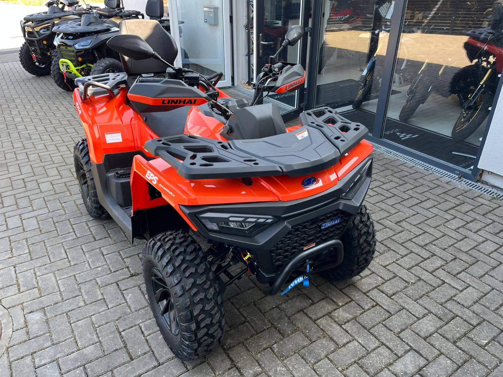 Linhai ATV 550L LANDFORCE EPS, EFI, T3b. Nová čtyřkolka. Výkon 26 kW, čtyřtaktní jednoválec SOHC, 493 cm3, 36 koní. Užitková / pracovně-rekreační čtyřkolka, T3b, dlouhý rozvor, vysokovýkonné Full-LED světlomety, LED světla pro denní svícení, přední LED blinkry, posilovač řízení EPS, automatická převodovka, L/H/N/R, pohon 2x4 / 4x4 s uzávěrkou diferenciálu, nezávislá dvojitá A-ramena, 4x kotoučová brzda, tažné zařízení, kompozitní nosiče vpředu a vzadu, el. naviják 3000lbs s nylonovým lanem a dálkovým ovládáním, 12" ALU kola, 25" pneumatiky Bulldog, prošívaná sedačka spolujezdce a opěrka zad.