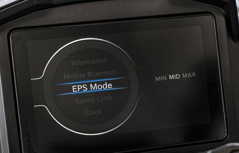 Tři úrovně EPS asistence (MIN-MID-MAX) umožňují optimalizovat odpor řízení podle podmínek a stylu jízdy. Systém snižuje námahu při manévrování, zvyšuje stabilitu ve vyšší rychlosti a zlepšuje celkovou kontrolu nad strojem v terénu.
