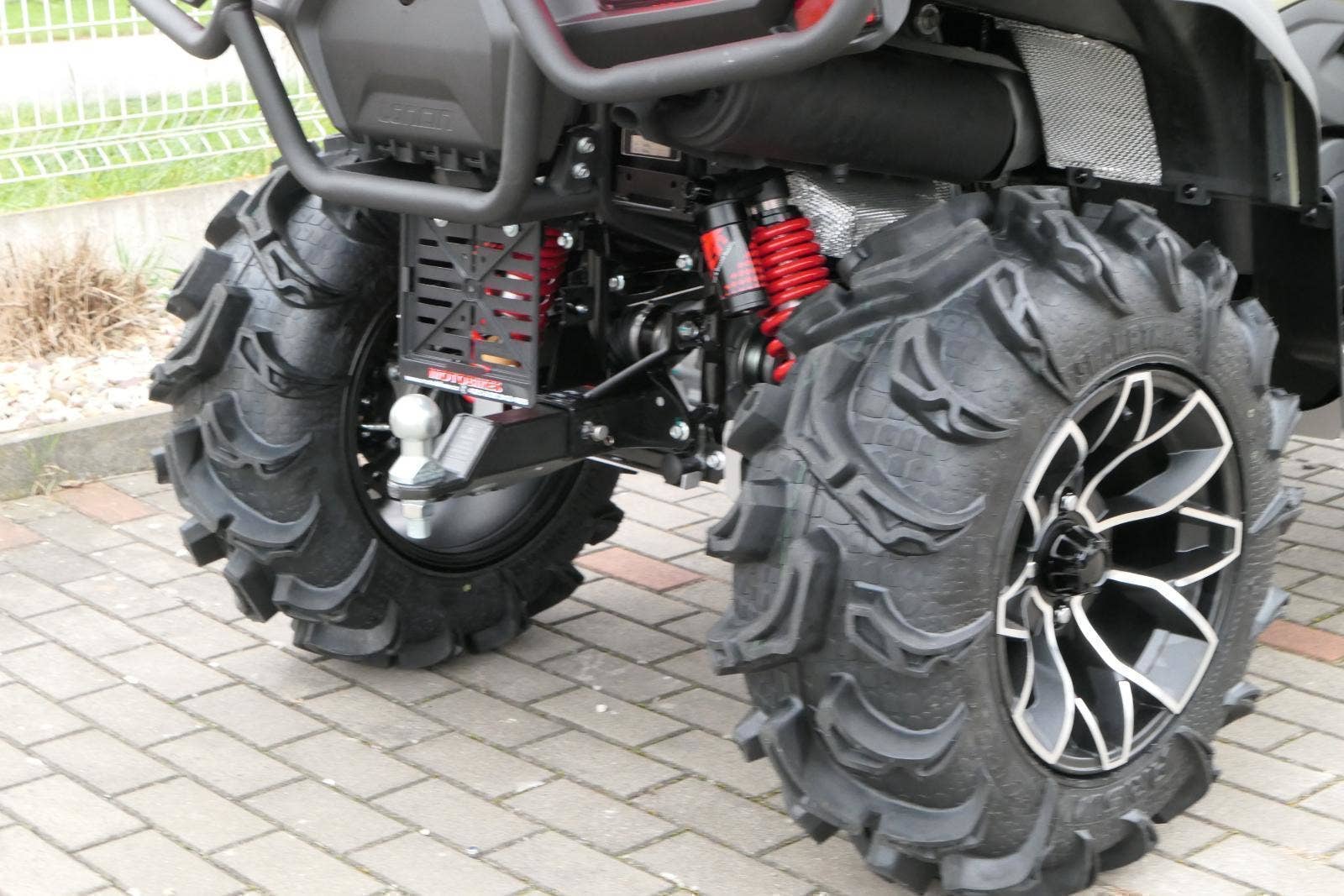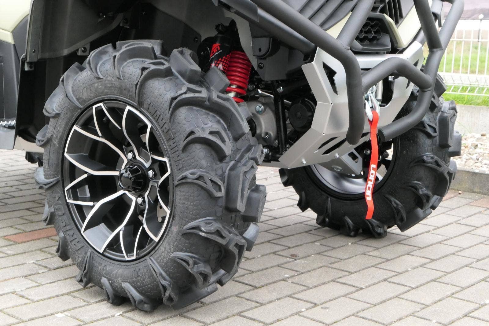 ✓ Větší pneušky s brutálním vzorkem. I když ta zdrobnělina tu fakt nesedí. Je to spíš brutální vzor. Oproti bráchovi mám i větší velikost gum. Vpředu nosím 27×9-14". Vzadu dokonce 27×11-14".