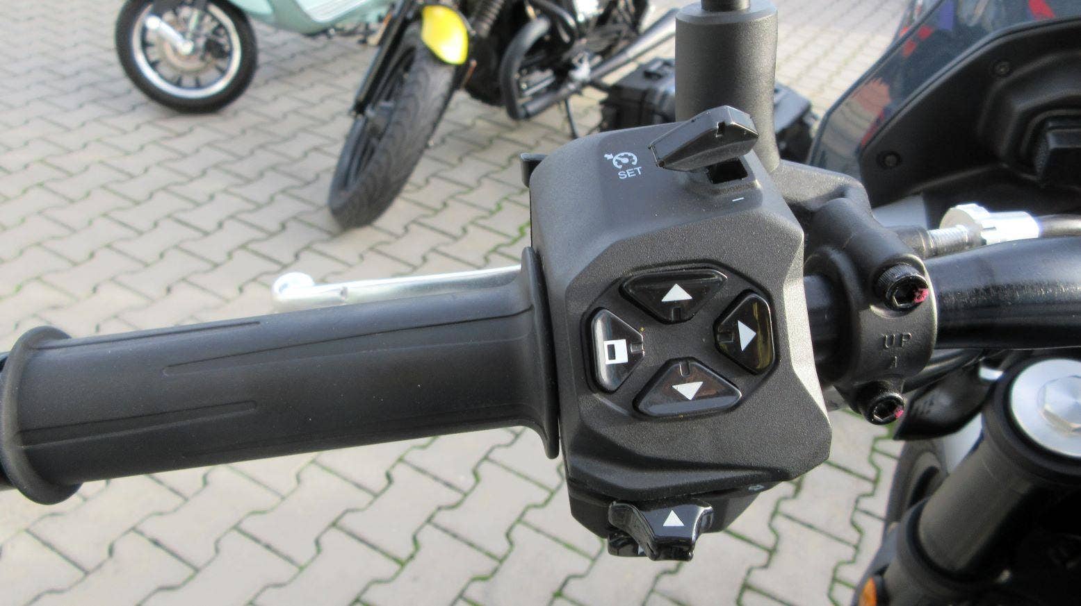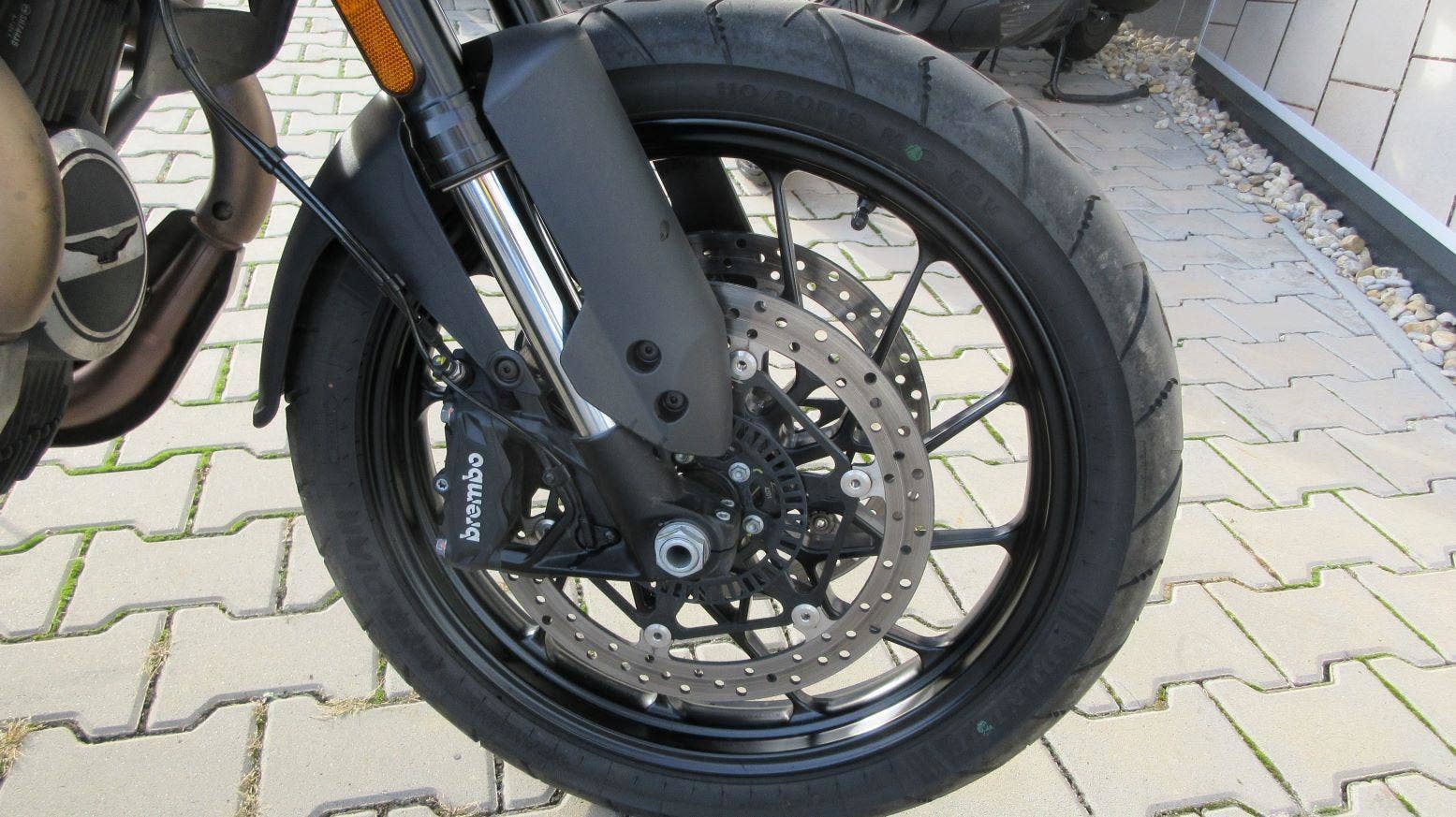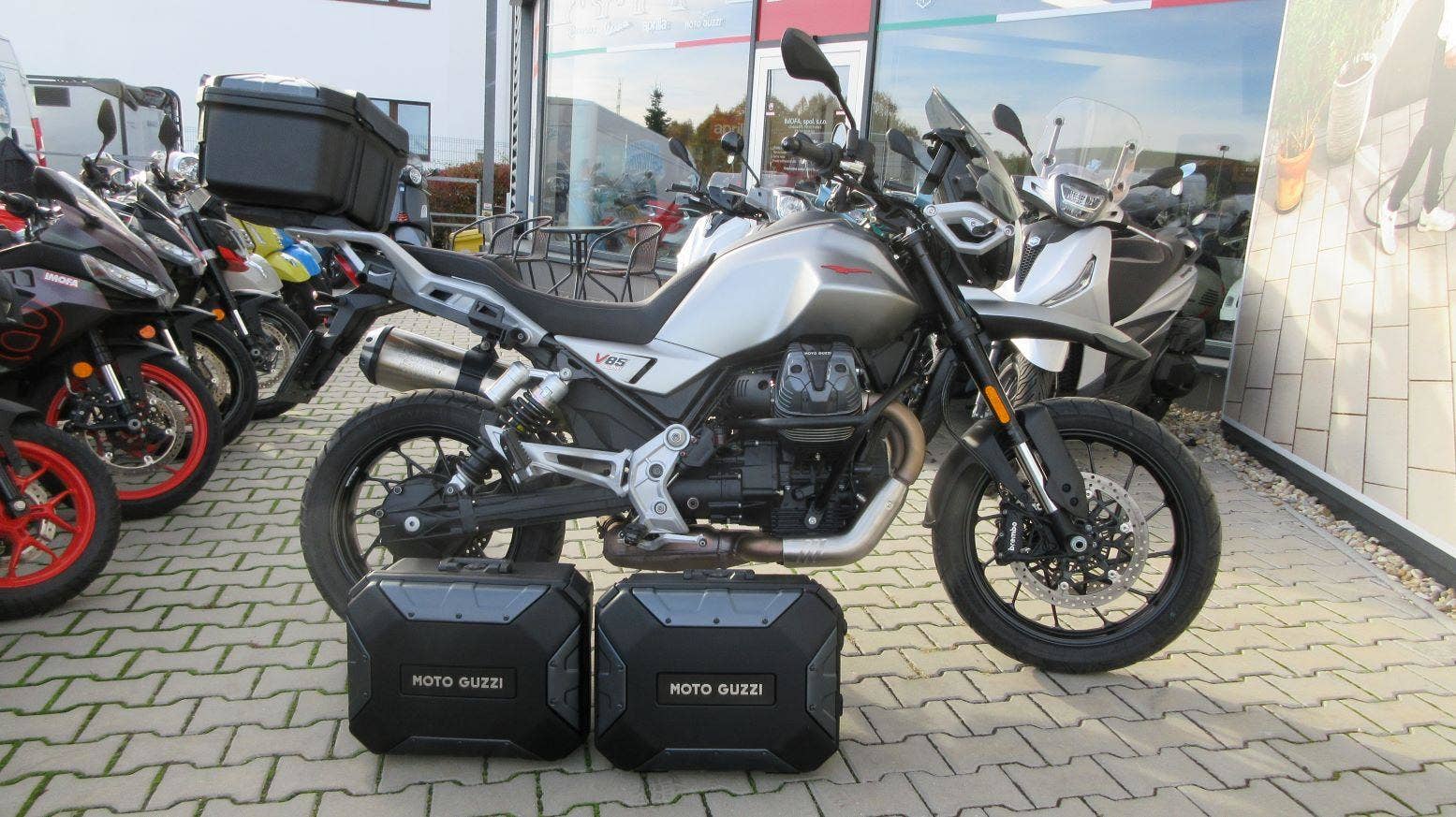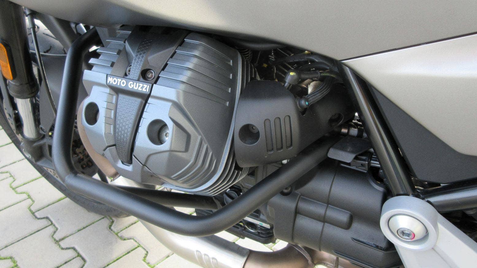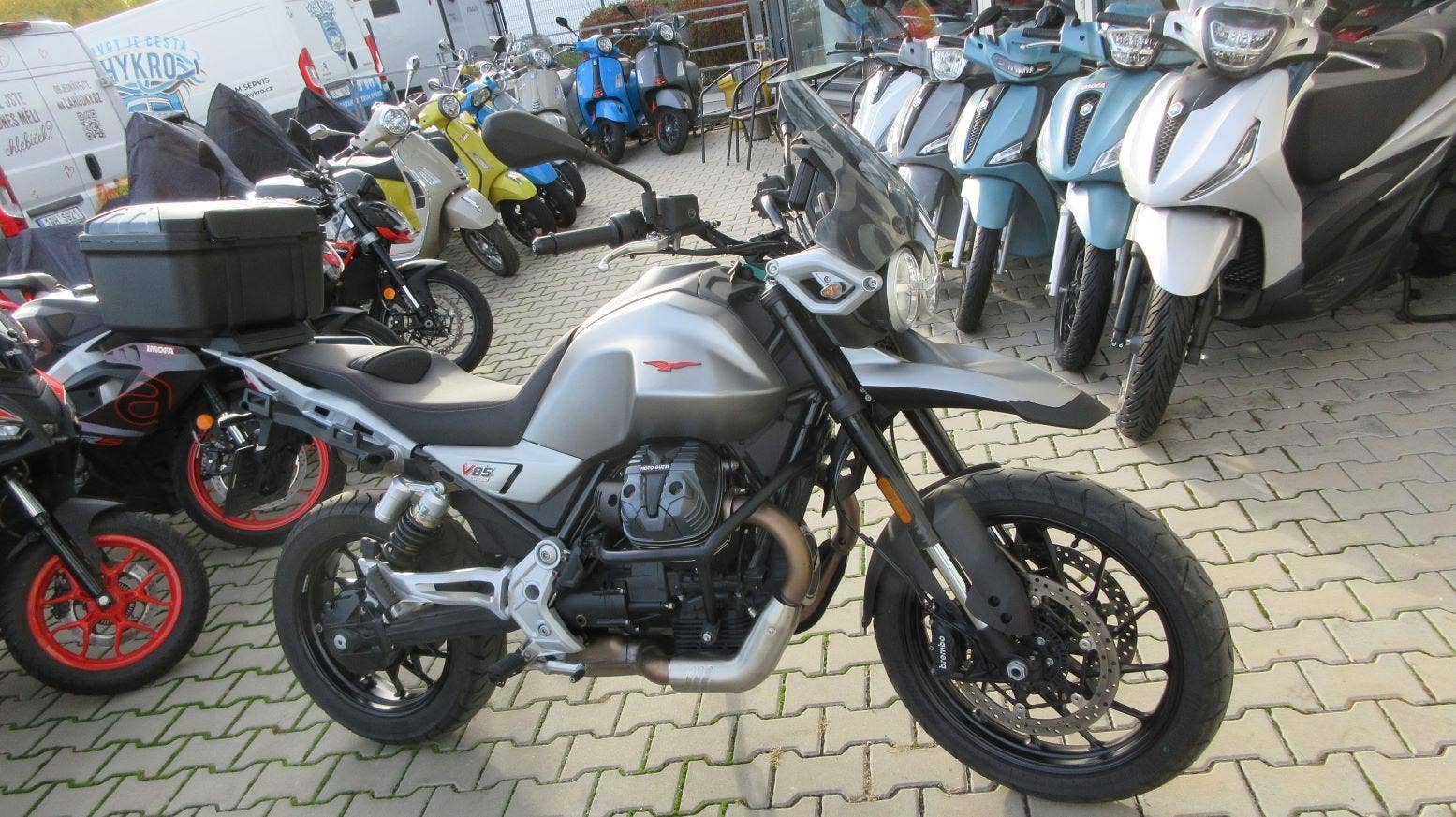 Testovací V85 Strada v kovově šedé matné metalíze. Lehký, svižný, výletní motocykl, který se nebojí i dlouhých cest - viz. letošní cestopisy v MotorBiku ;-) Strada disponuje 3 palivovými mapami, kontrolou trakce, ABS, LED světlomety s DRL, palubním počítačem, tempomatem a naše má ochranný rám motoru. Cena je za motocykl v základním provedení!