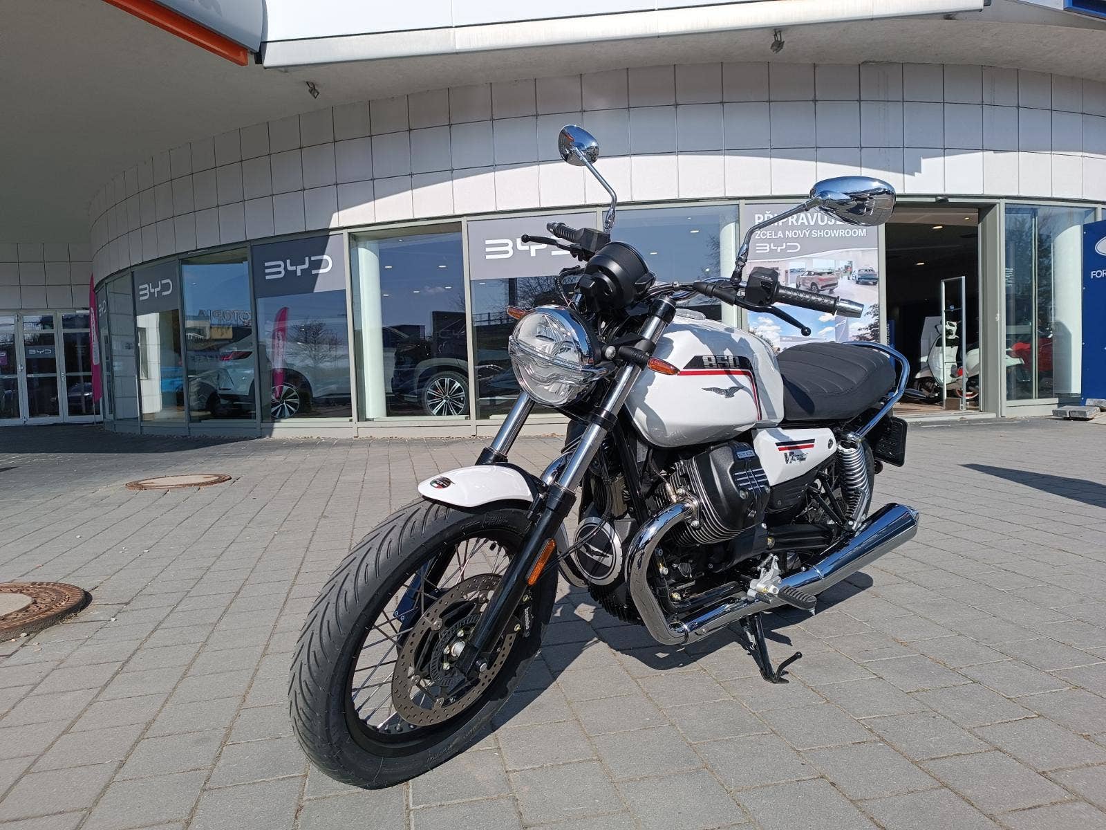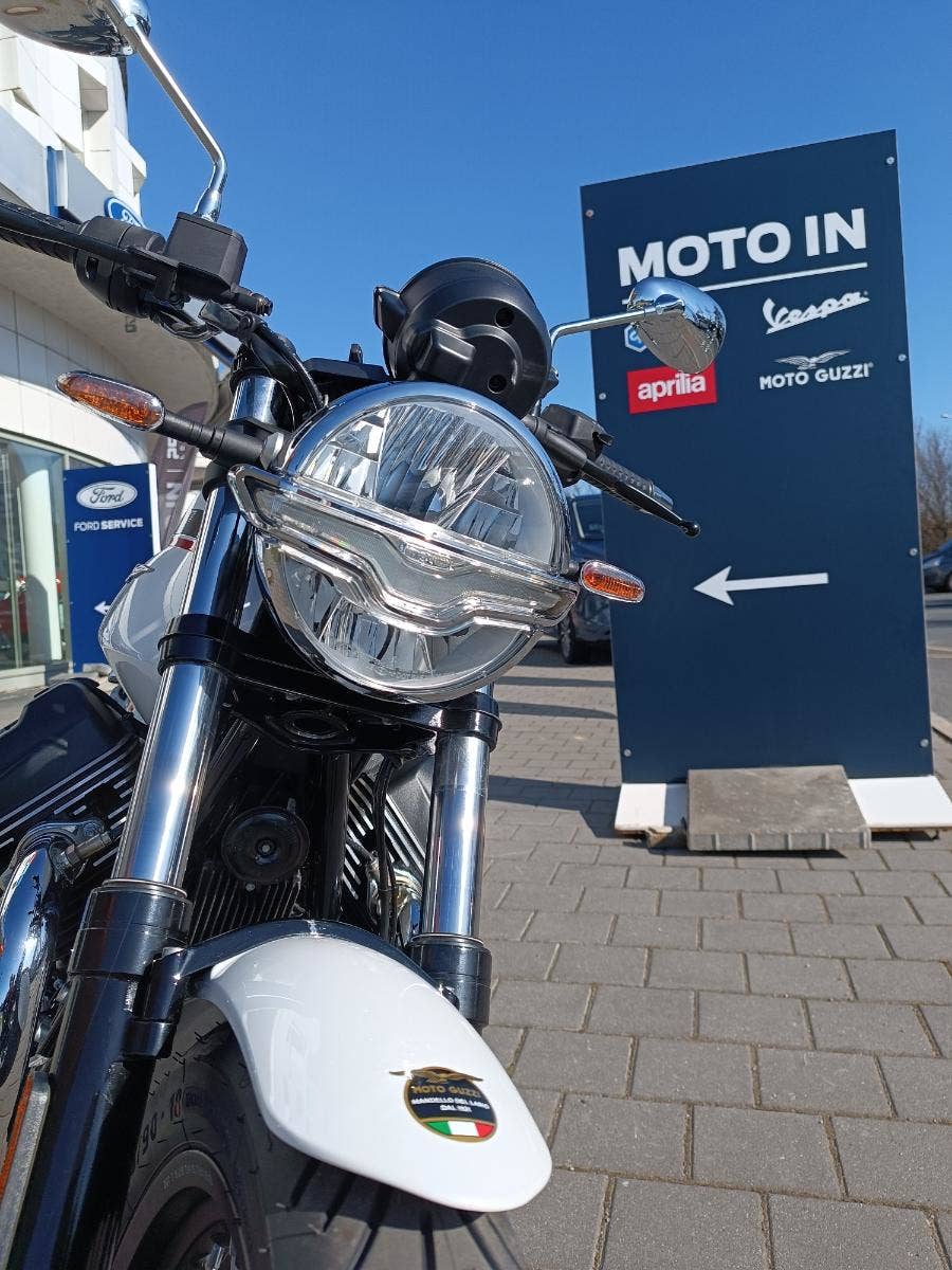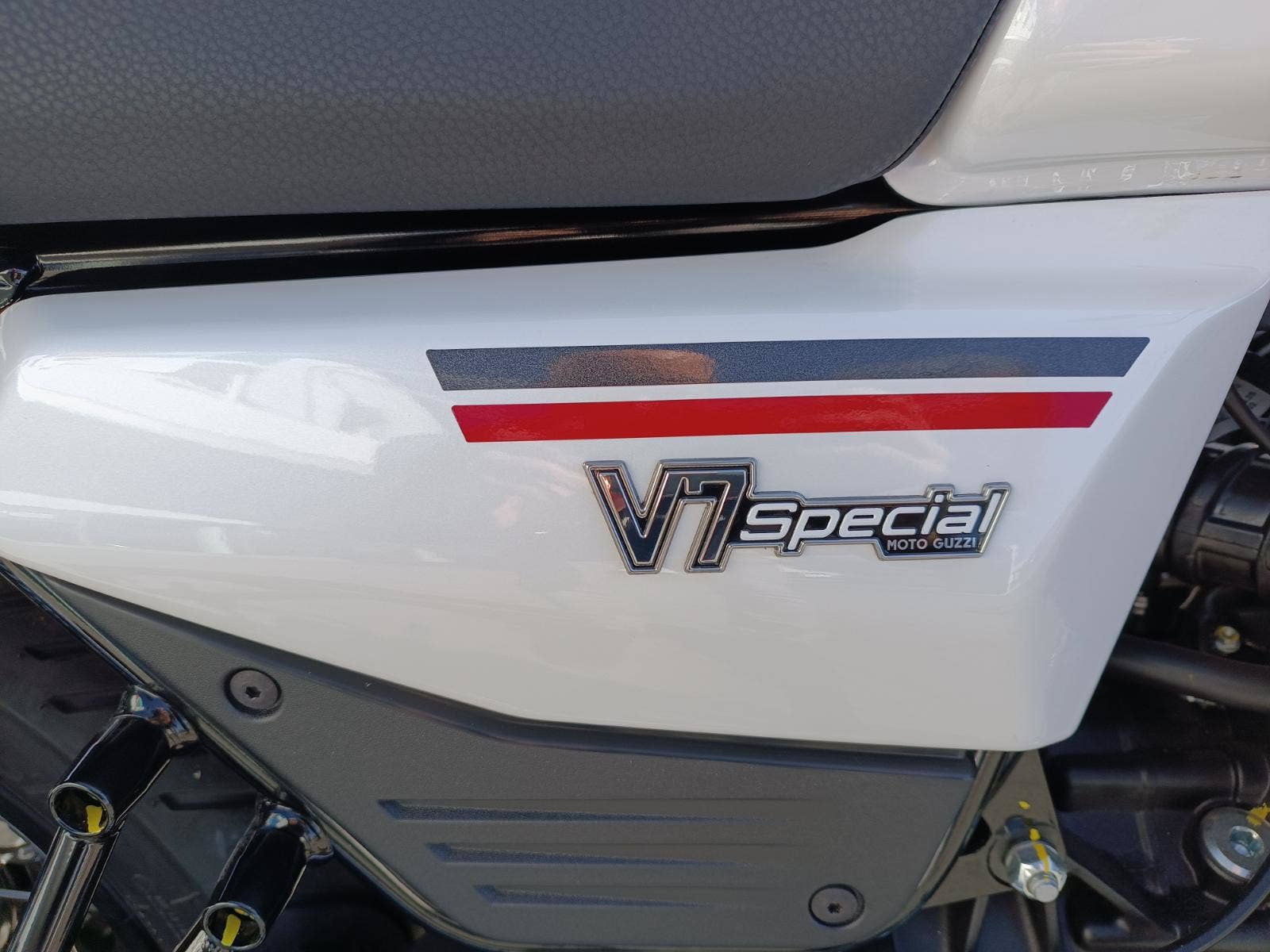 Ikonický design modelu V7 Special se projevuje chromovaným madlem spolujezdce, vyplétanými koly s lesklými kanálky a černými kryty nábojů, chromovanými světlomety a DRL světly, které vytvářejí nezaměnitelnou siluetu orla Moto Guzzi. Palivová nádrž o objemu 21 litrů, největší v kategorii, rámuje motor do V, zatímco krátký zadní blatník a koncovky výfuku dodávají elegantní vzhled liniím motocyklu. Frézované chladicí žebrování na hlavách válců a klíček zapalování s logem odrážejí legendární preciznost Moto Guzzi v detailech.