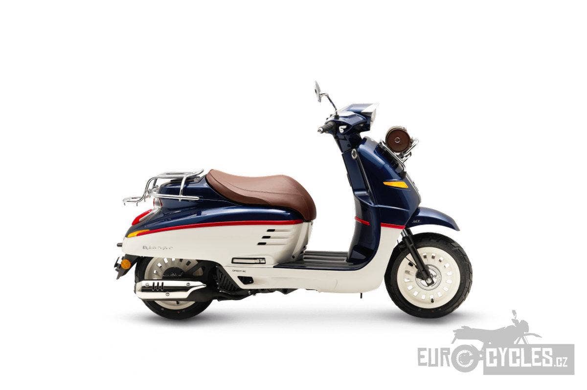 Elegantní verze skútru Peugeot Django 125i ABS TT je osazená příslušenstvím jako je například chromovaný zadní nosič + chromovaný přední nosič s taškou, který v kombinaci s nádherným dvoubarevným lakem podtrhuje odkaz legendy Peugeot Django TT. Navíc obsahuje inovovaný přední gril s ostrými liniemi a efektní LED světelný podpis v duchu aktuální automobilové řady Peugeot.
