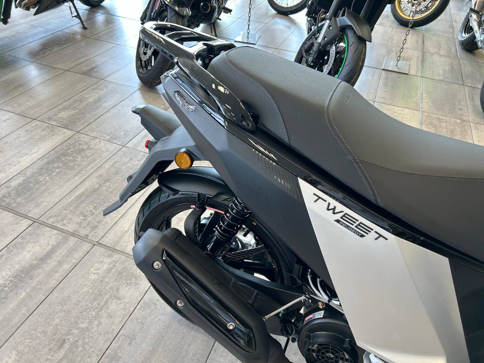 Skútr Peugeot Tweet 125i vyniká kompaktními rozměry, komfortním jízdním projevem a mimořádně úsporným provozem. Neo-retro design s typickými designovými prvky Peugeotu, jednoduché ovládání a francouzská nonšalantnost ve spojení s velkými 16" palcovými koly, kotoučovými brzdami se systémem SBC nebo ABS (dle verze), rovnou podlahou, LED osvětlením, úložnými prostory pod sedlem a pod řídítky, integrovaným zadním nosičem pro kufr nebo skvěle čitelným LCD diplejem. Vlastnosti, které jsou vhodného pro každého, kdo hledá praktický skútr pro každodenní využití s výborným poměrem ceny a užitné hodnoty.