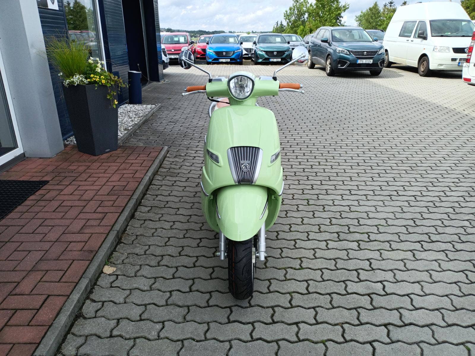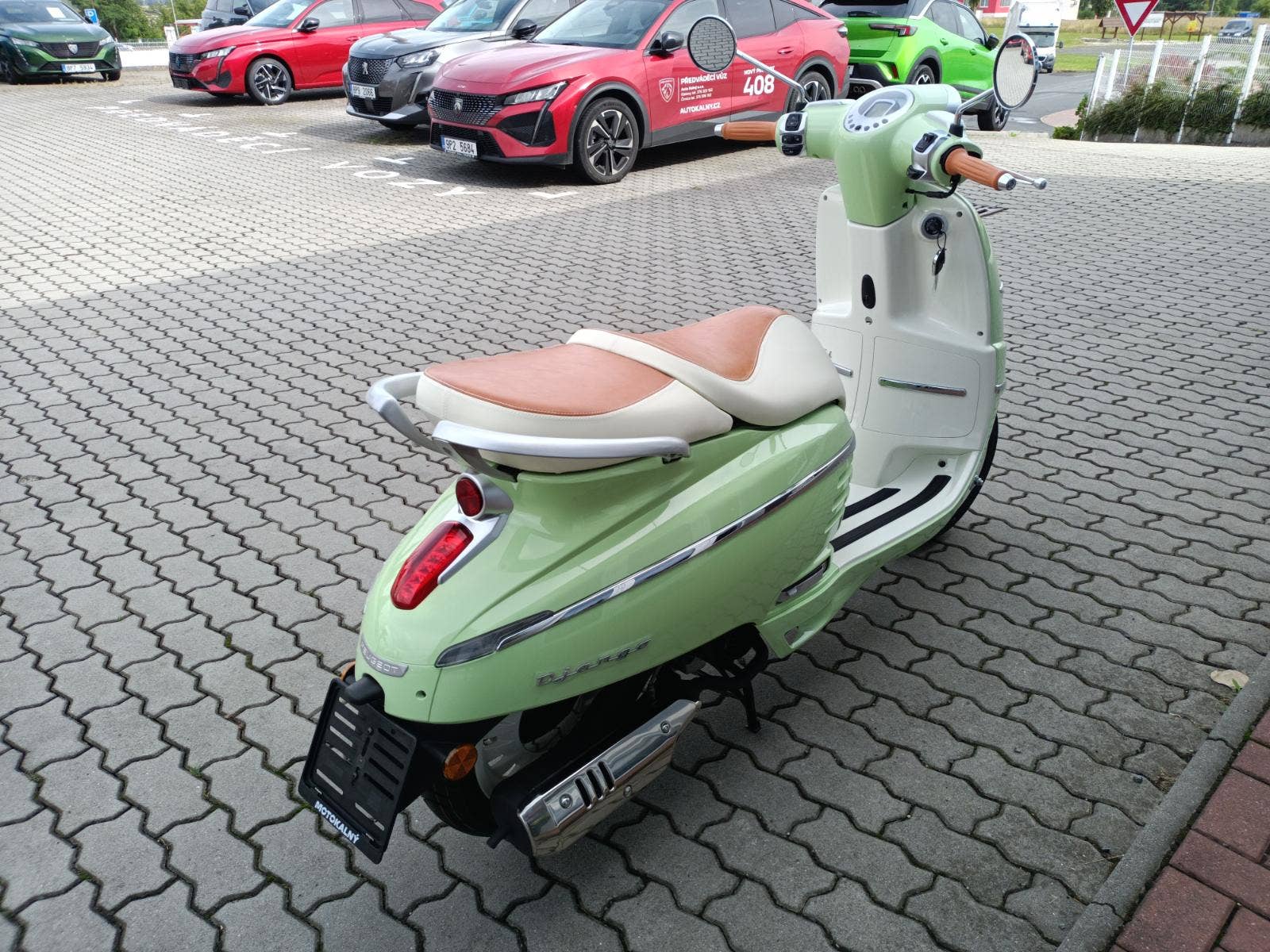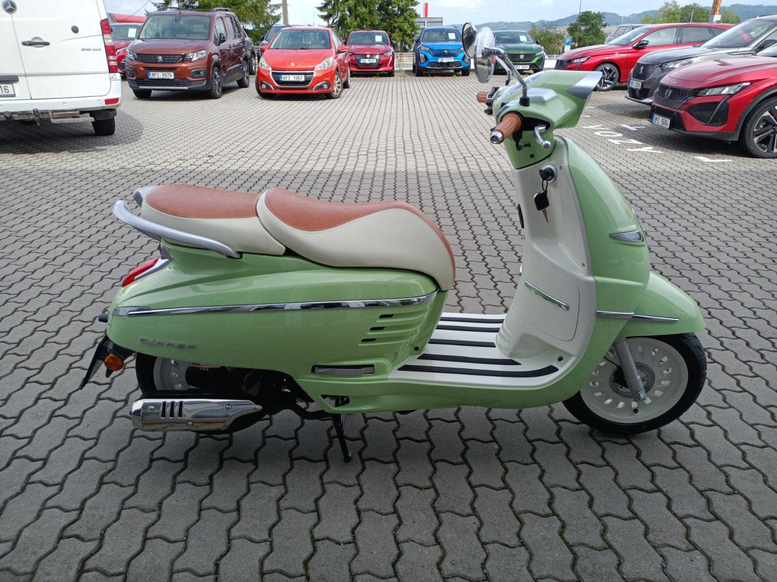 Nový skútr, 0 km. Hot Color Pistacio je barevné provedení vytváří jedinečný "retro look" a působí velice luxusním dojem. Navíc obsahuje inovovaný přední gril s ostrými liniemi a efektní LED světelný podpis v duchu aktuální automobilové řady Peugeot. Líbivý retro design doplňují moderní prvky jako motor s elektronickým vstřikováním paliva, pokročilý brzdný systém ABS, digitální informační panel, nechybí 12V zásuvka pro nabíjení vašeho smartphonu nebo uzamykatelné úložné prostory pod sedlem a ve středovém panelu. Stylový skútr Peugeot Django se nabízí v několika barevných variantách. Dvoubarevné provedení patří ke stálicím nabídky. Standardní verzi každým rokem doplňují speciální edice, které dokáží zaujmout svojí neotřelou barevnou kombinací a dodávají Djangu svěží vzhled a pořádnou dávku sexappealu.