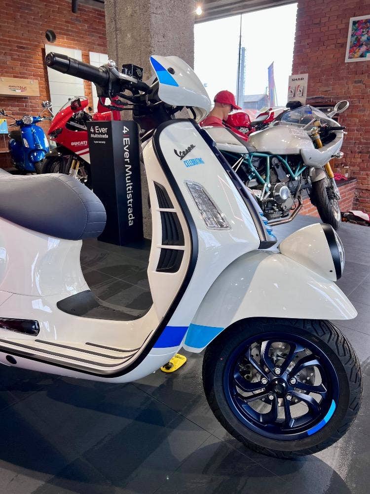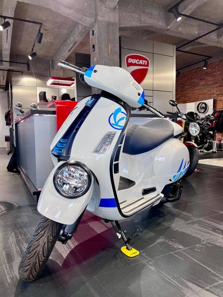 Speciální verze je také pozoruhodná svým poutavým modro-světle modrým barevným schématem na bílém pozadí, které samo o sobě odráží interní barvy skupiny Piaggio.