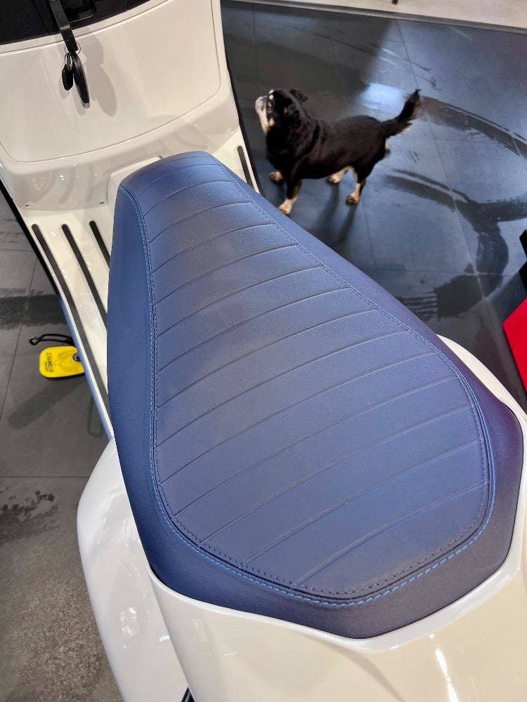 Dlouhé jednomístné sedlo je také modré s dvojitým prošíváním tón v tónu, zatímco ráfky kol mají modré vložky na světle modrých površích a jsou exkluzivní pro tento model.