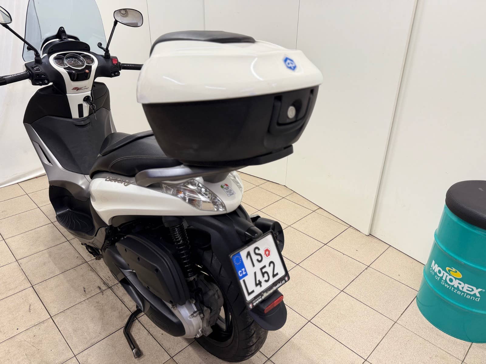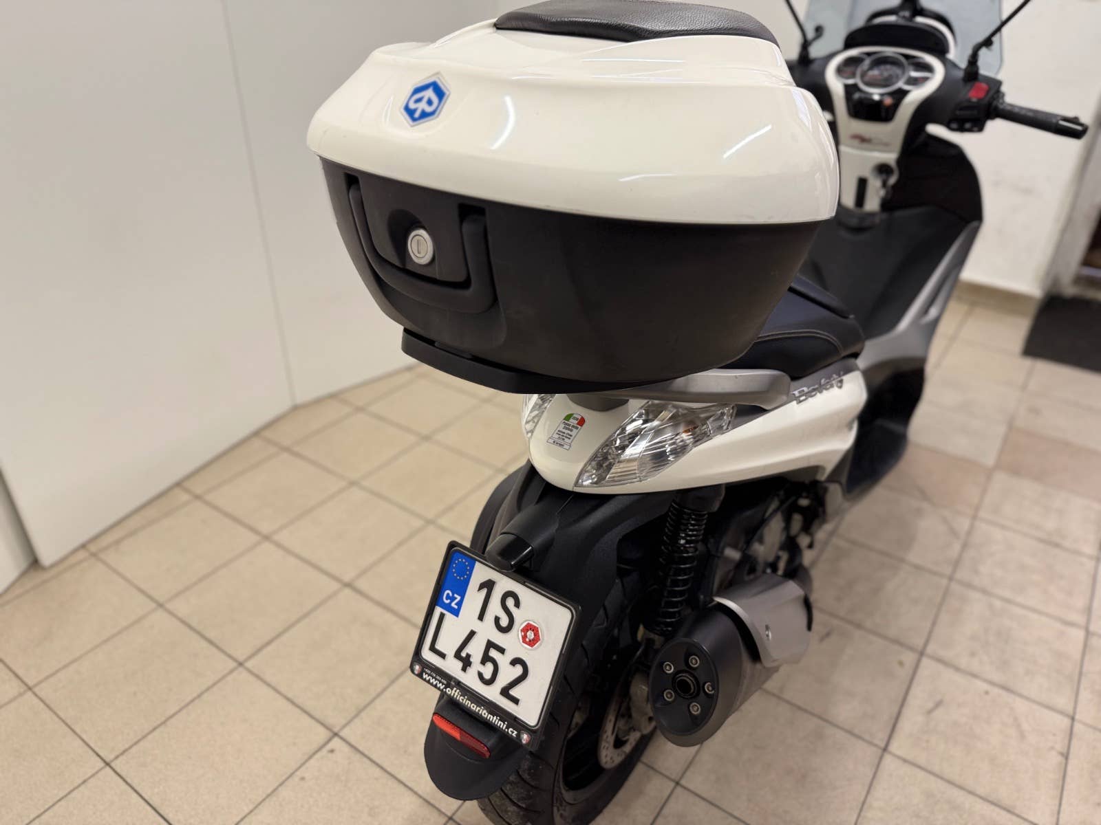 CENTRÁLNÍ STOJAN, PLEXI, DRŽÁK KUFRU + KUFR ORIGINÁL PIAGGIO, ZÁNOVNÍ