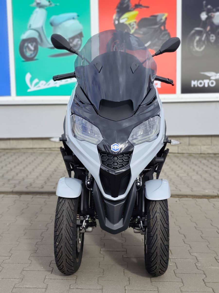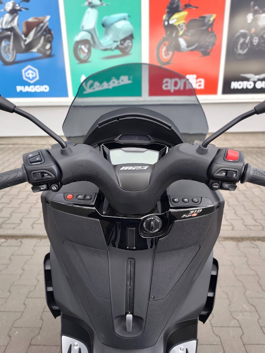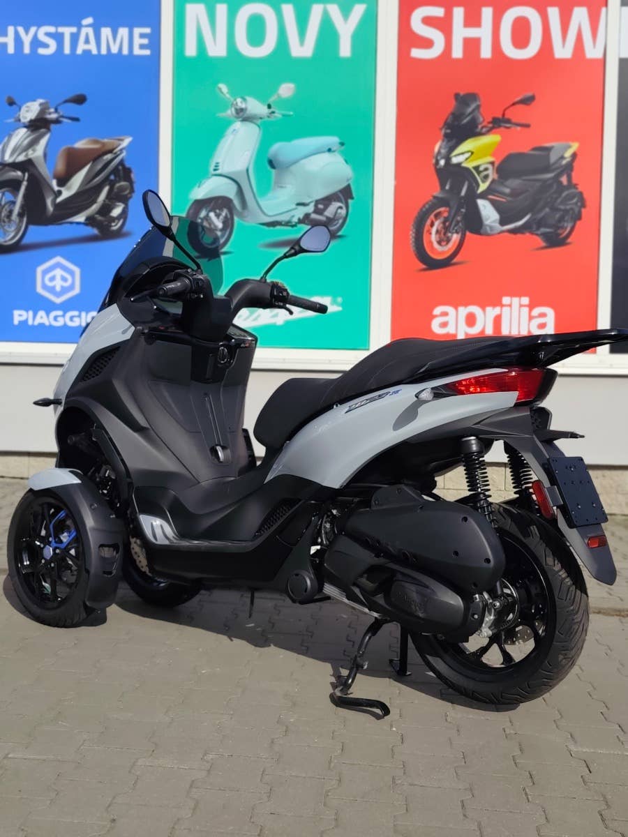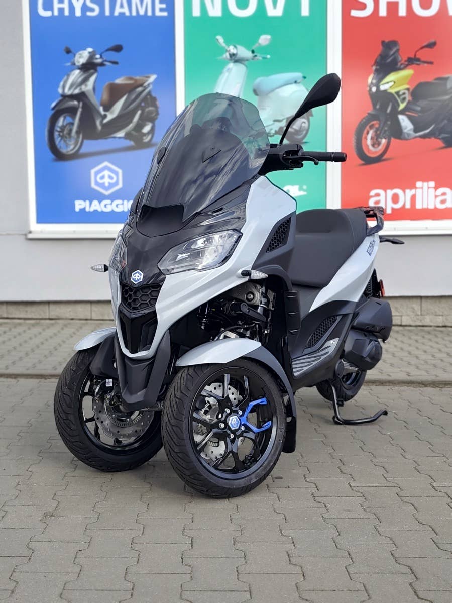 Piaggio MP3 310 Sport s moderní přední částí a barevnou paletou, která podtrhuje jeho elegantní design inspirovaný automobily, upoutá pozornost všude, kde se objeví. Sportovní vzhled dotvářejí detaily, jako je modré prošívání na sedle a nálepky na černých ráfcích předních kol. Ke sportovnímu stylu přispívá také kombinace matných a lesklých černých povrchů a prostor pro nohy s hliníkovou vložkou. Tato dokonalá kombinace elegance a agresivity, na které lze jezdit i s řidičským průkazem skupiny B, je určena pro jezdce, kteří hledají styl a výkon ve skútru, který je již nyní světovým unikátem.